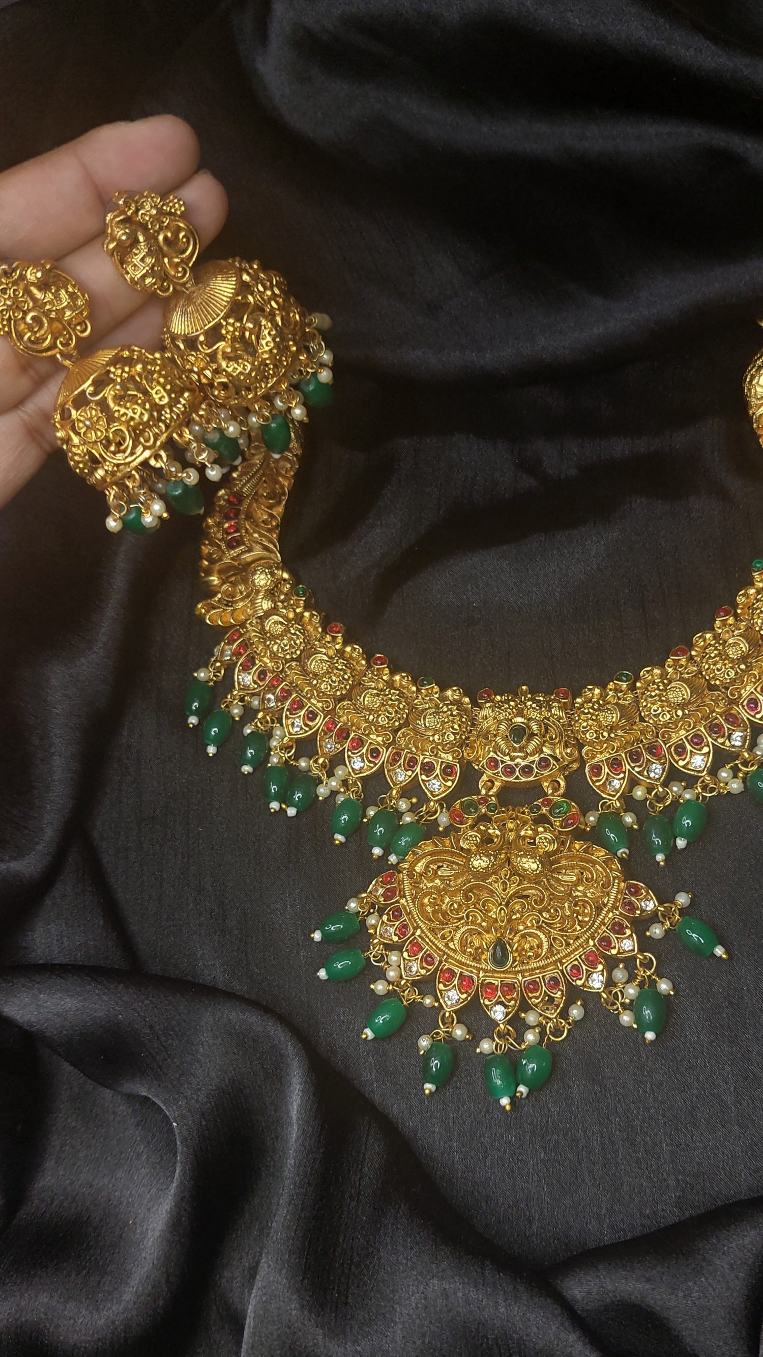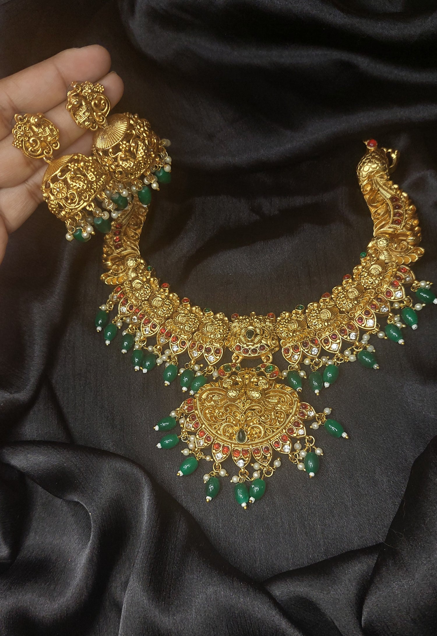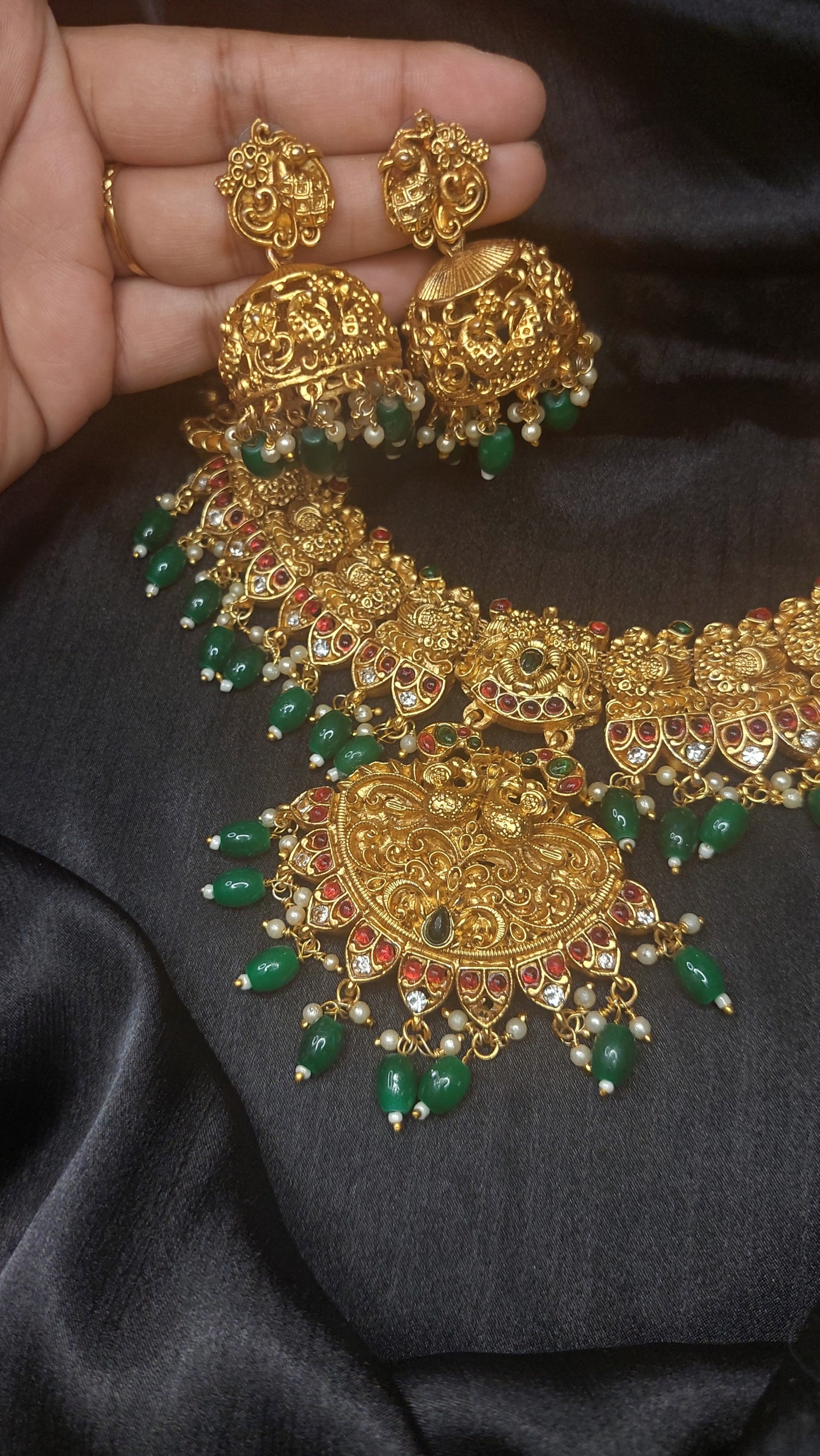 Matte gold finish short necklace with kemp stones and green beads. Comes as a set with matching jumkha style earrings.
