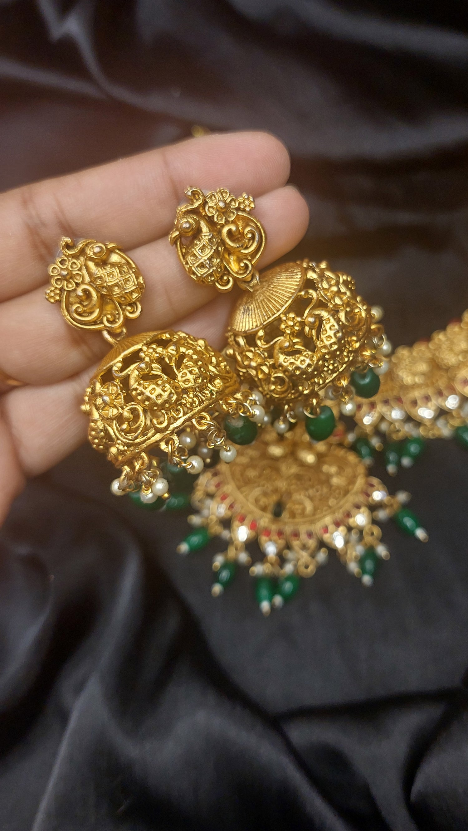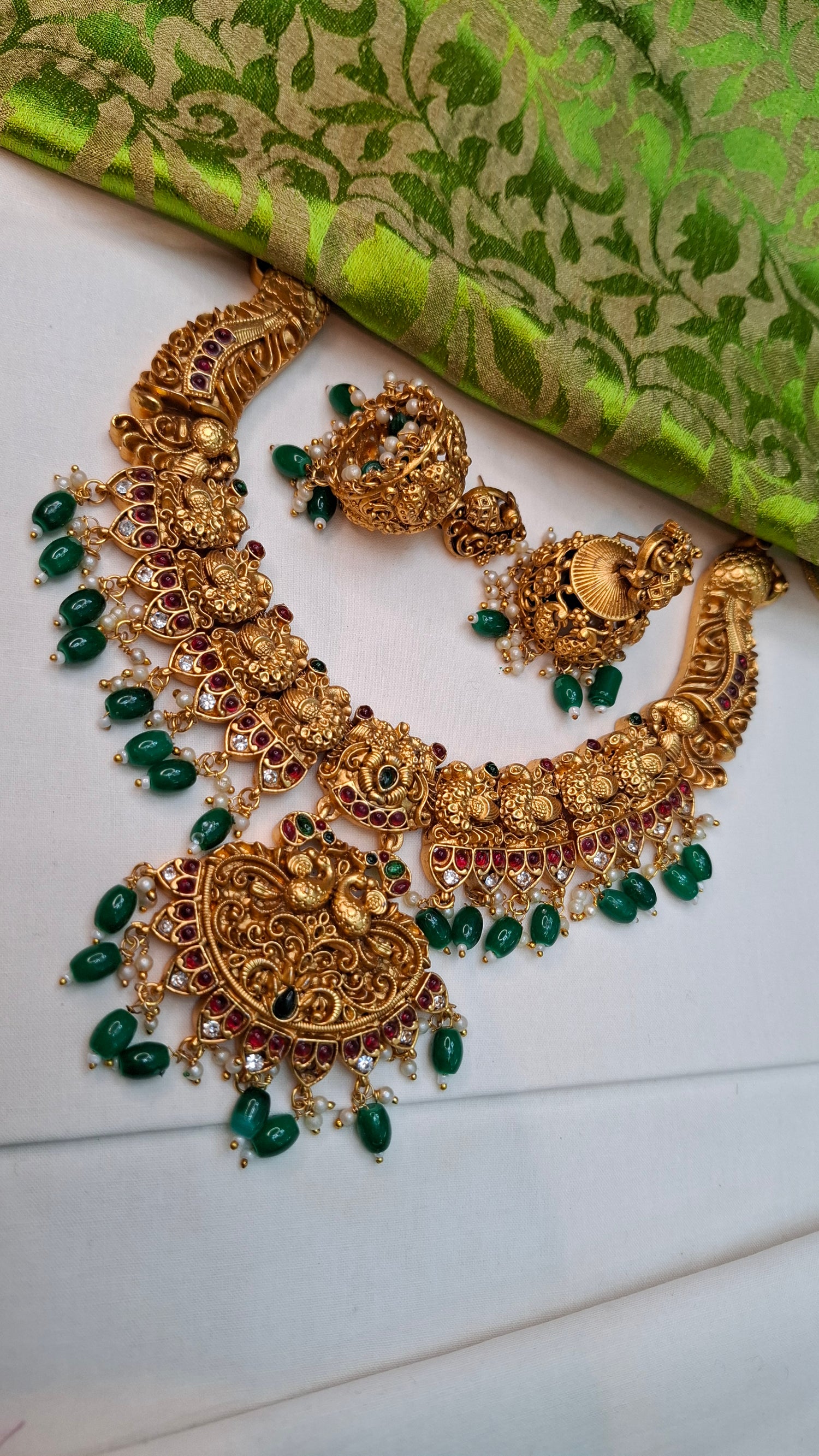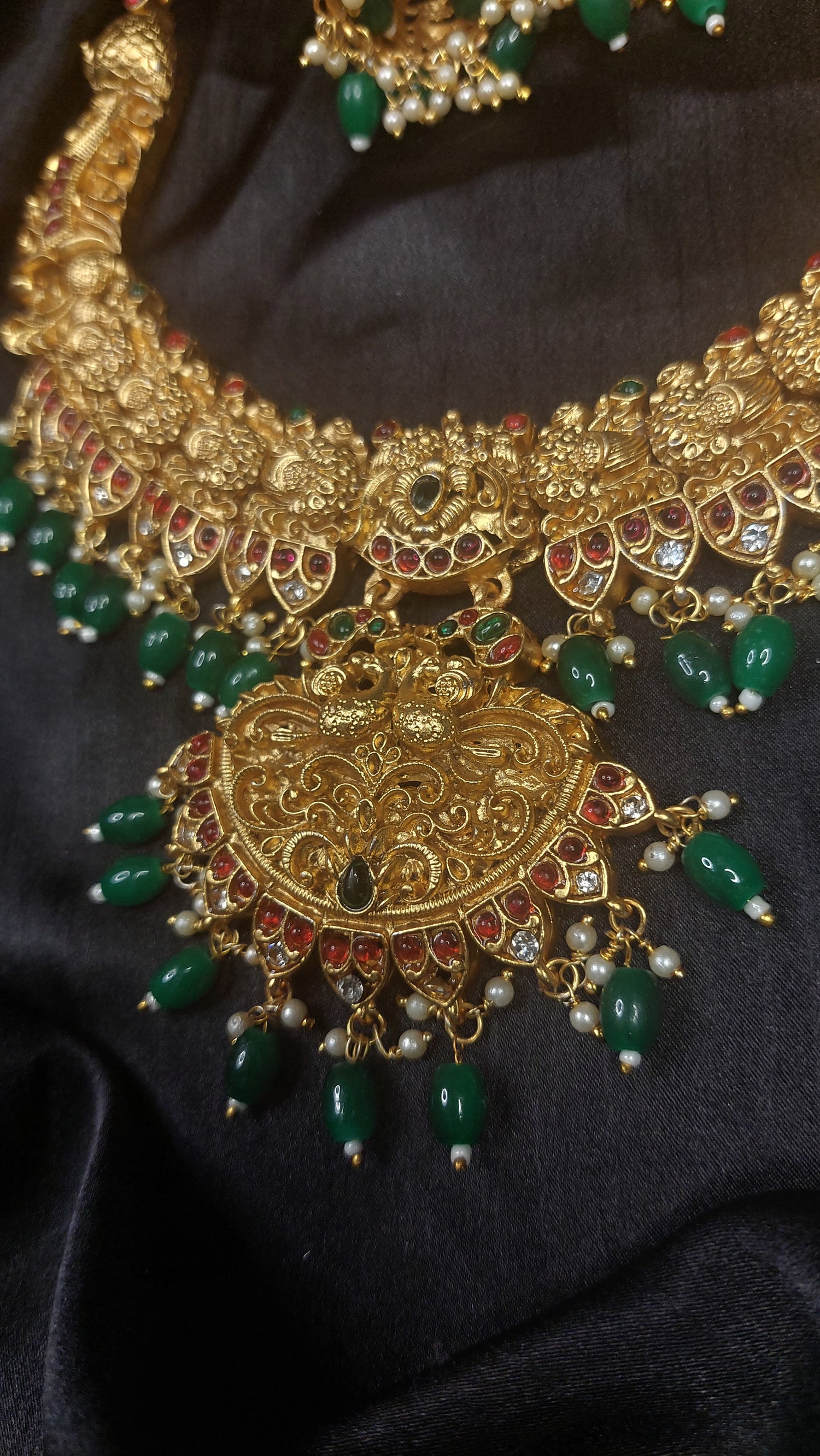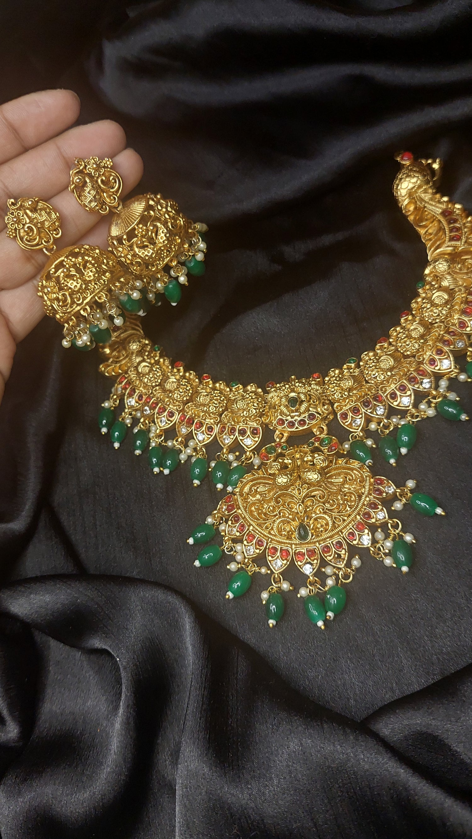 Matte gold finish short necklace with kemp stones and green beads. Comes as a set with matching jumkha style earrings.