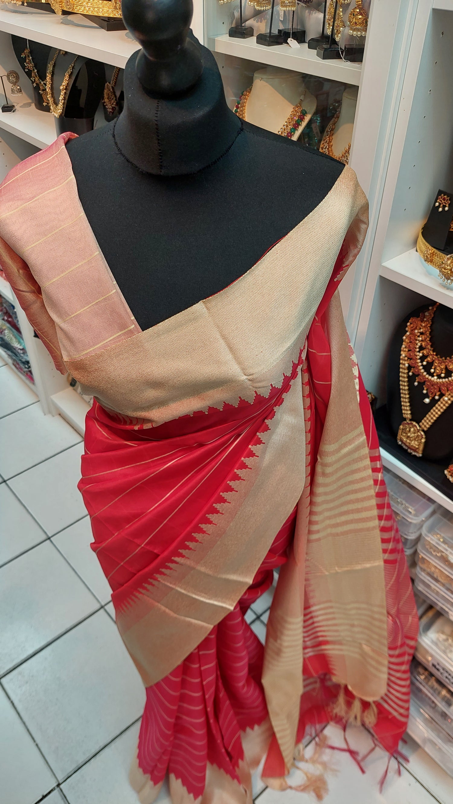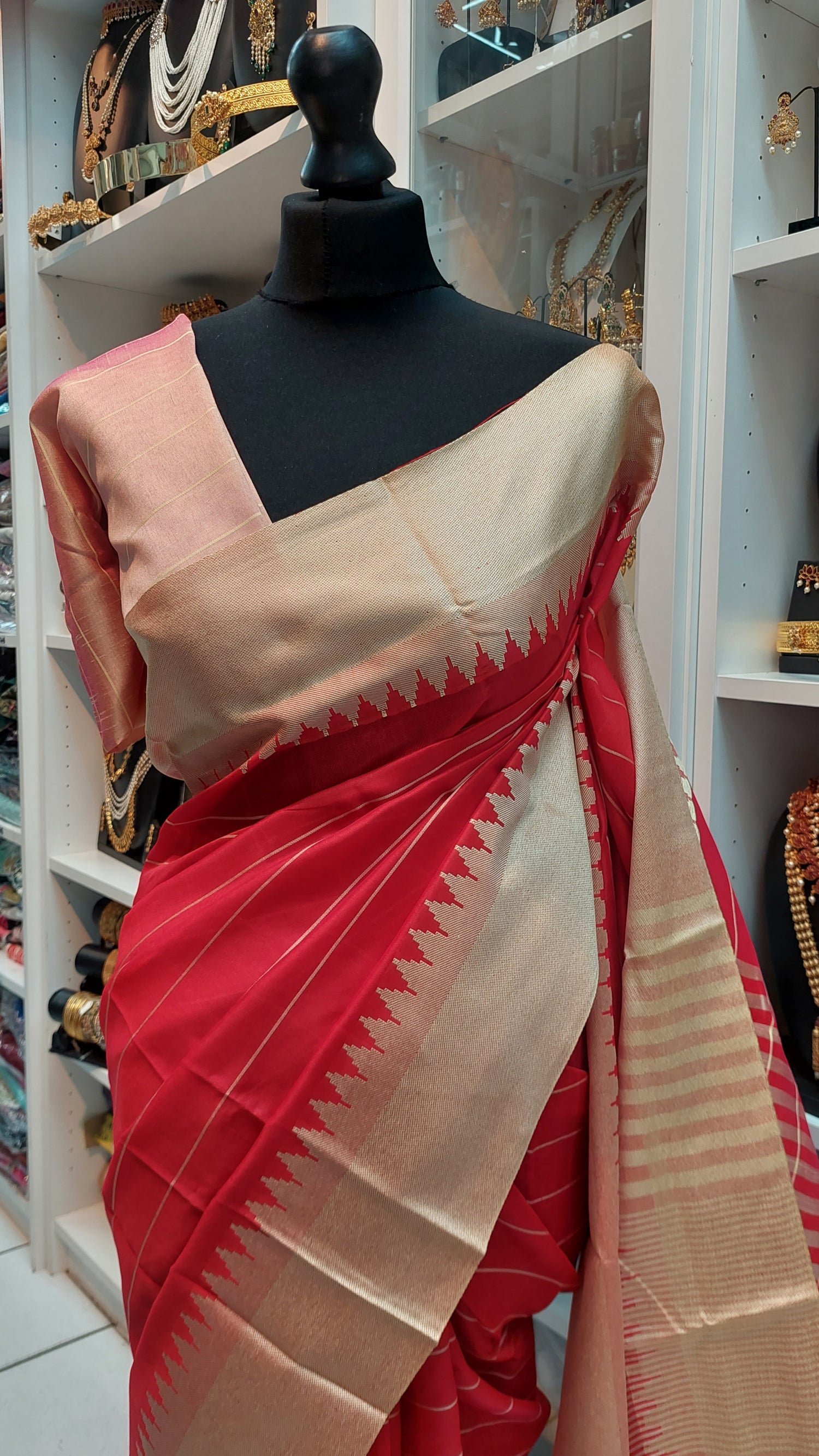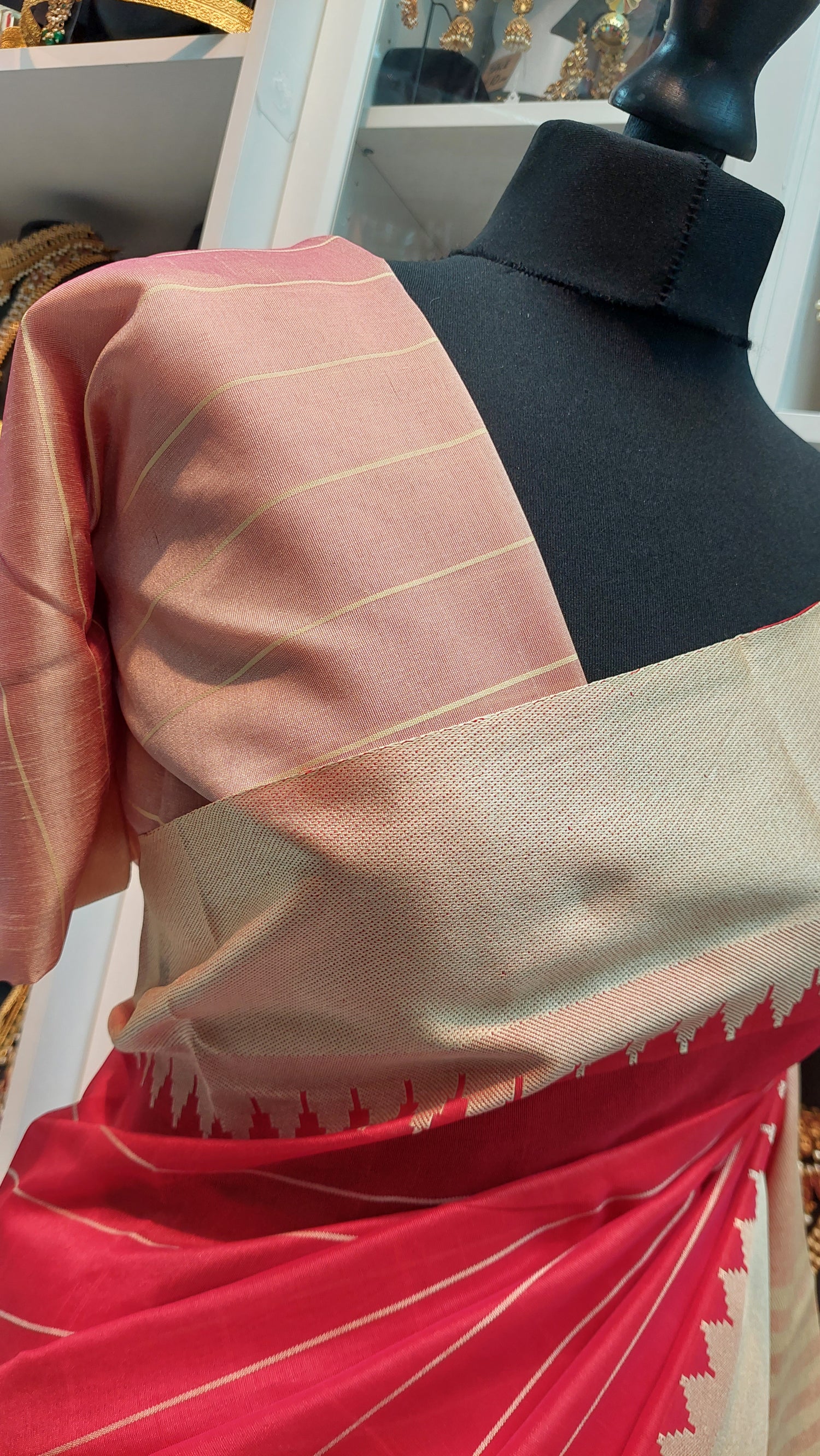 Red tissue cotton saree with temple gold border. Contrasting double tonne blush pink blouse piece.
