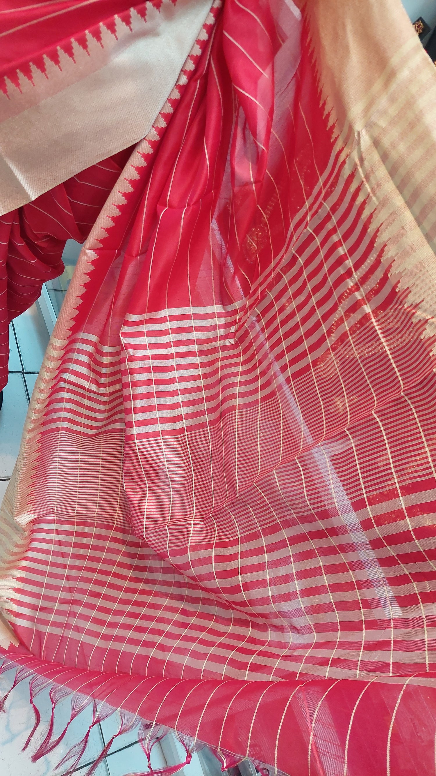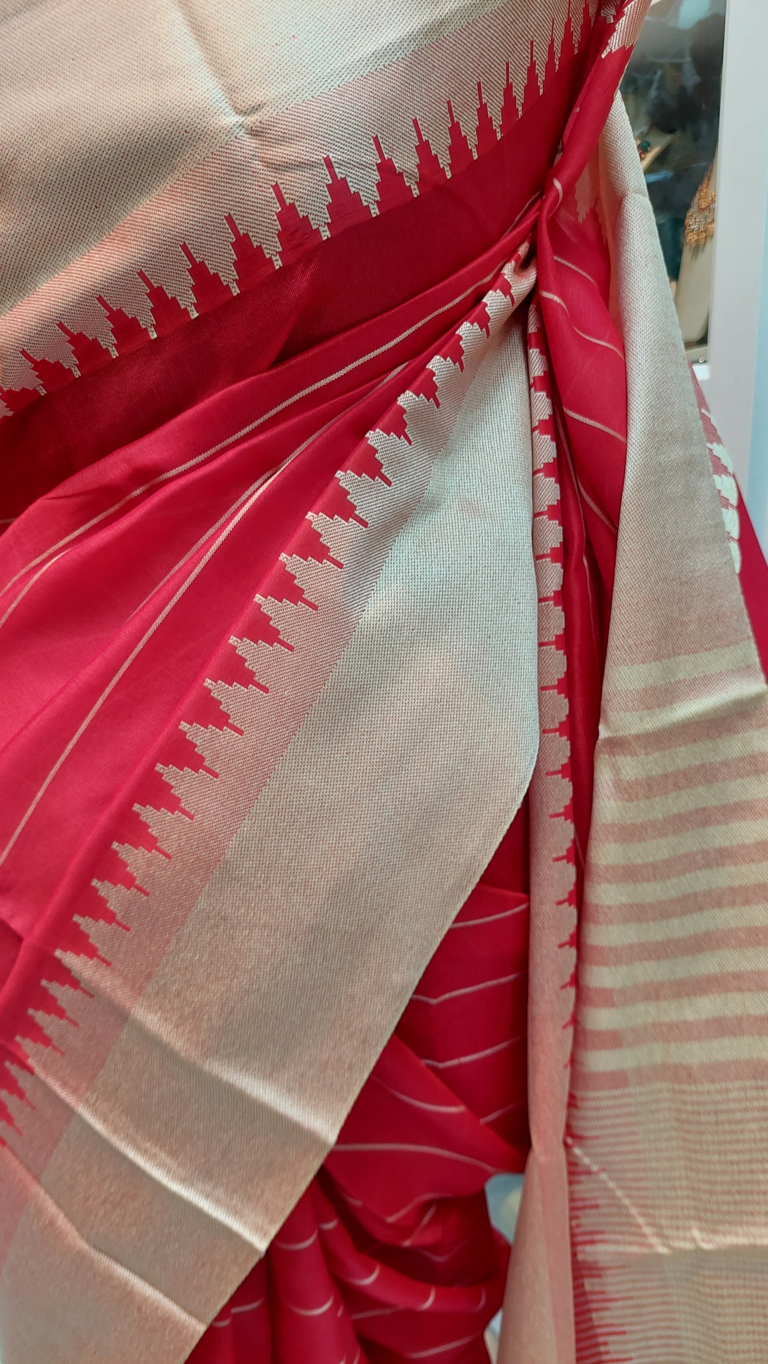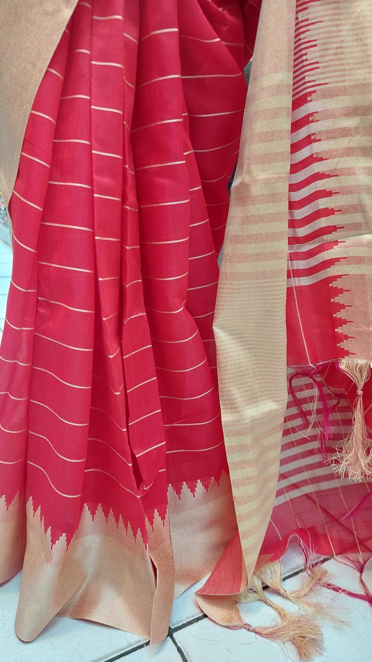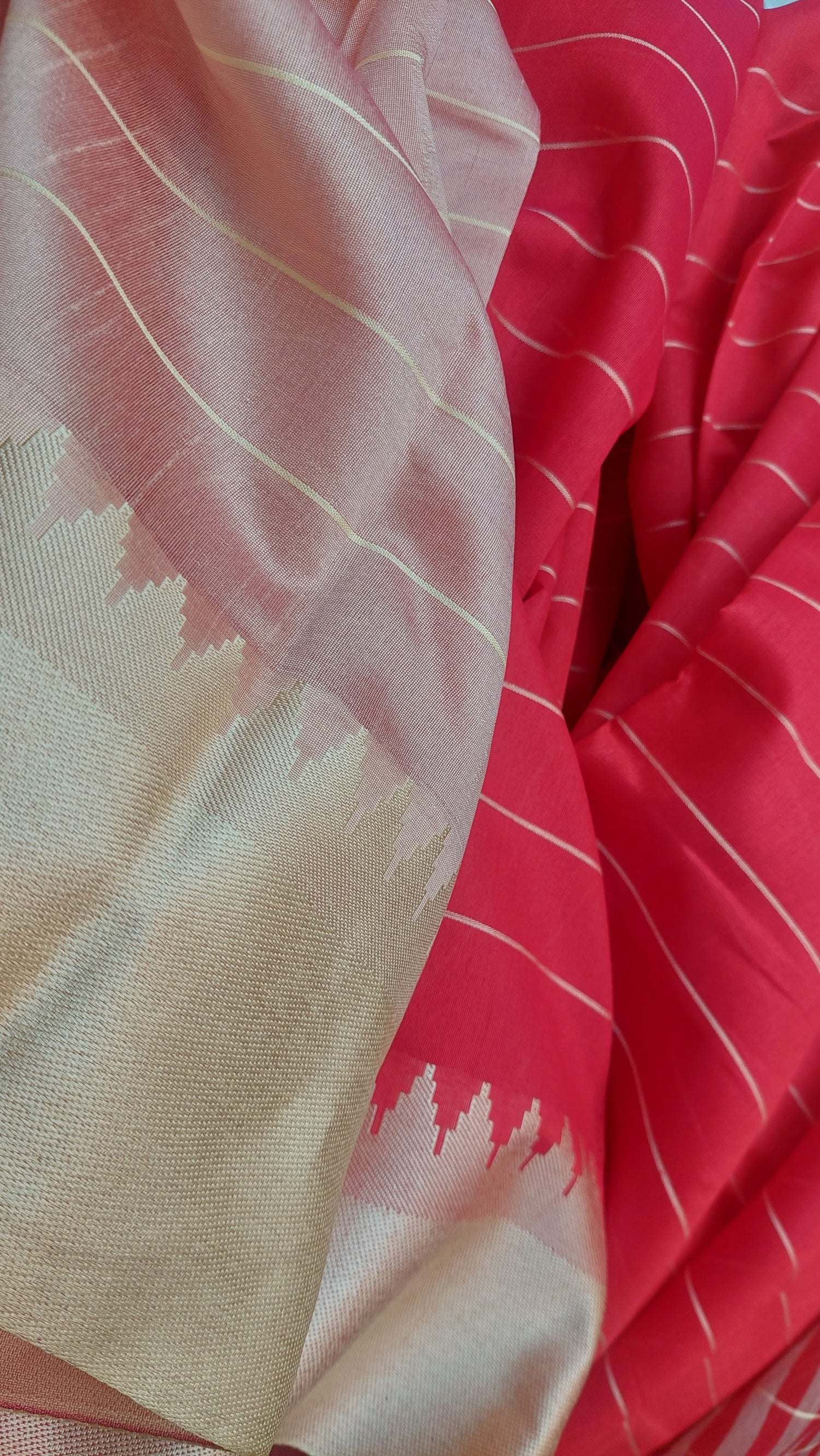 Red tissue cotton saree with temple gold border. Contrasting double tonne blush pink blouse piece.