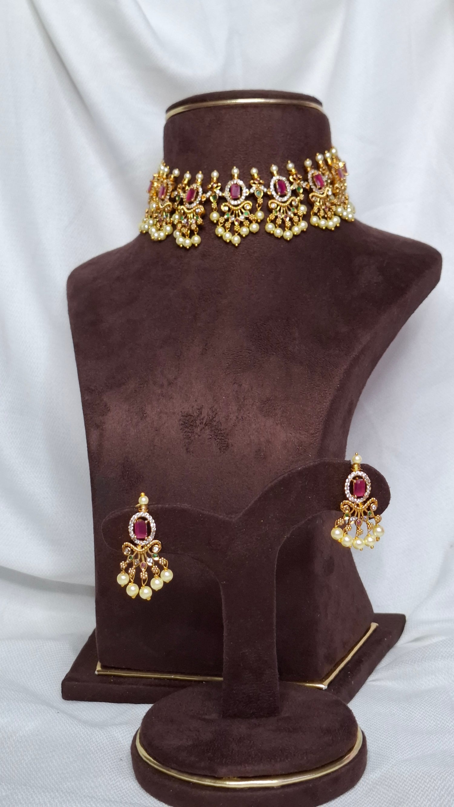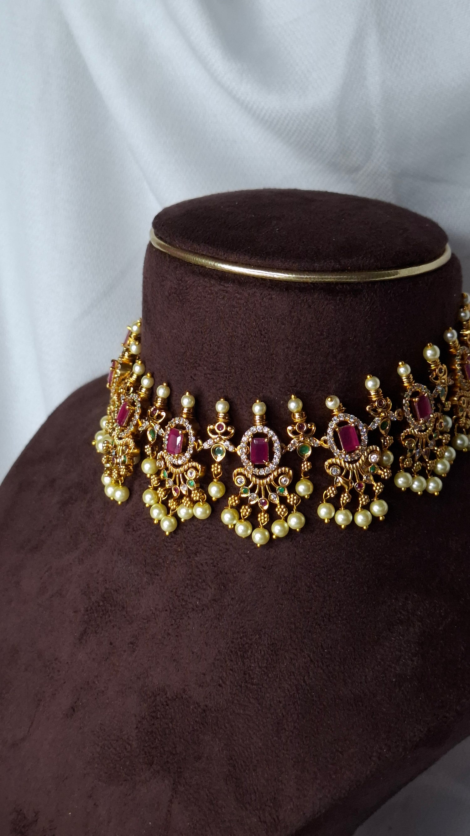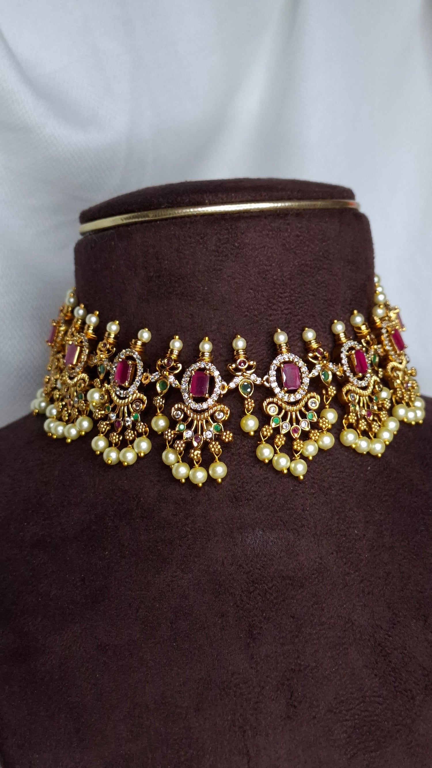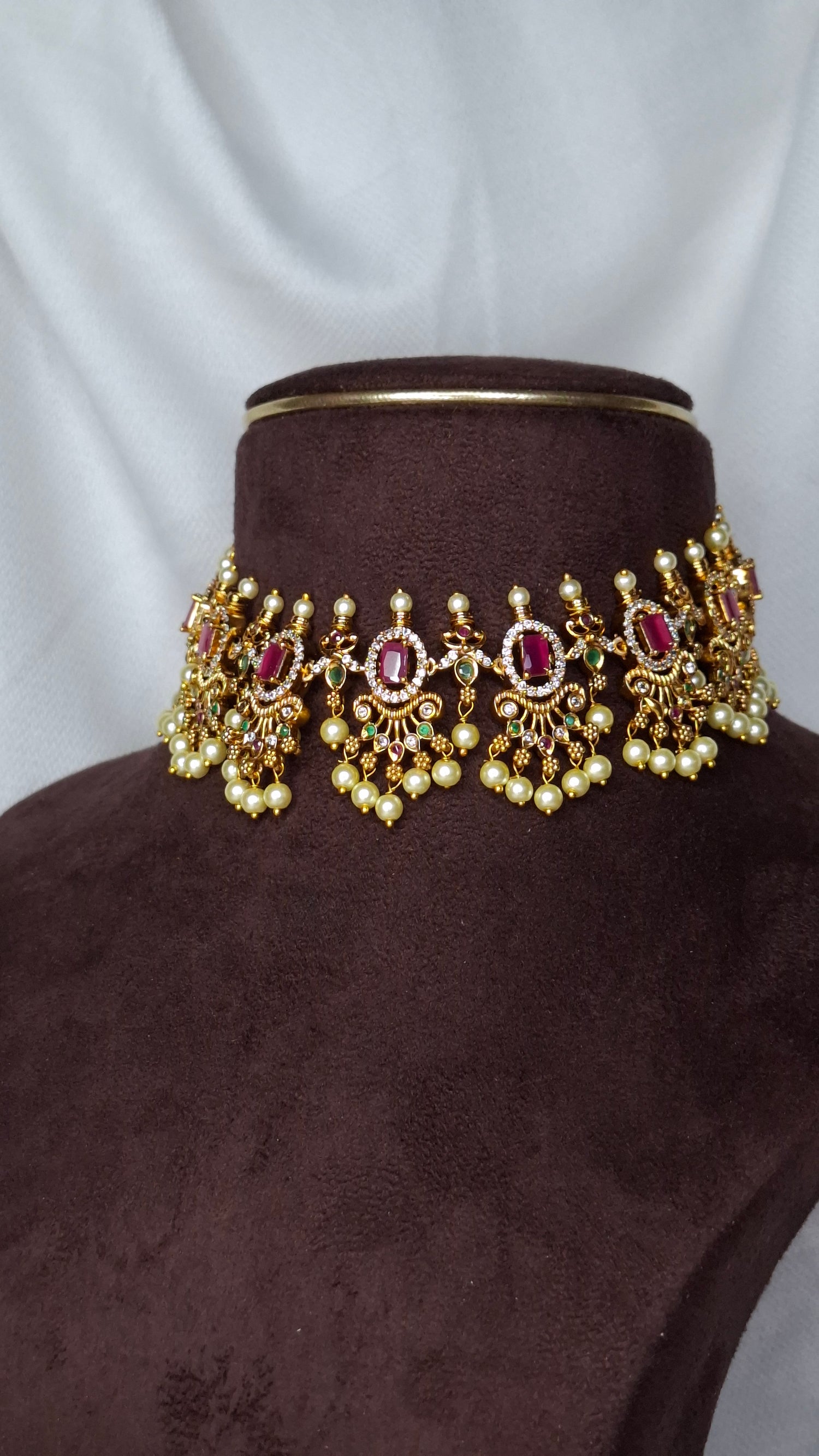 Antique gold matte finish short choker set that can also be worn as a short necklace. Comes witu matching earrings.