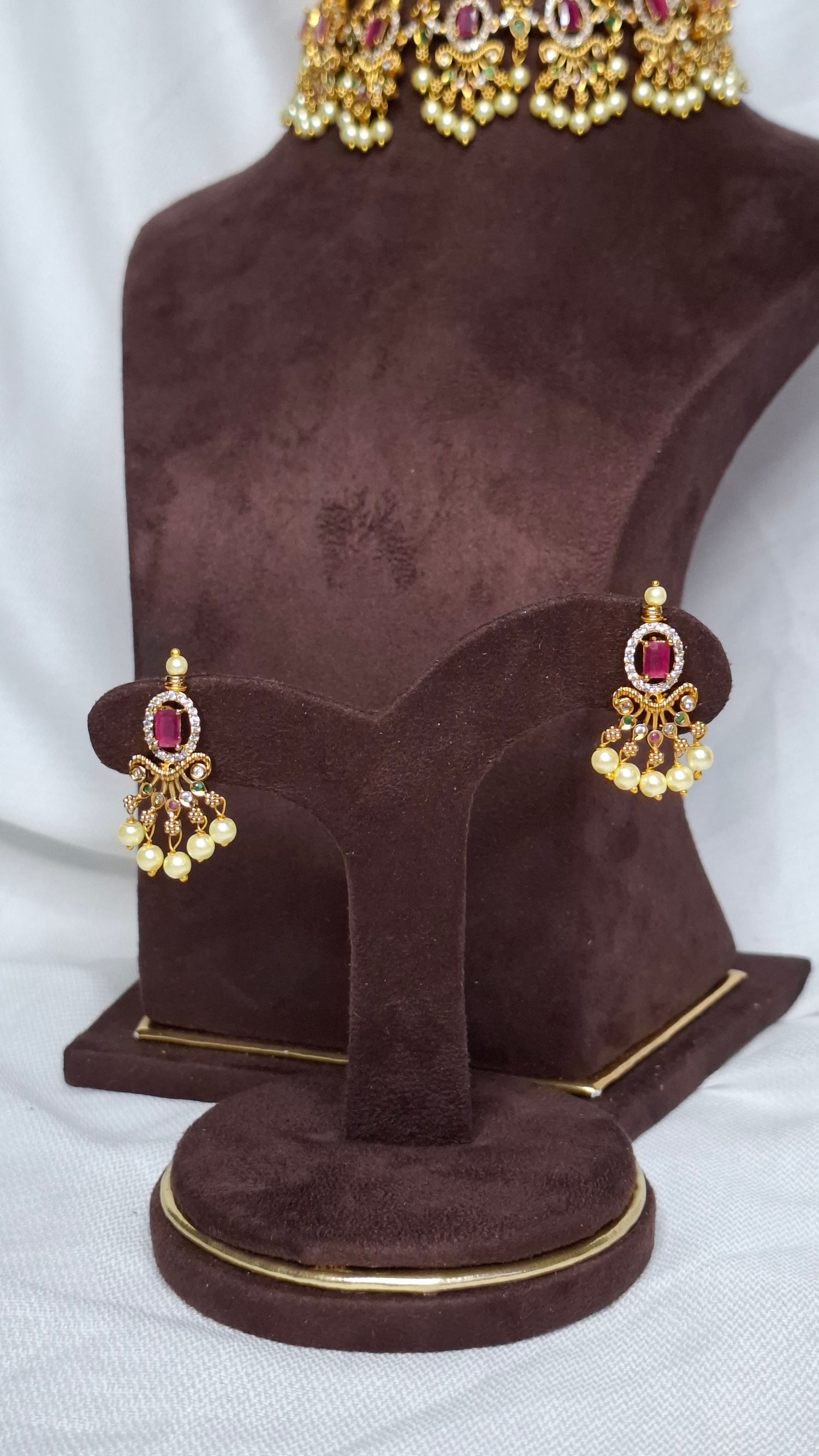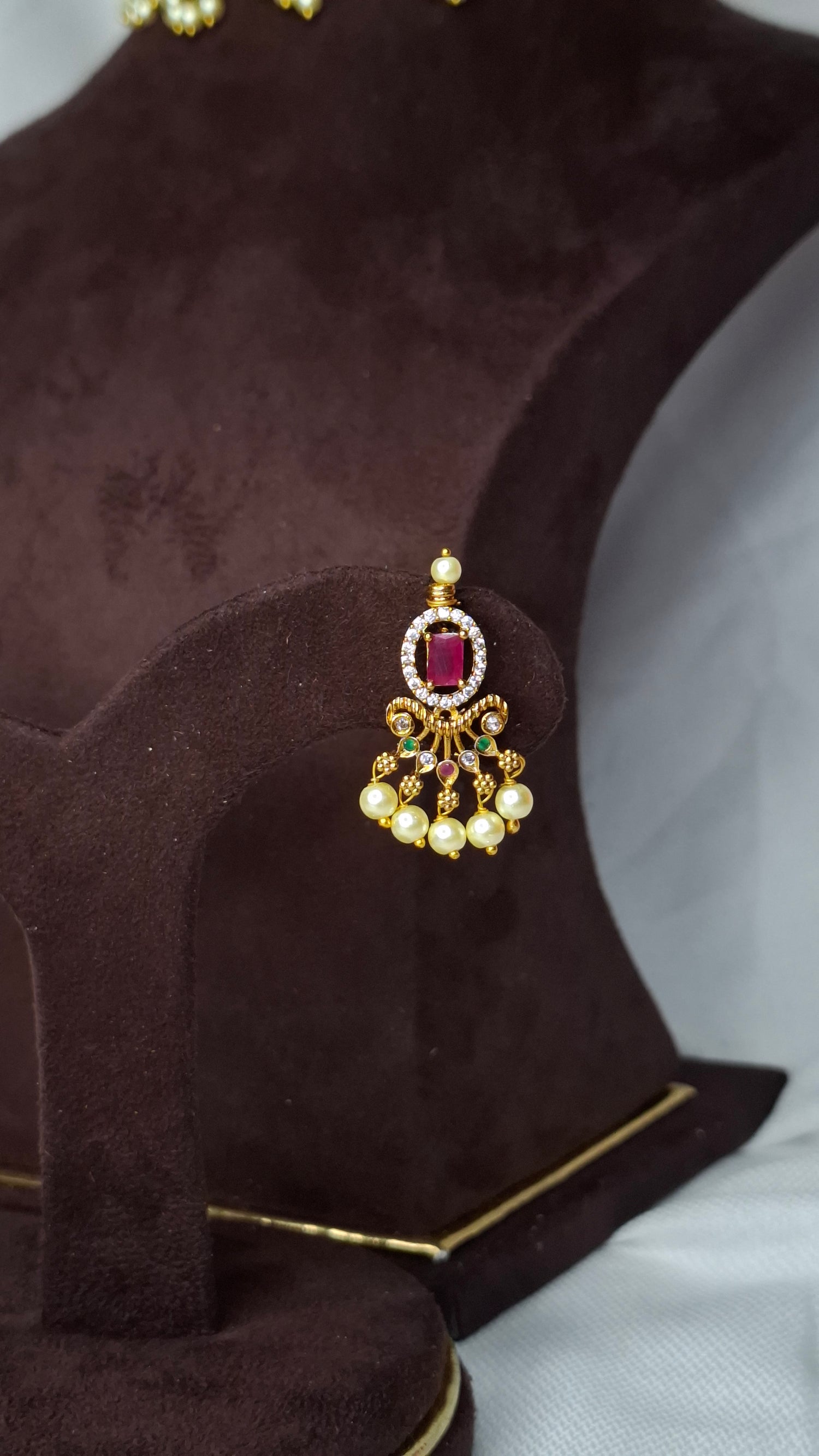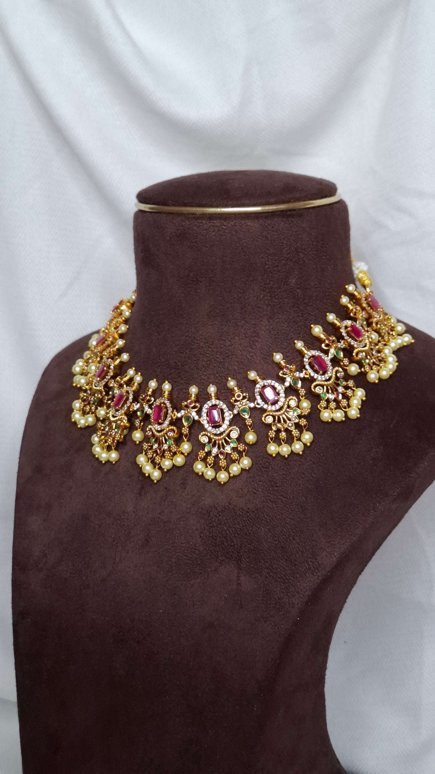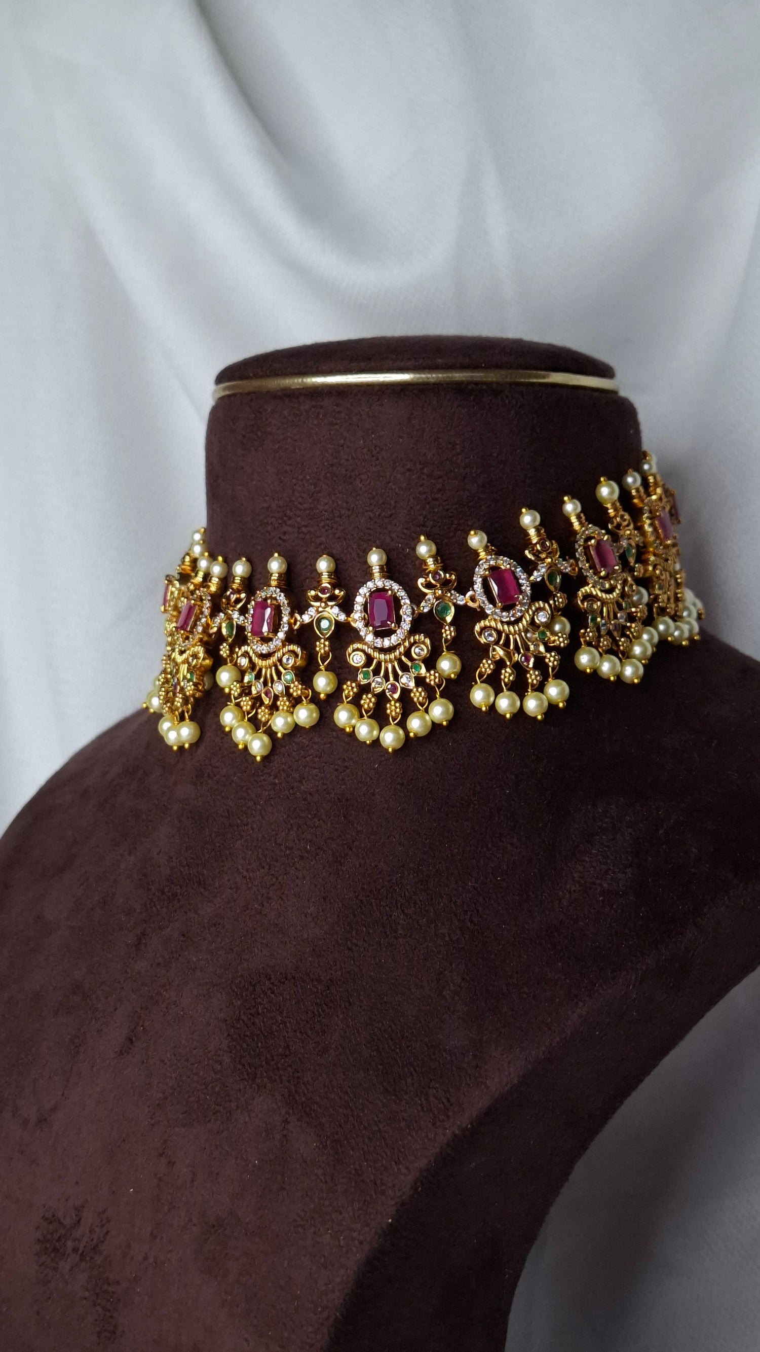 Antique gold matte finish short choker set that can also be worn as a short necklace. Comes witu matching earrings.