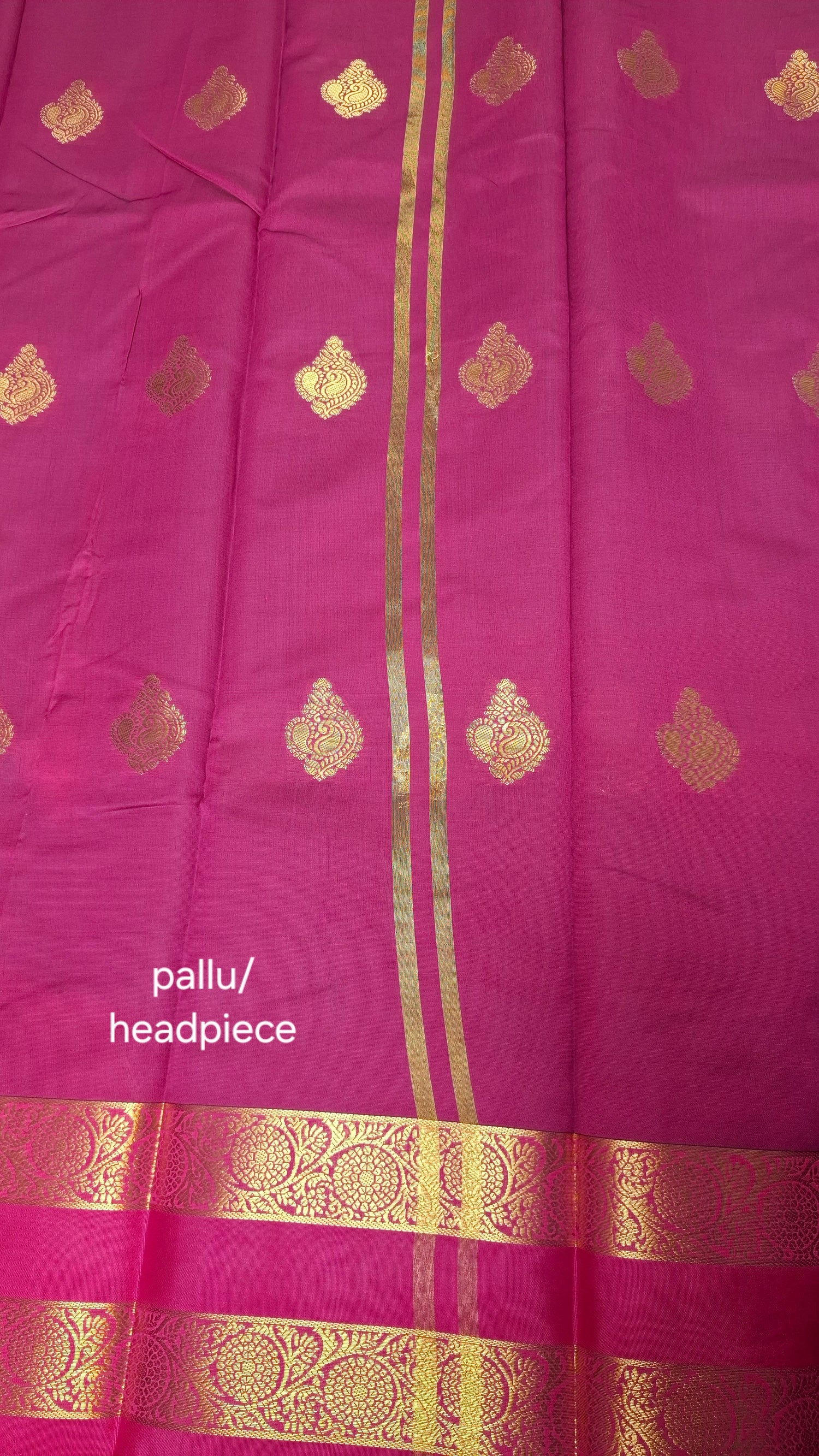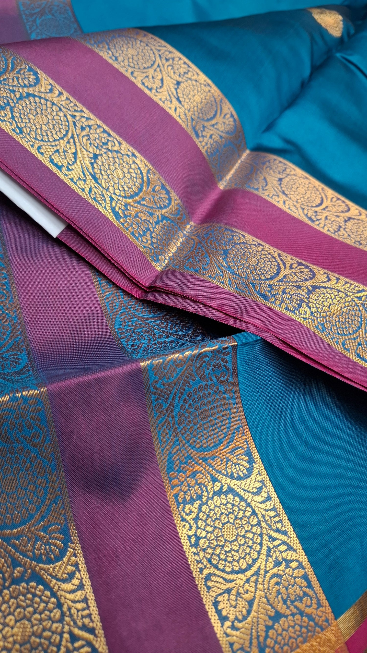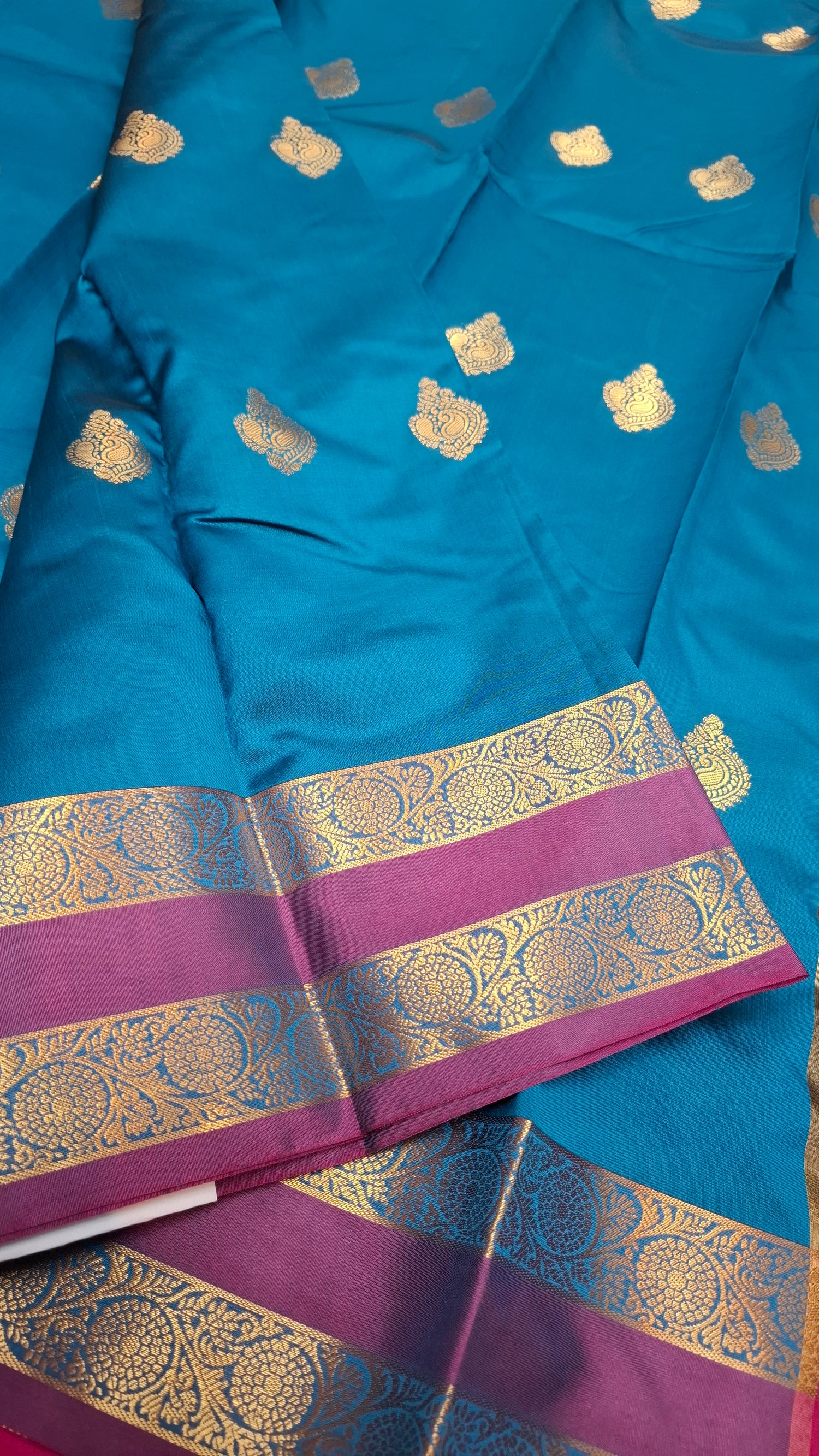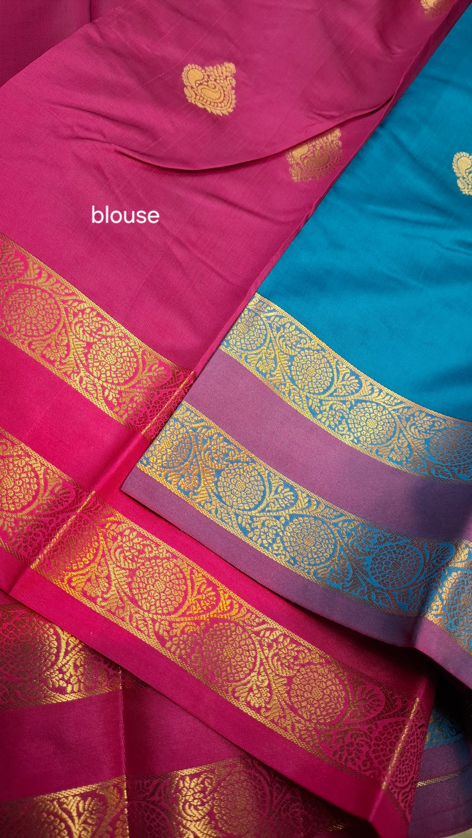 Blue kanji silk saree with double purple and gold zari border. Contrasting magenta pallu/ headpiece. Contrasting magenta running blouse.