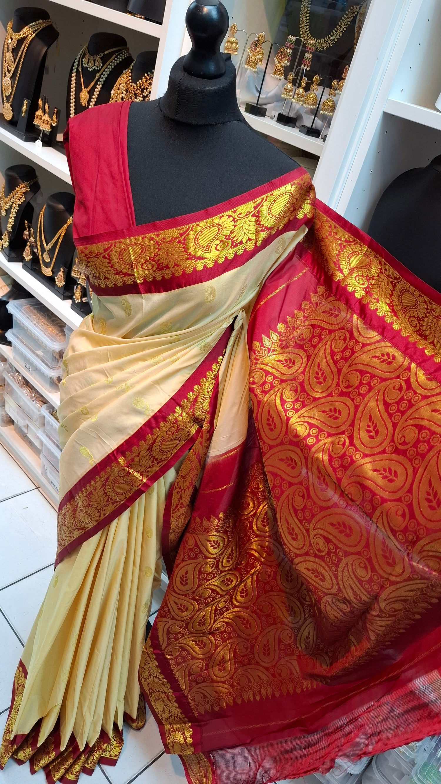 Cream Kanji silk saree with contrasting red & gold zari border. Contrasting plain red blouse piece with matching border. Red pallu/ headpiece with heavy gold zari.