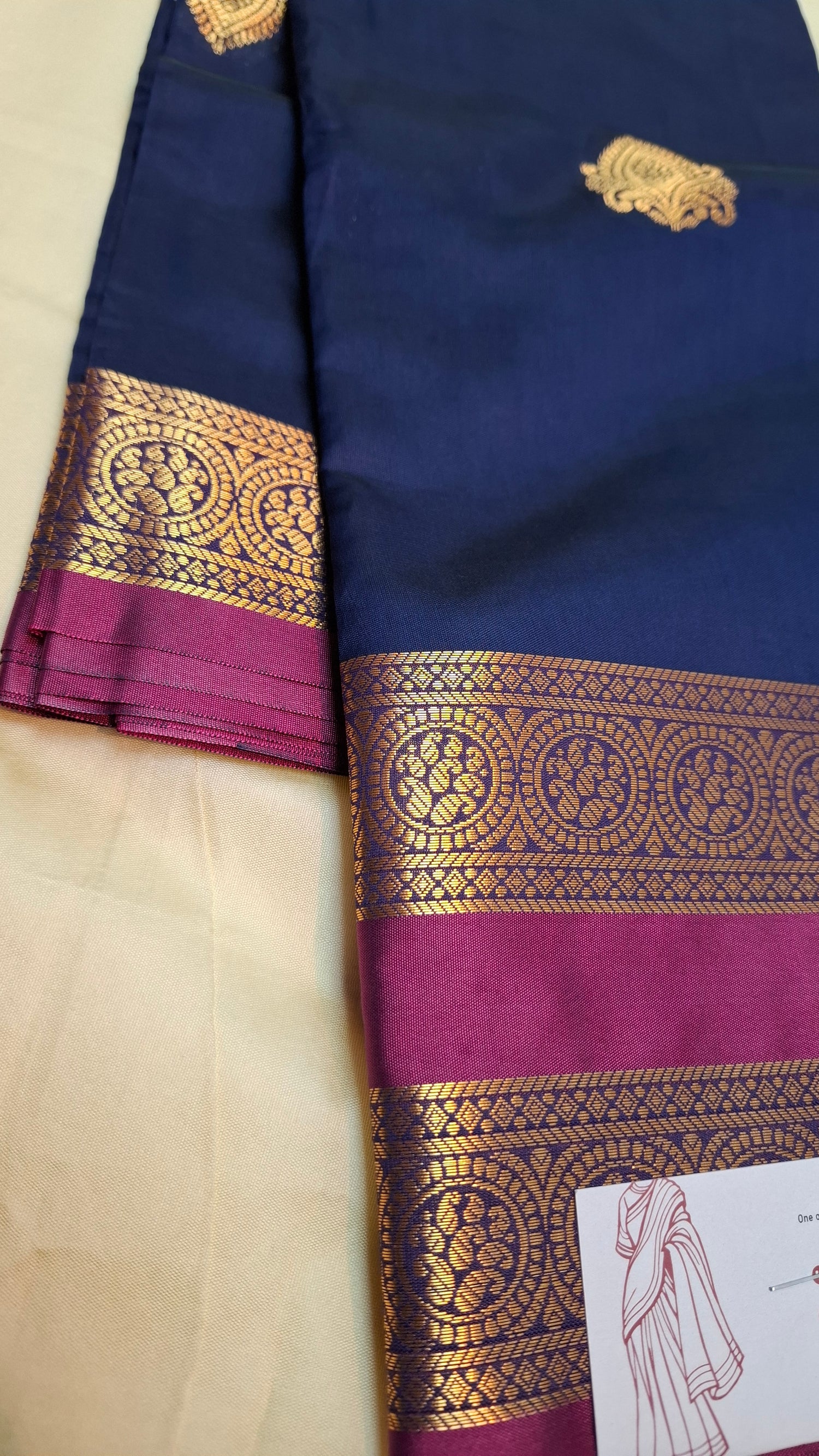 Navy blue kanji silk saree with double magenta and gold zari borde. Contrasting magenta pallu/ headpiece. Contrasting magenta running blouse.