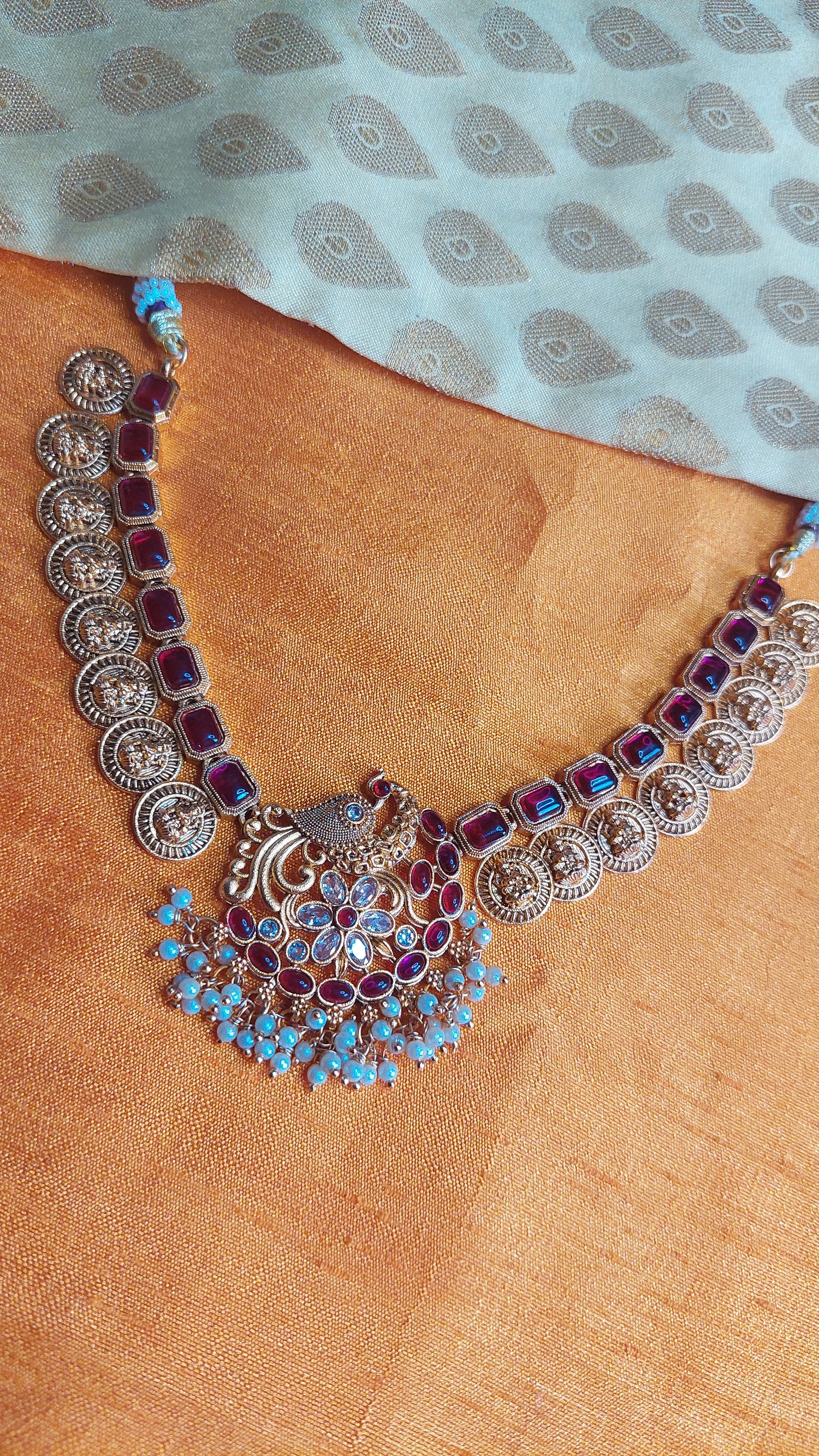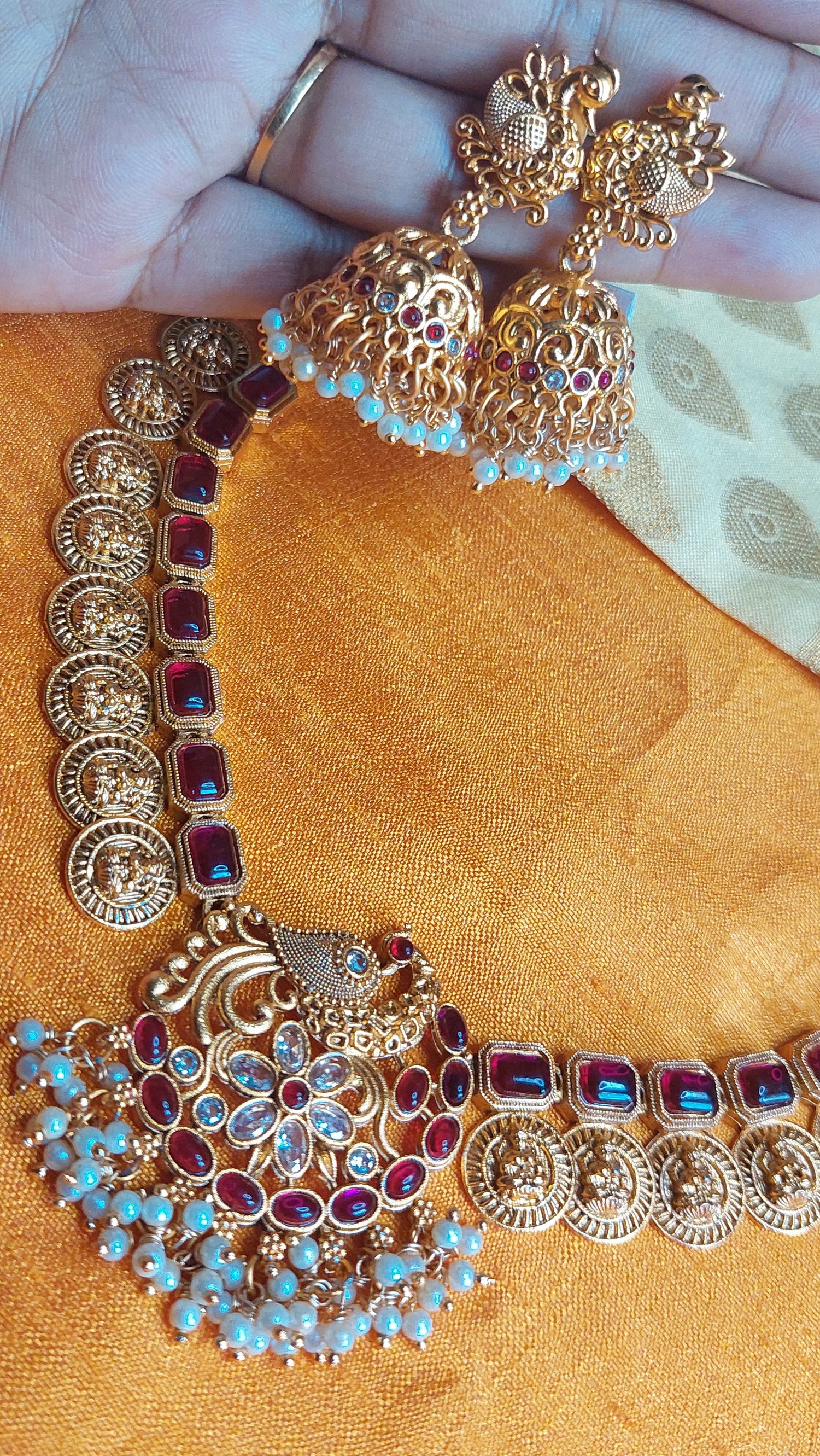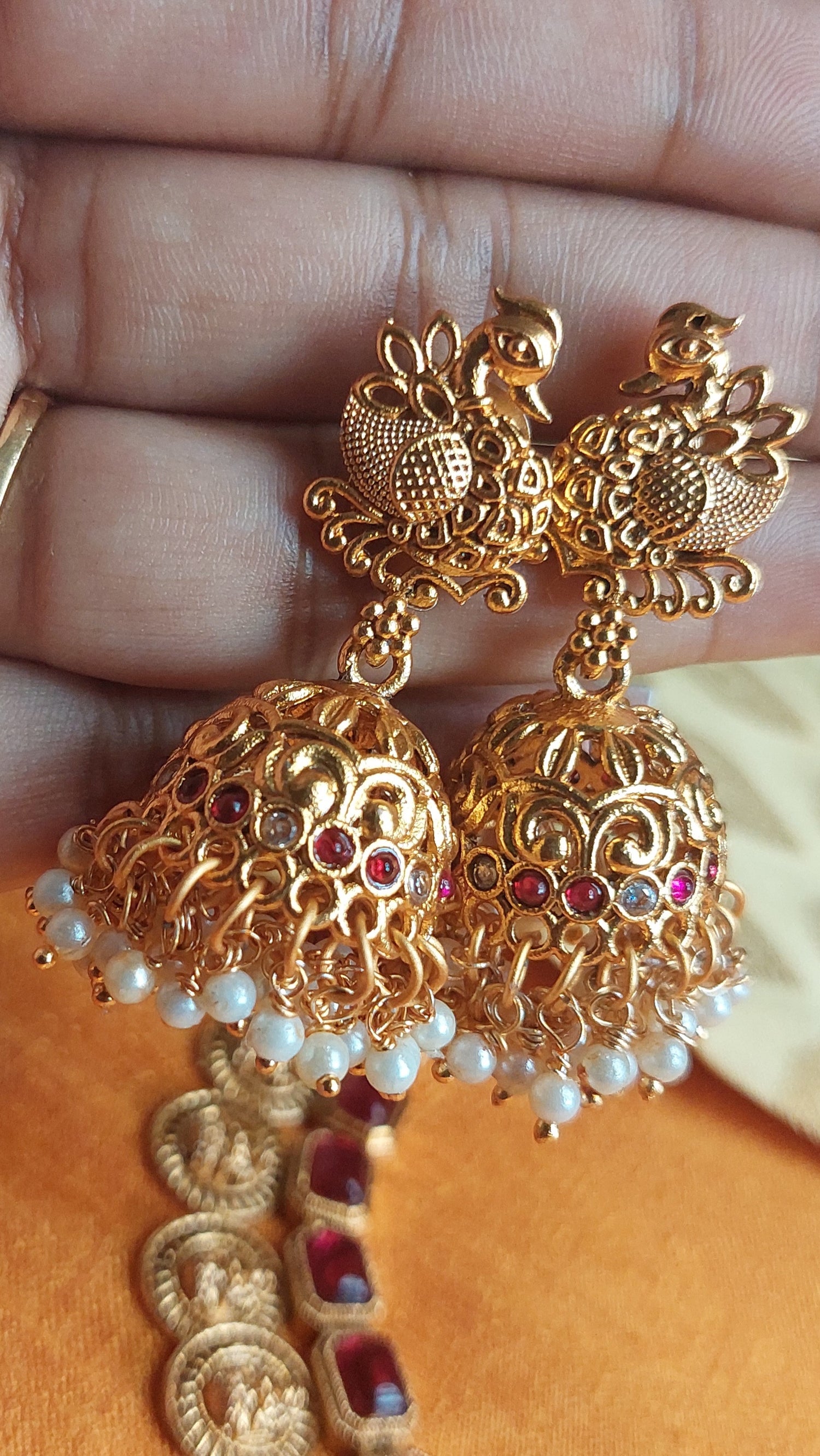 Matte finish gold temple short necklace with peacock inspired jumkha earrings.