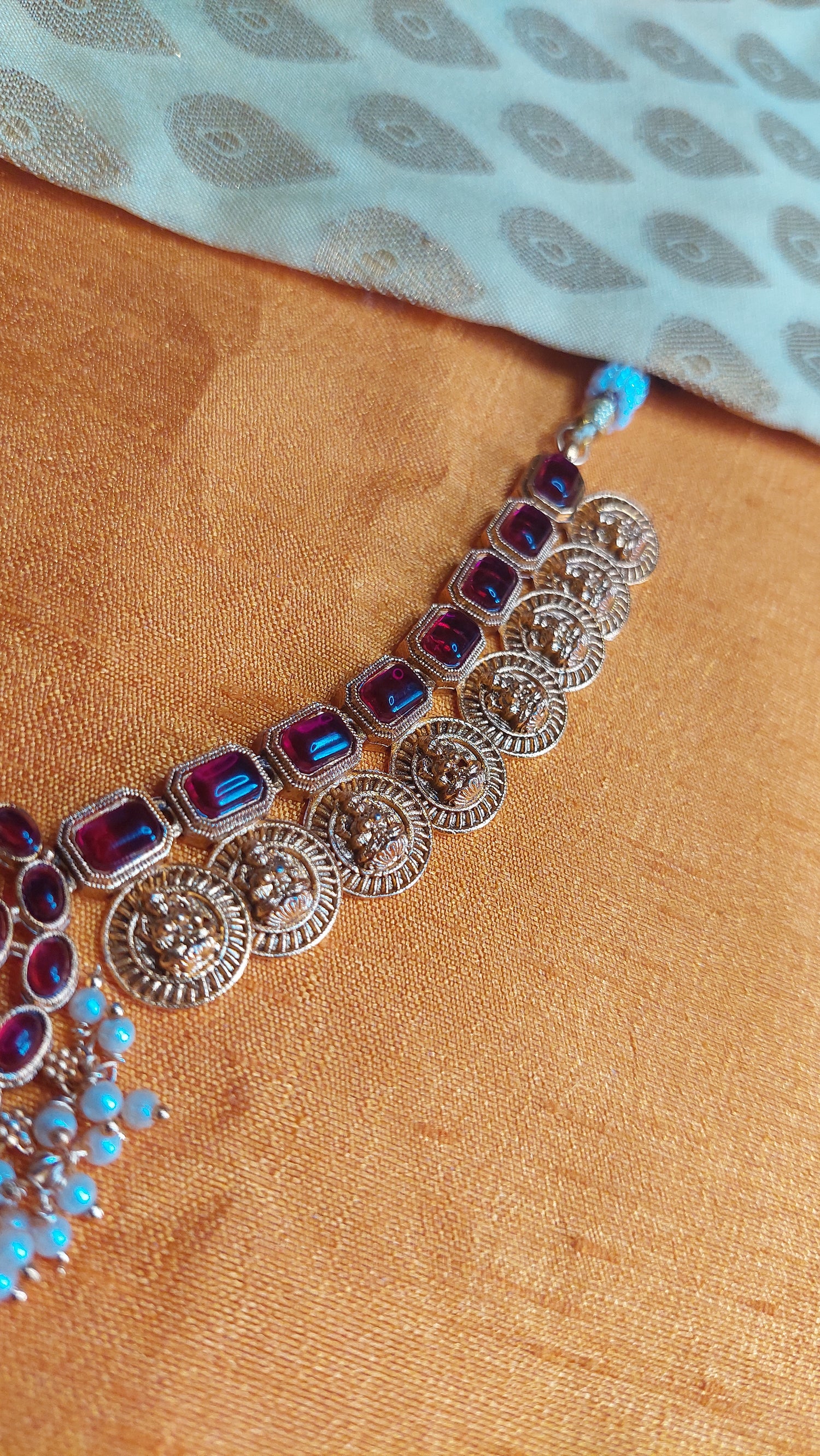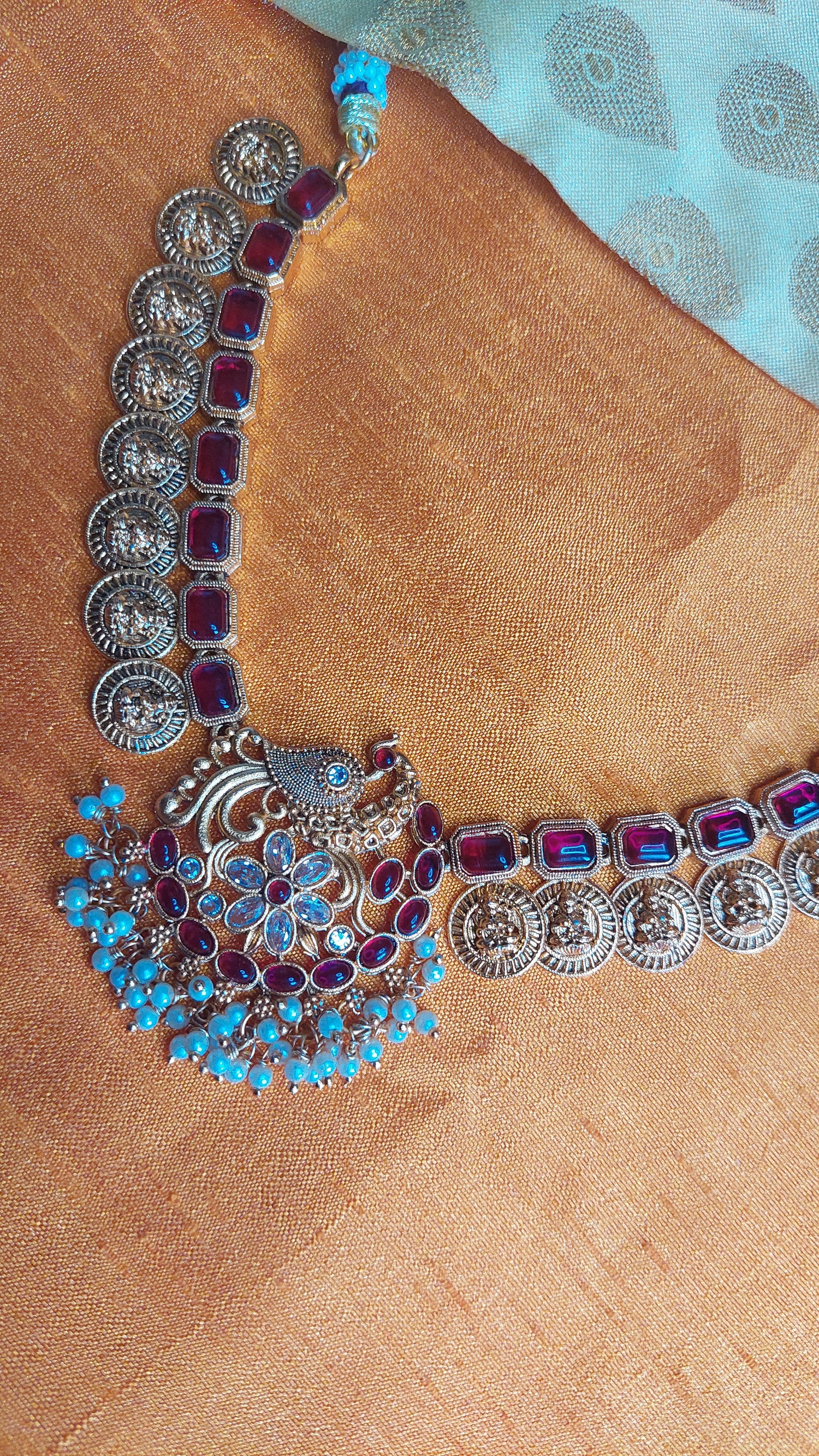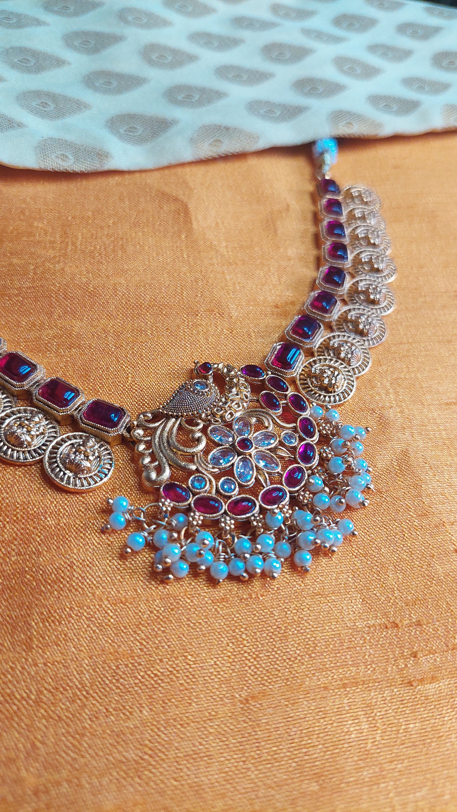 Matte finish gold temple short necklace with peacock inspired jumkha earrings.