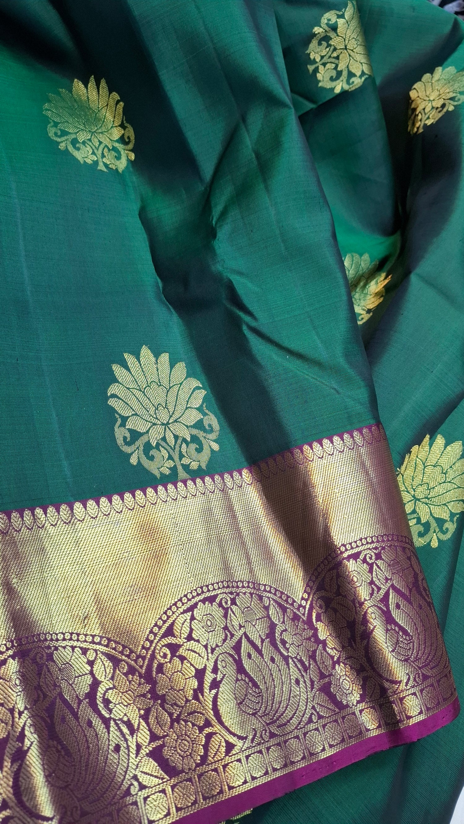 Bottle green & magenta pure Kanjipuram silk saree. Gold zari border. Contrasting magenta headpiece/ pallu. Plain magenta running blouse piece with gold zari border.