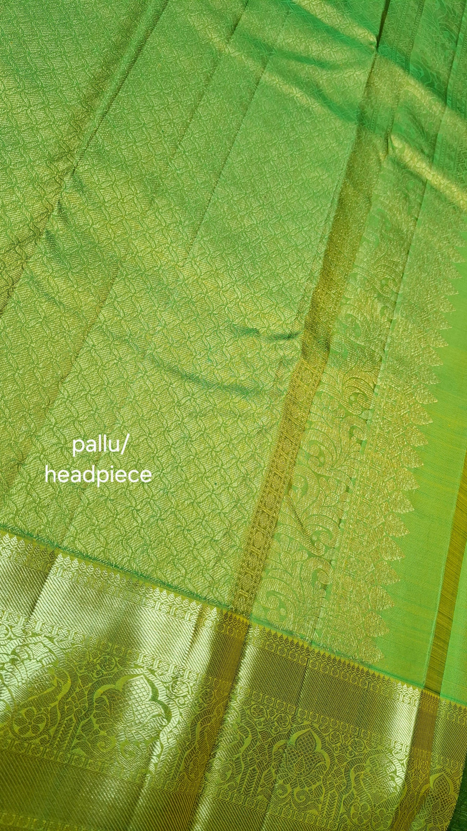 Pure Kanjipuram silk saree in parrot green woth gold zari border. Heavy gold zari work pallu/ headpiece. Plain running blouse with matching border.