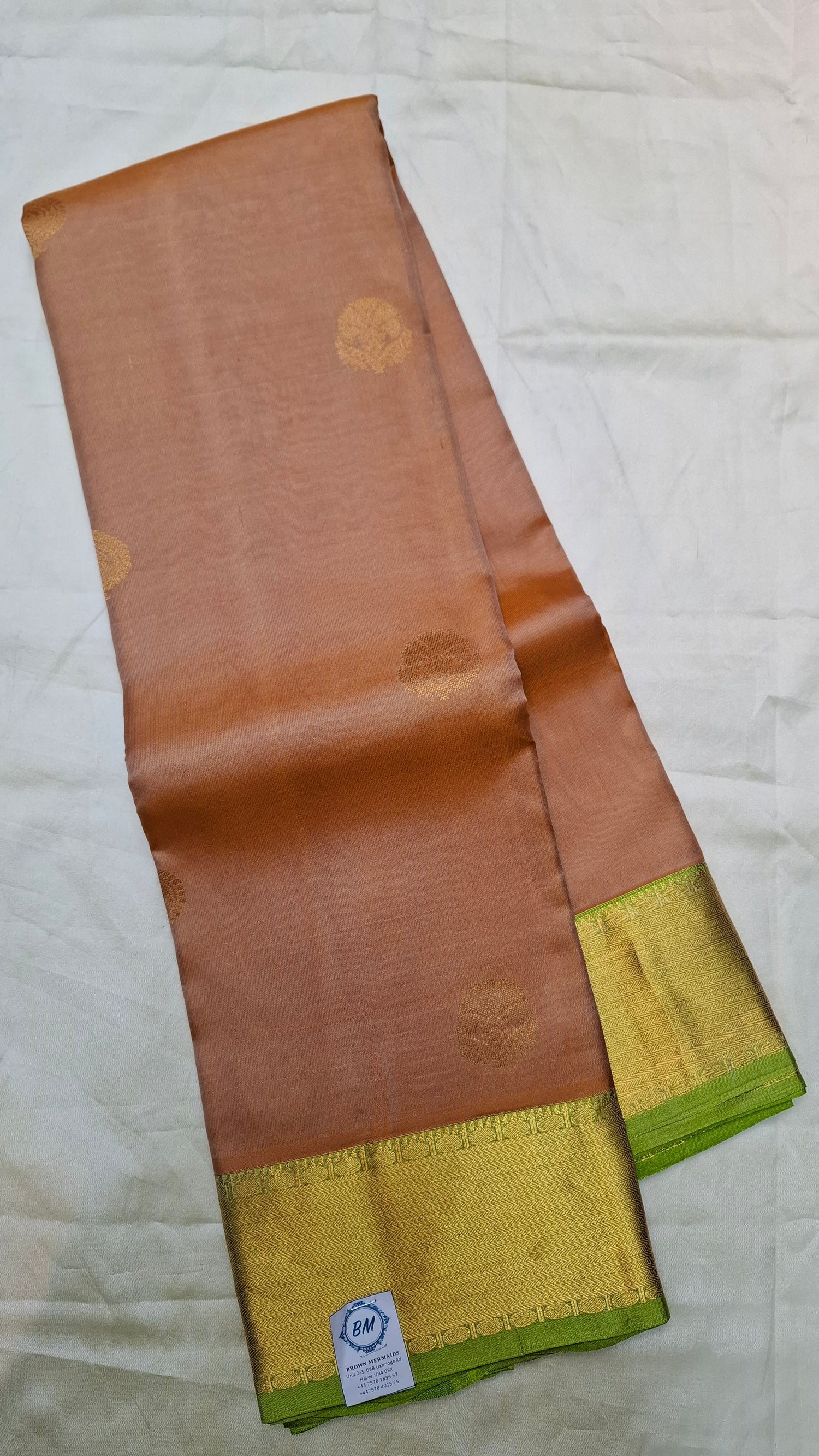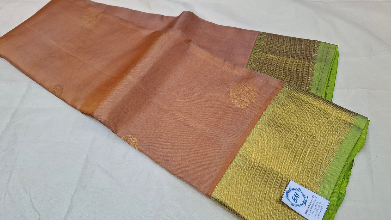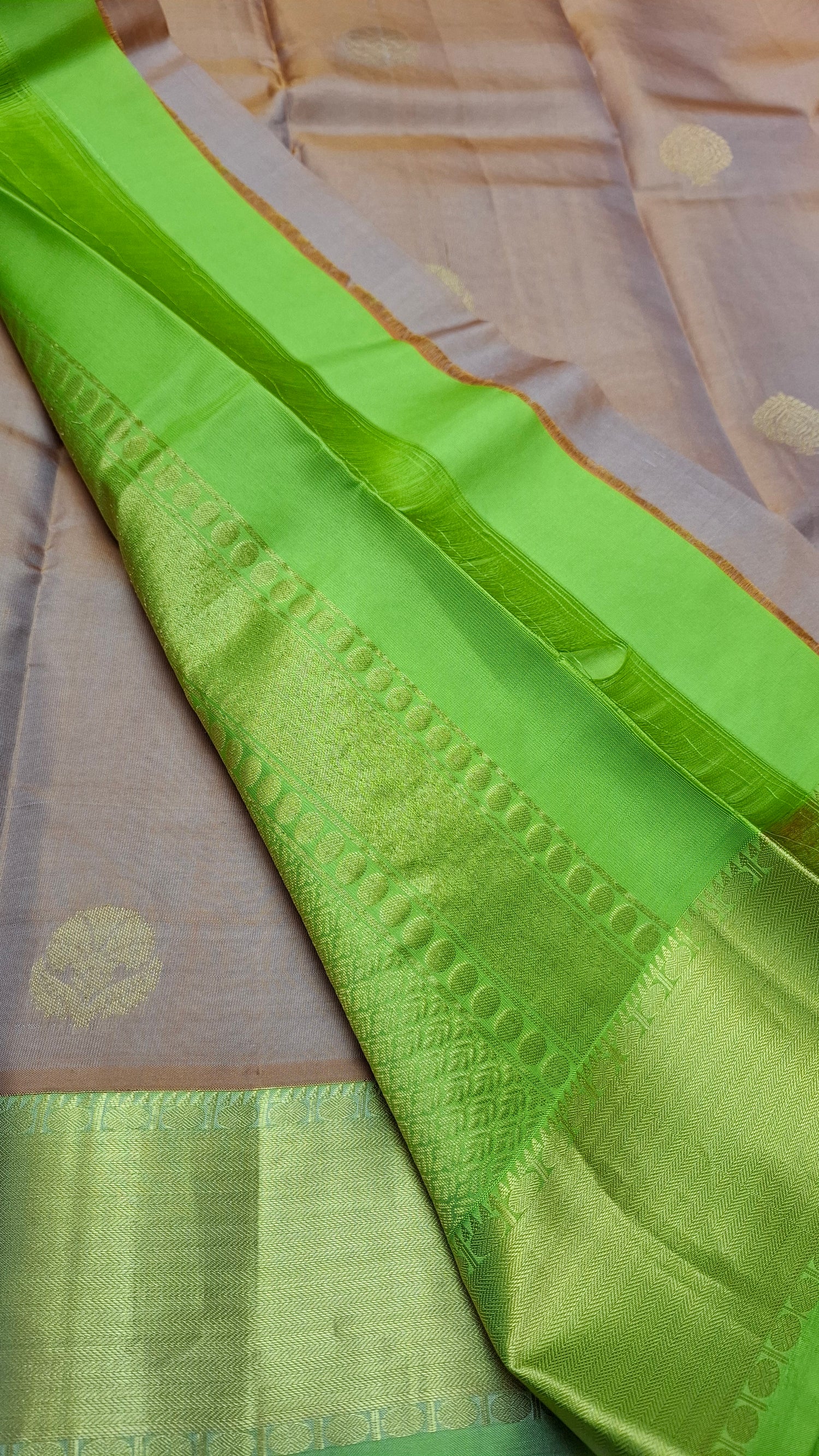 Pinkish brown pure Kanjipuram silk saree with gold zari & parrot green border. Contrasting pallu/ headpiece. Green running blouse piece with matching border.