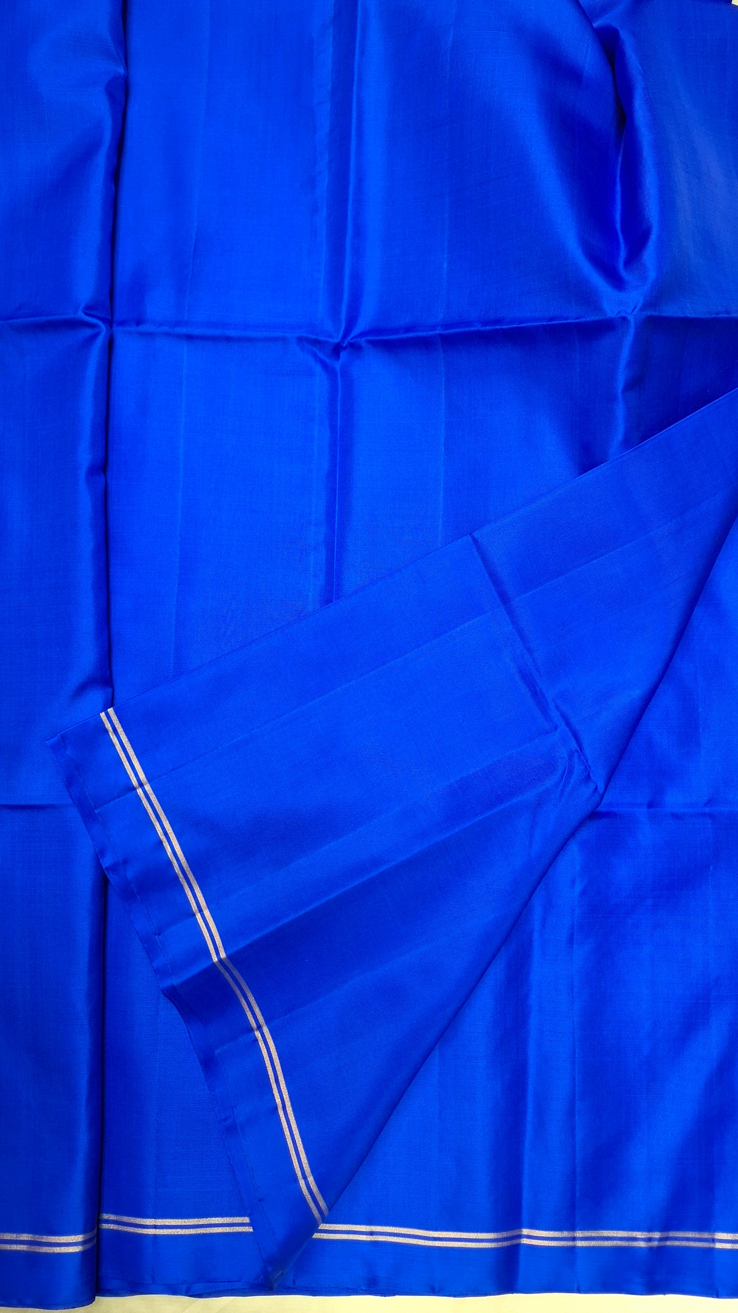 Pure Kanjipuram soft silk saree in royal blue with double line gold zari small border. Running blouse piece. Heavy gold zari pallu/ headpiece.