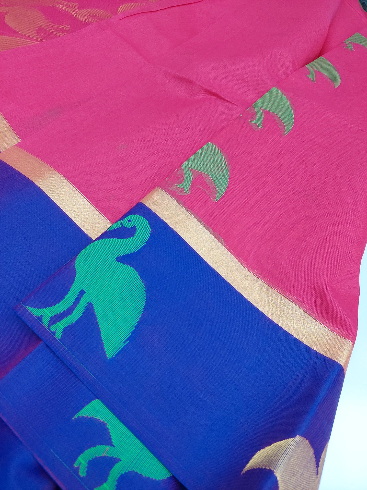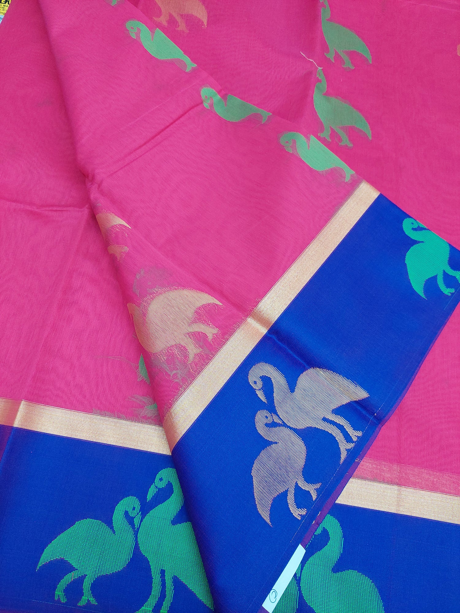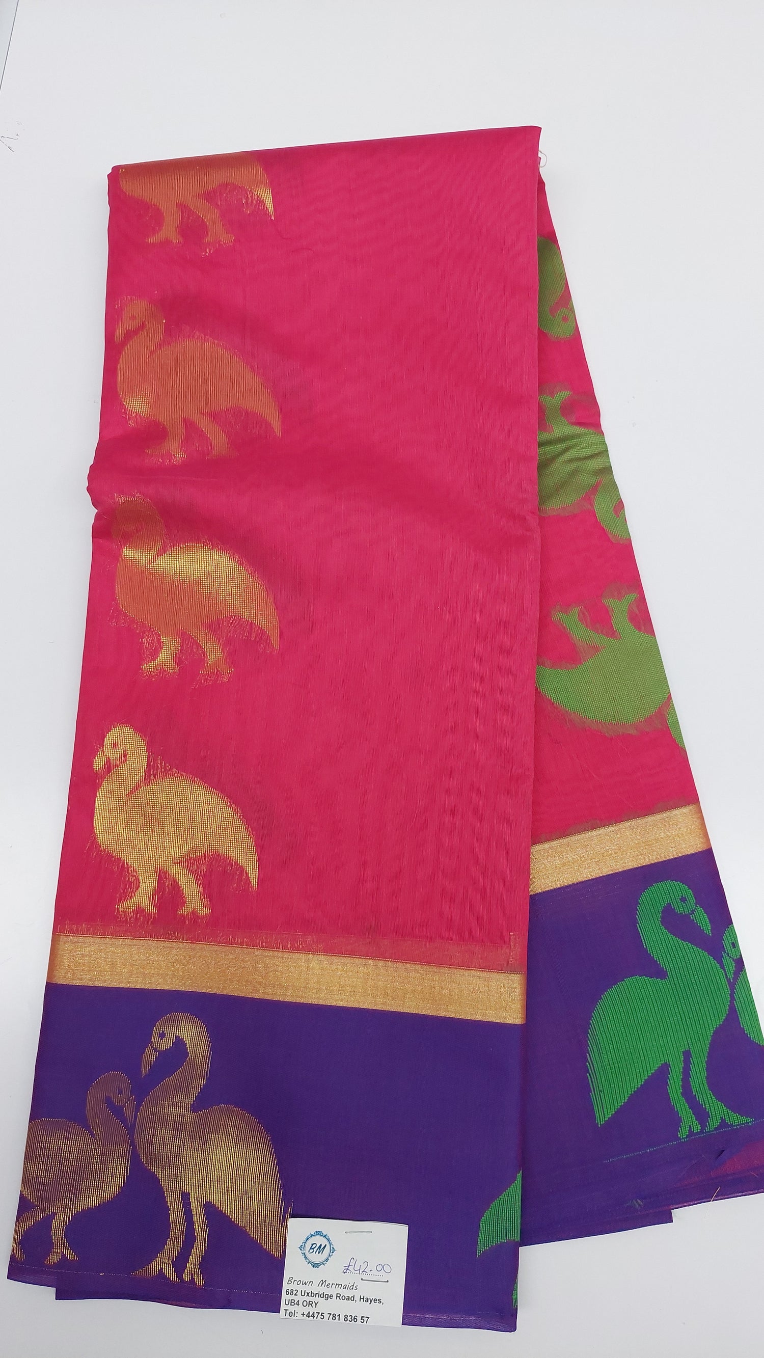 Pink saree with large Swan embroidery in gold. Large purple border.