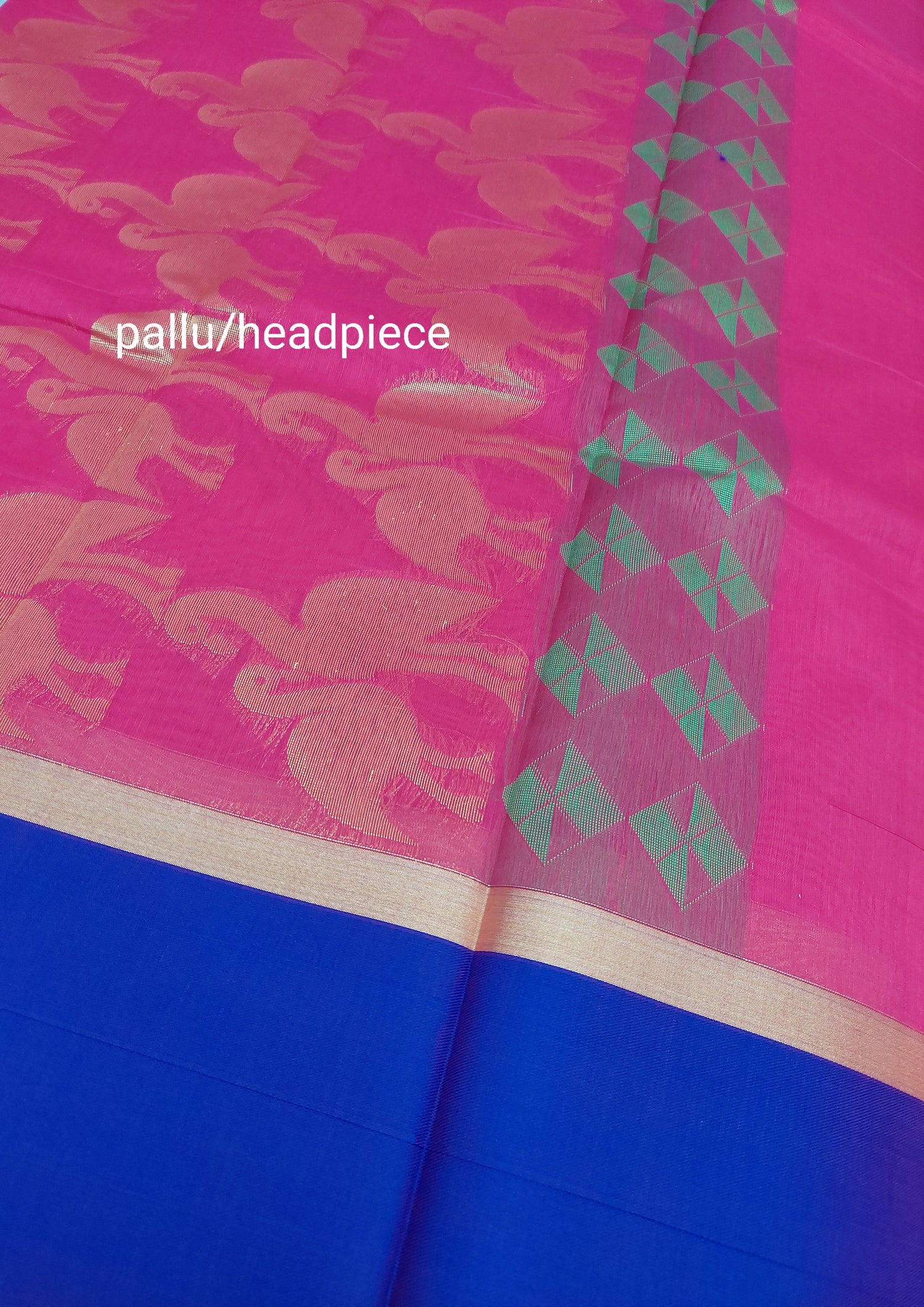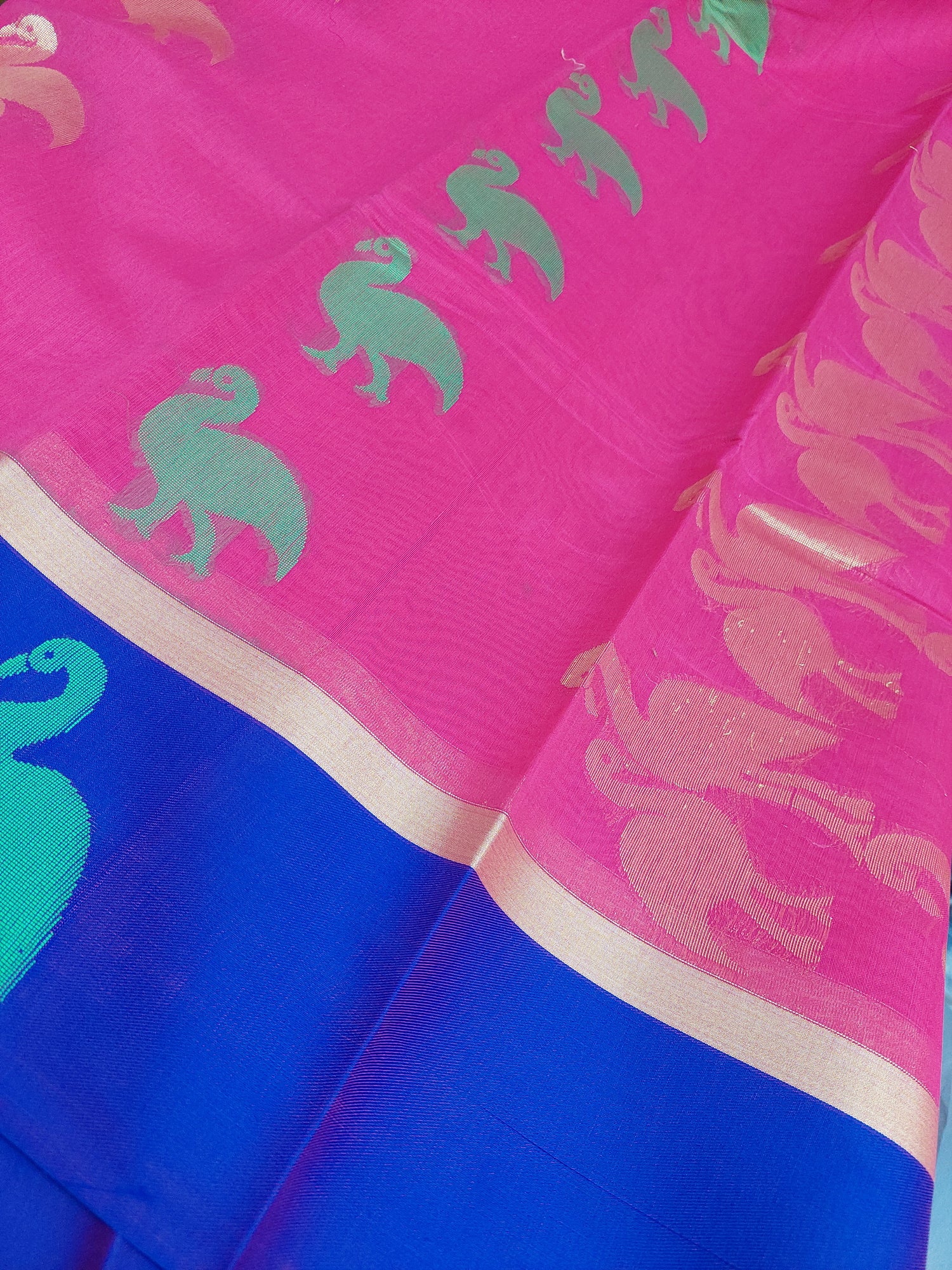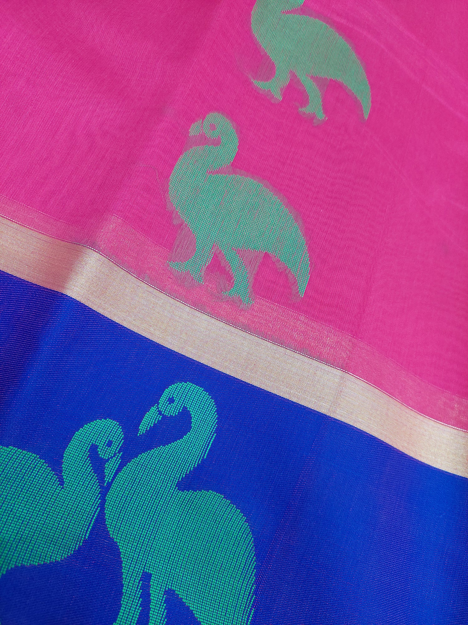 Pink saree with large Swan embroidery in gold. Large purple border.