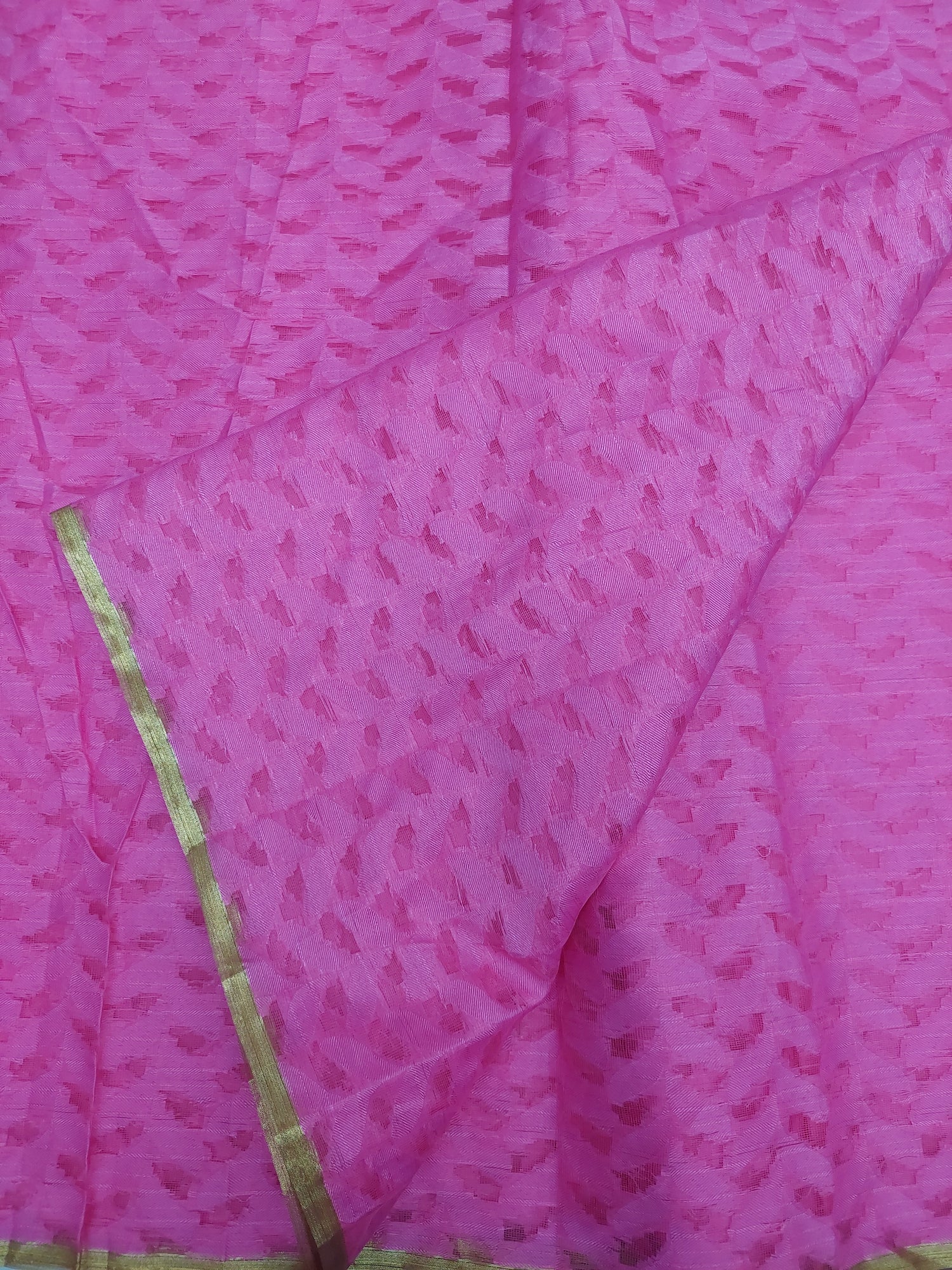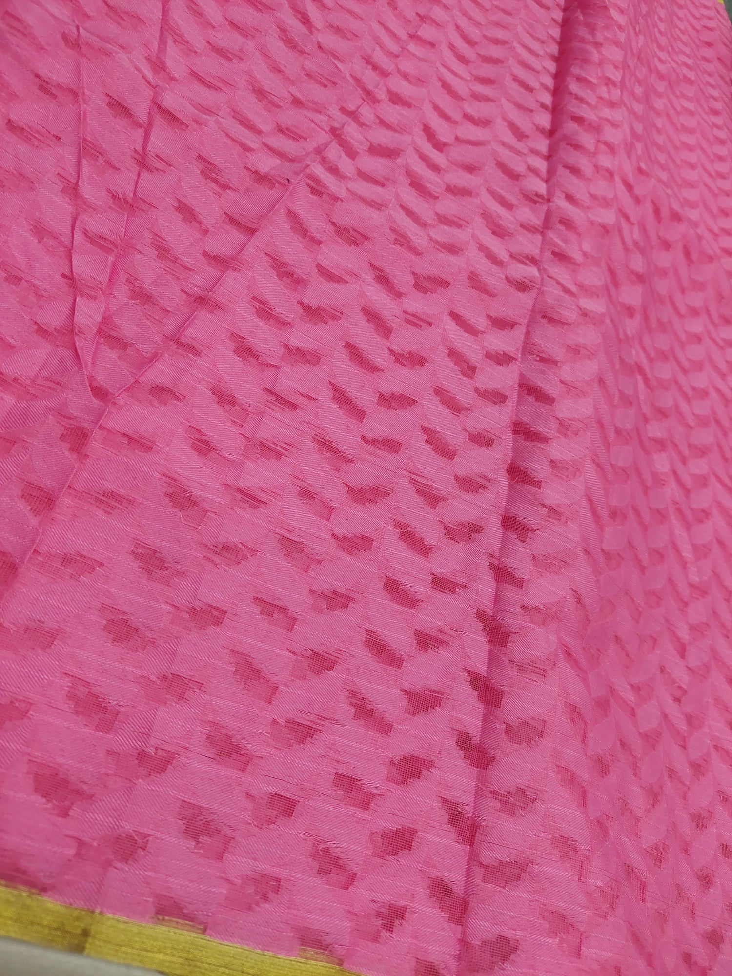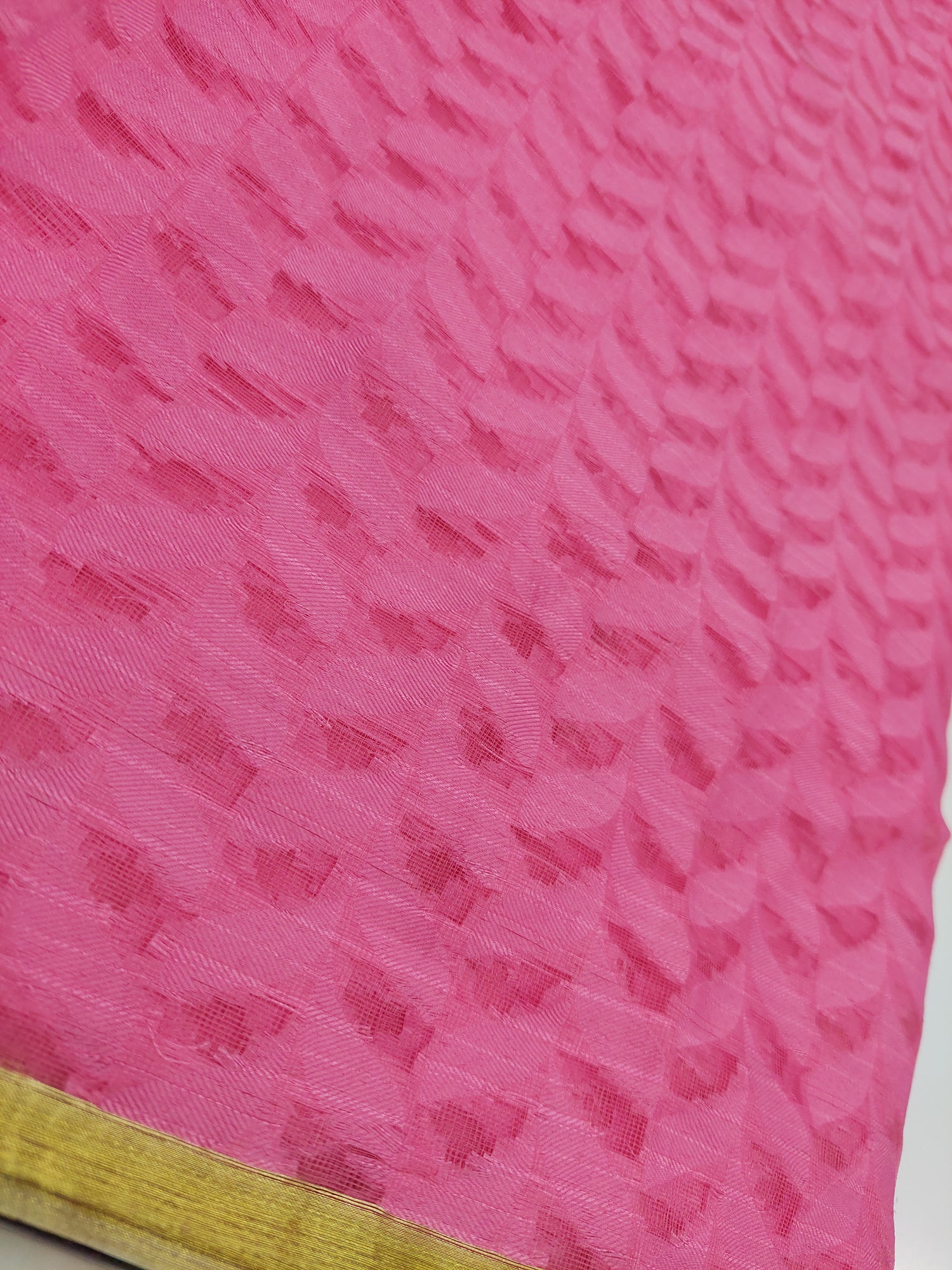 Pink cotton mix saree with floral blouse material . Small gold border.