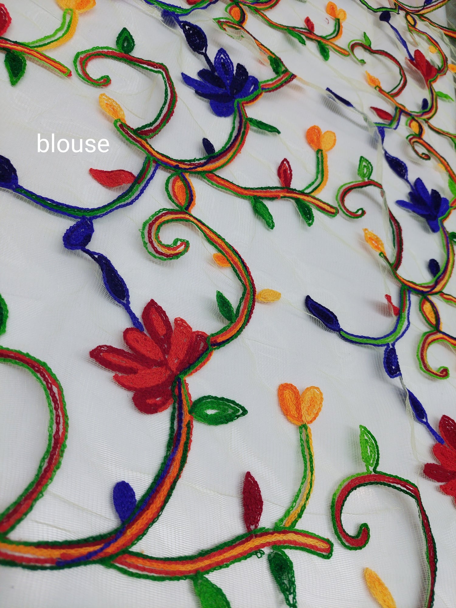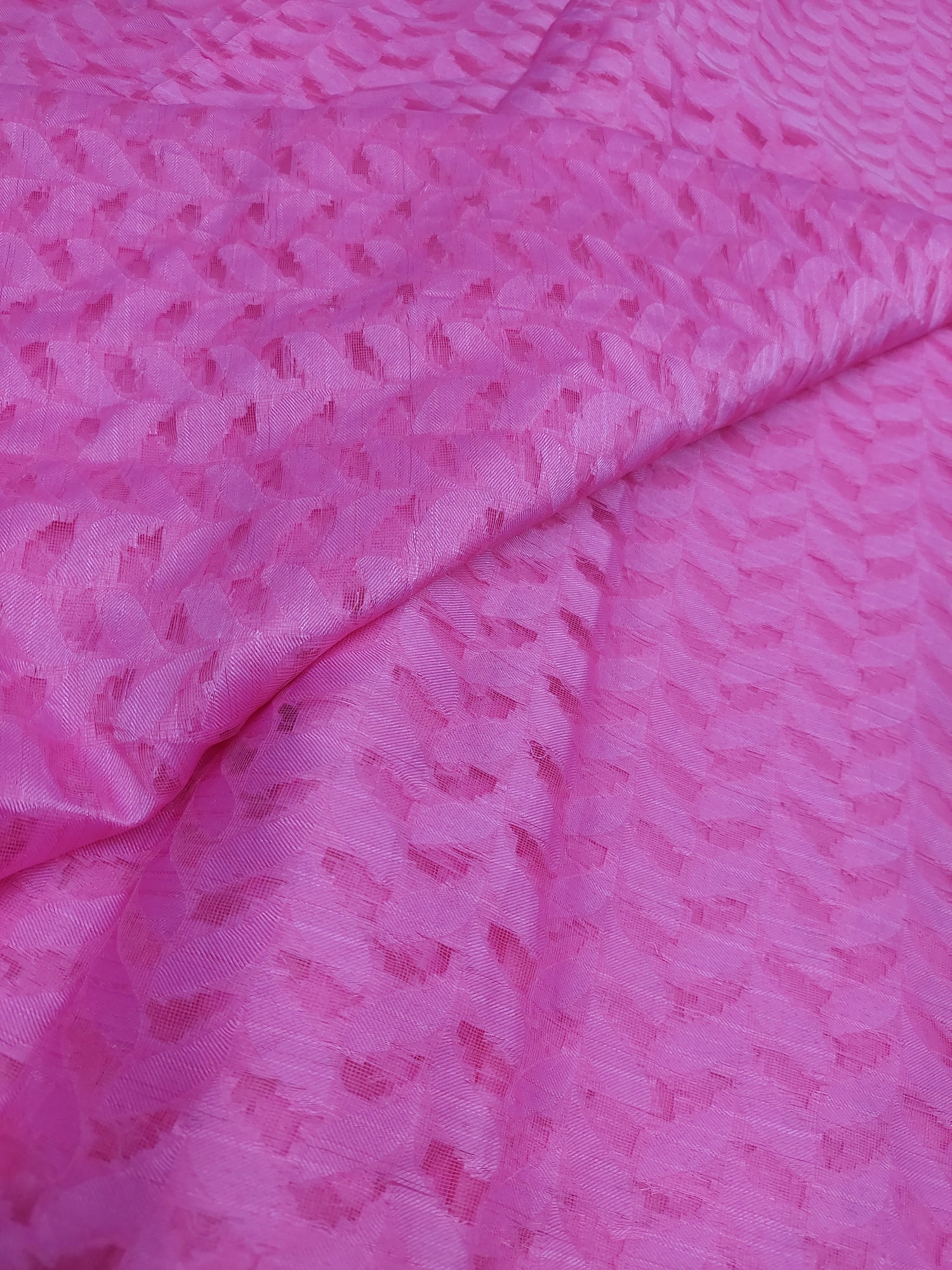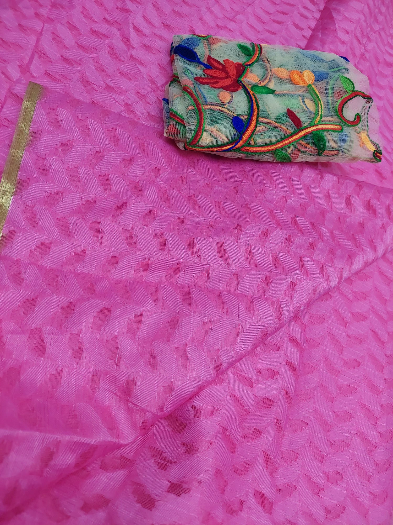 Pink cotton mix saree with floral blouse material . Small gold border.