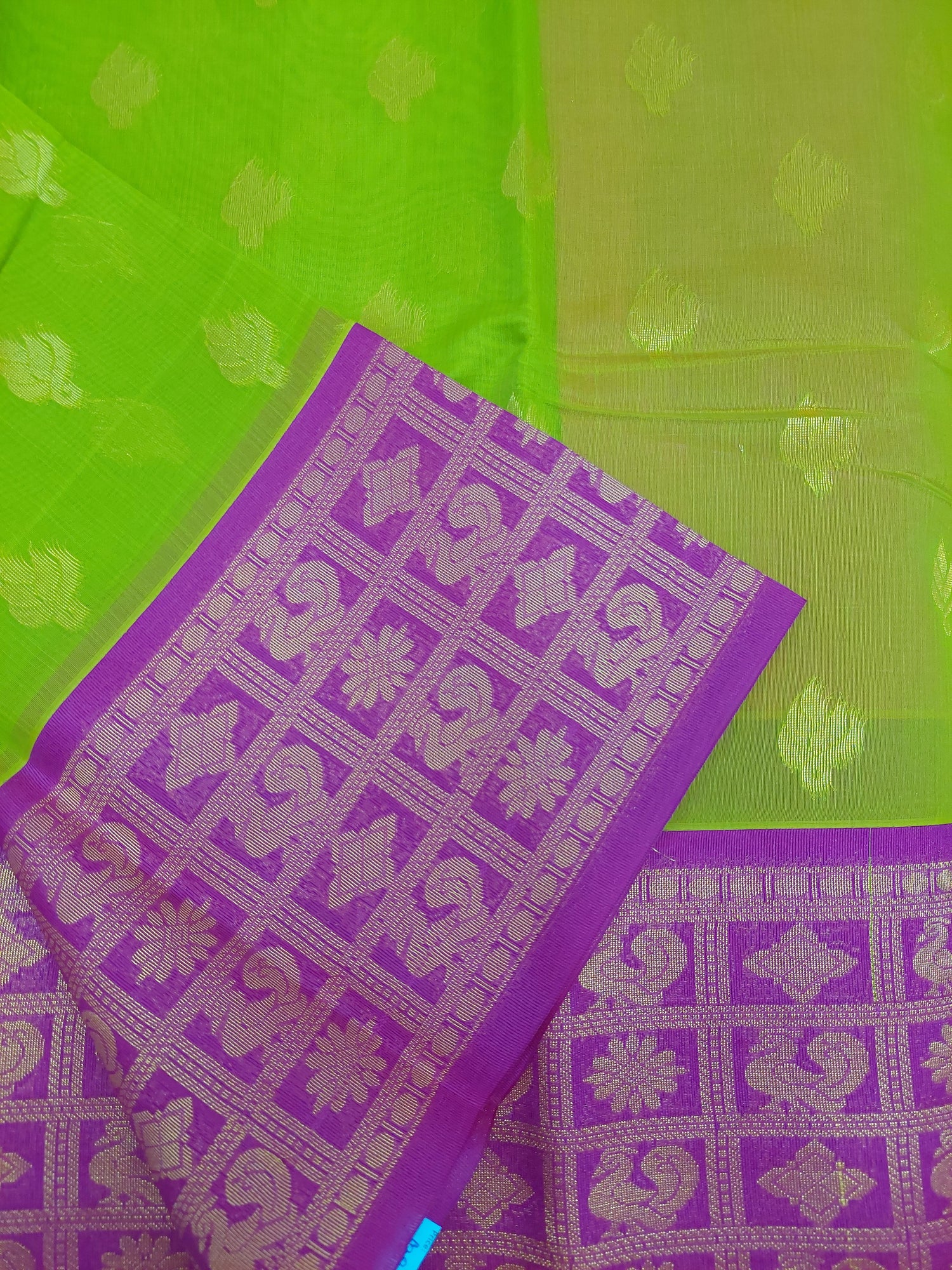 Green cotton saree with contrasting hot pink pallu and blouse. Large pink border with peacocks.