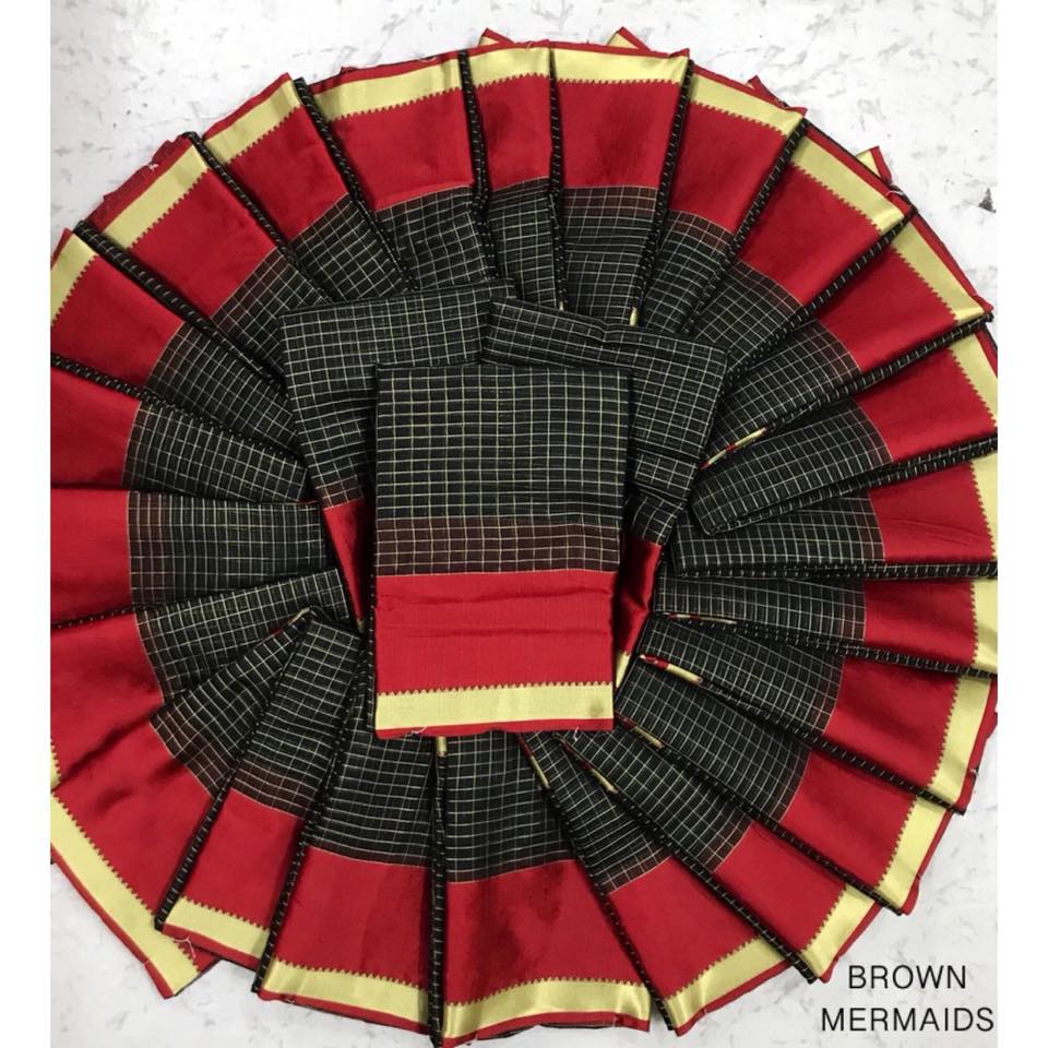 Manipuri kota Jari checkered satin border saree with red running blouse.