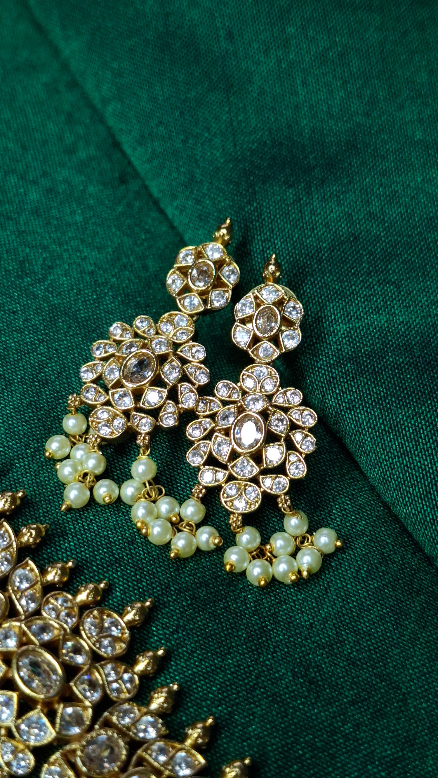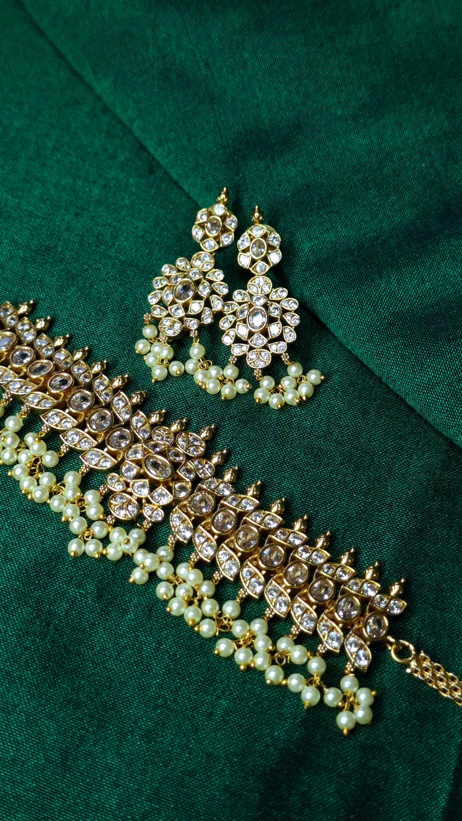 Antique gold, matte finish choker set. Comes wkth matching earrings with clustered pearls.