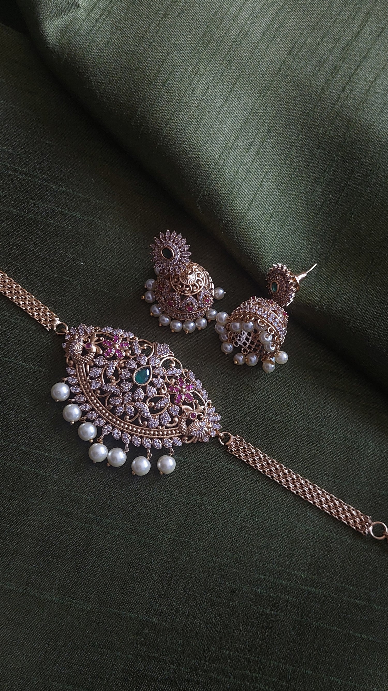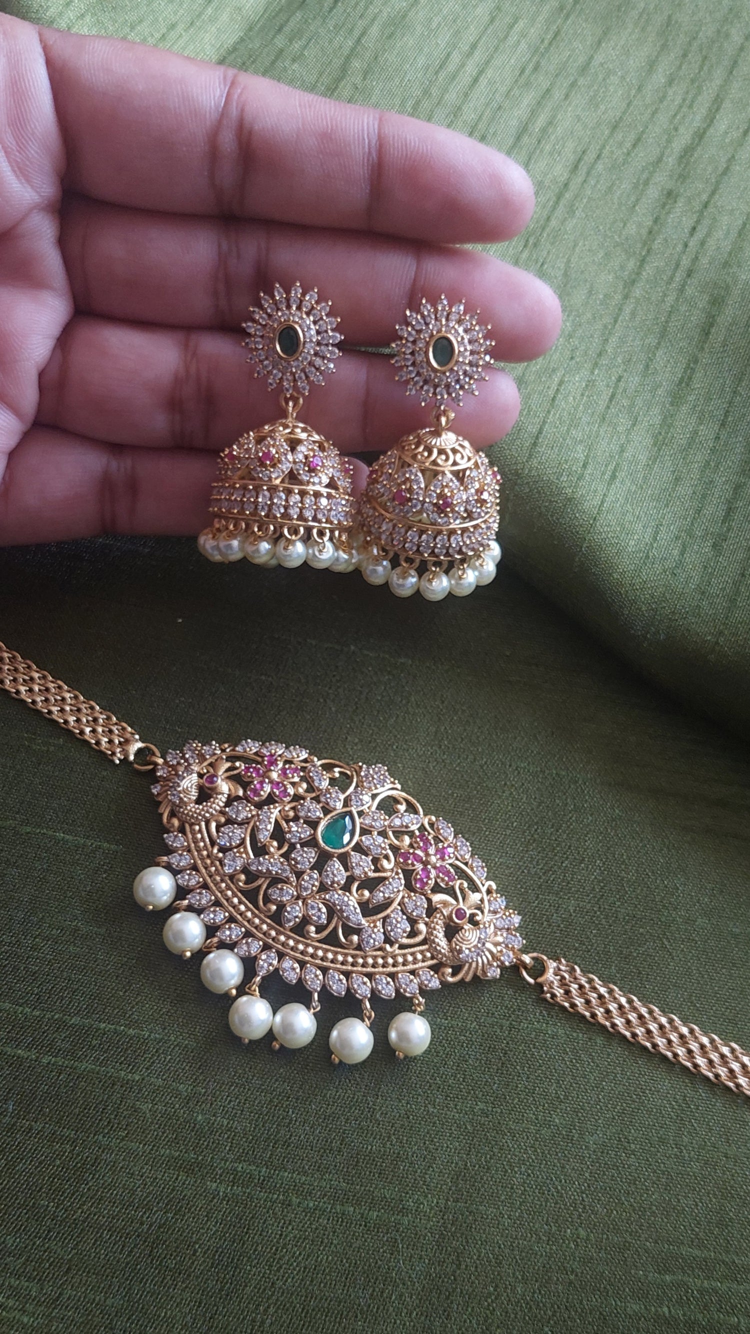 Yellow gold finish A.D. stone chocker style necklace with matching jumkha earrings.