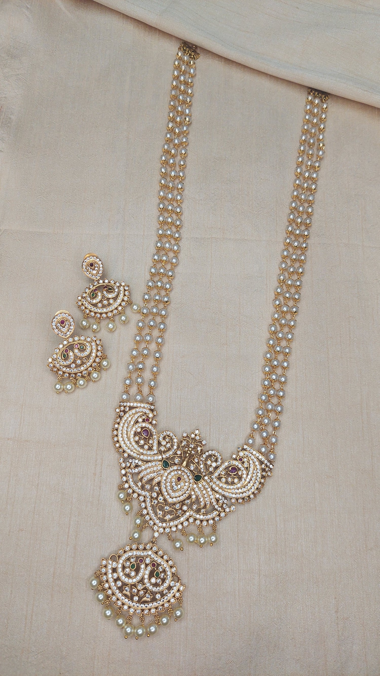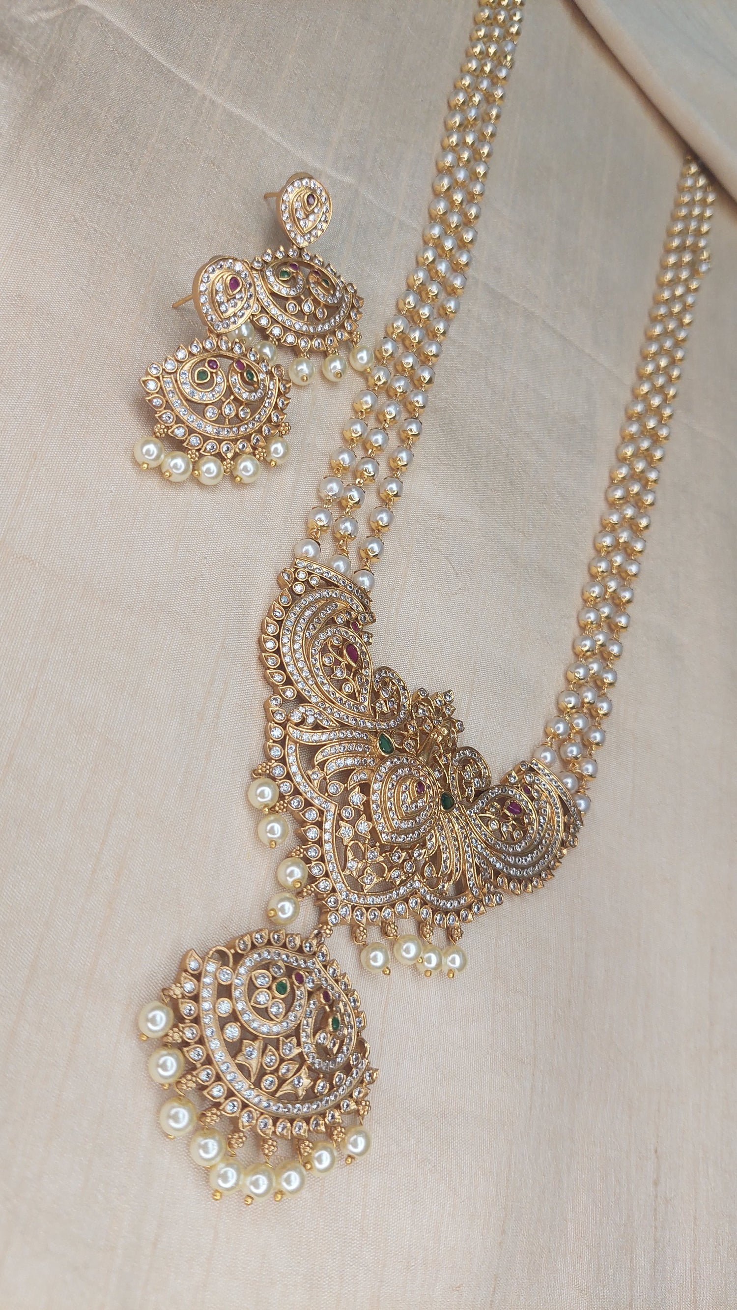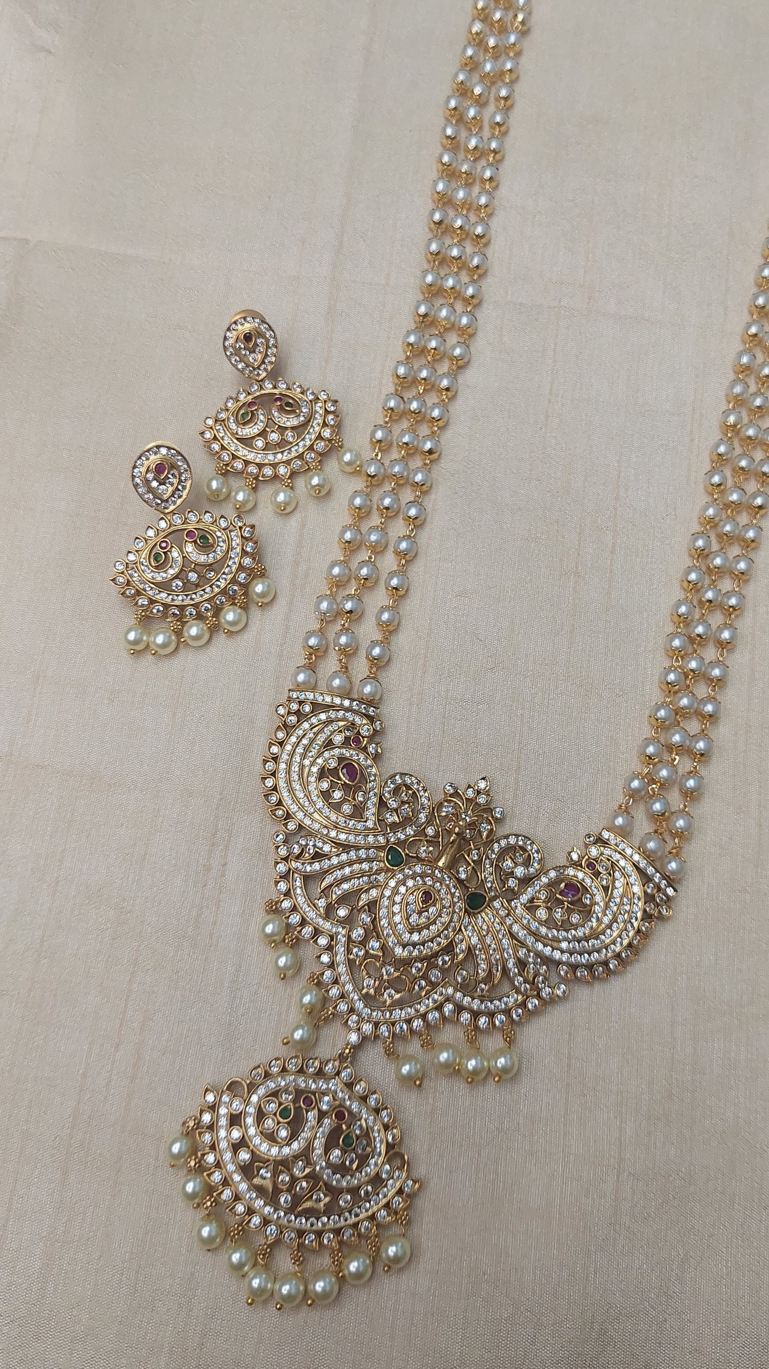 Matte gold finish long pearl necklace, with A.D. stone peacock double pendant. Comes with matching earrings.