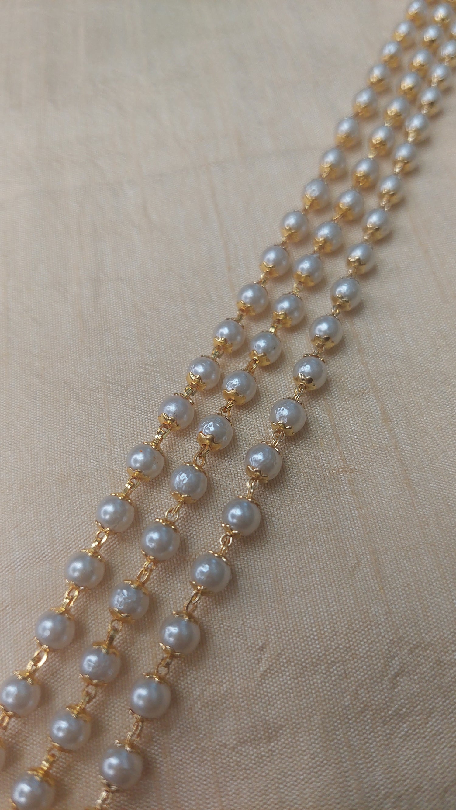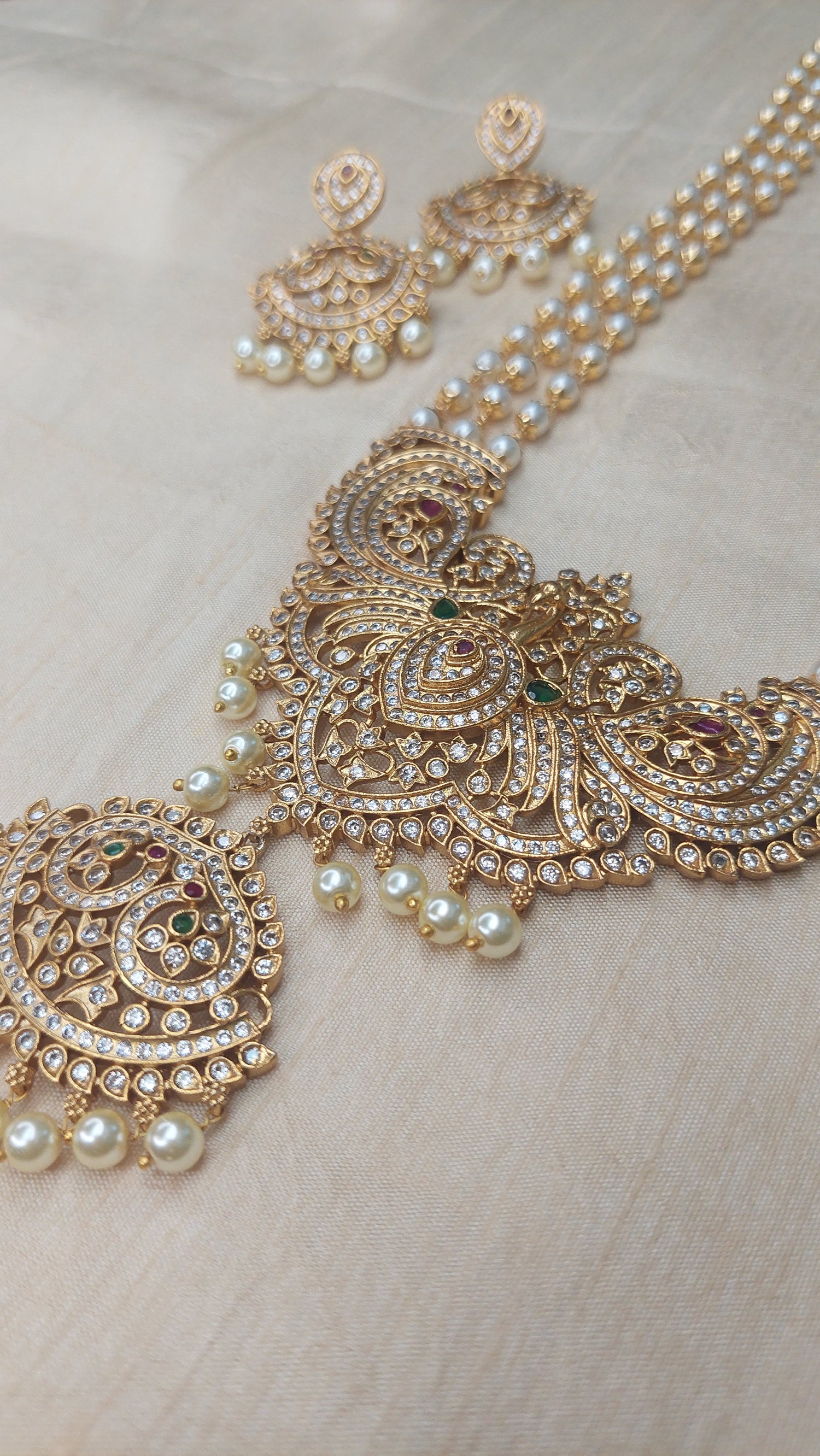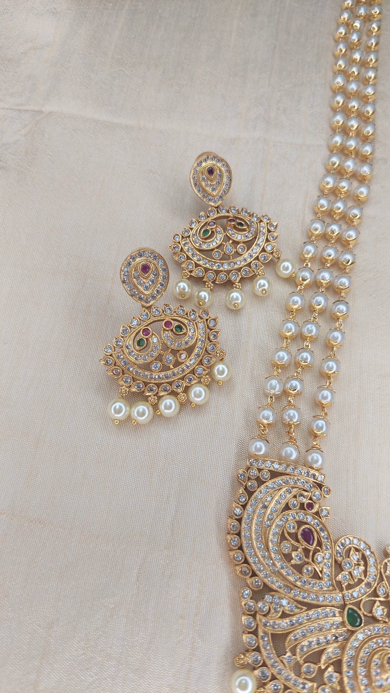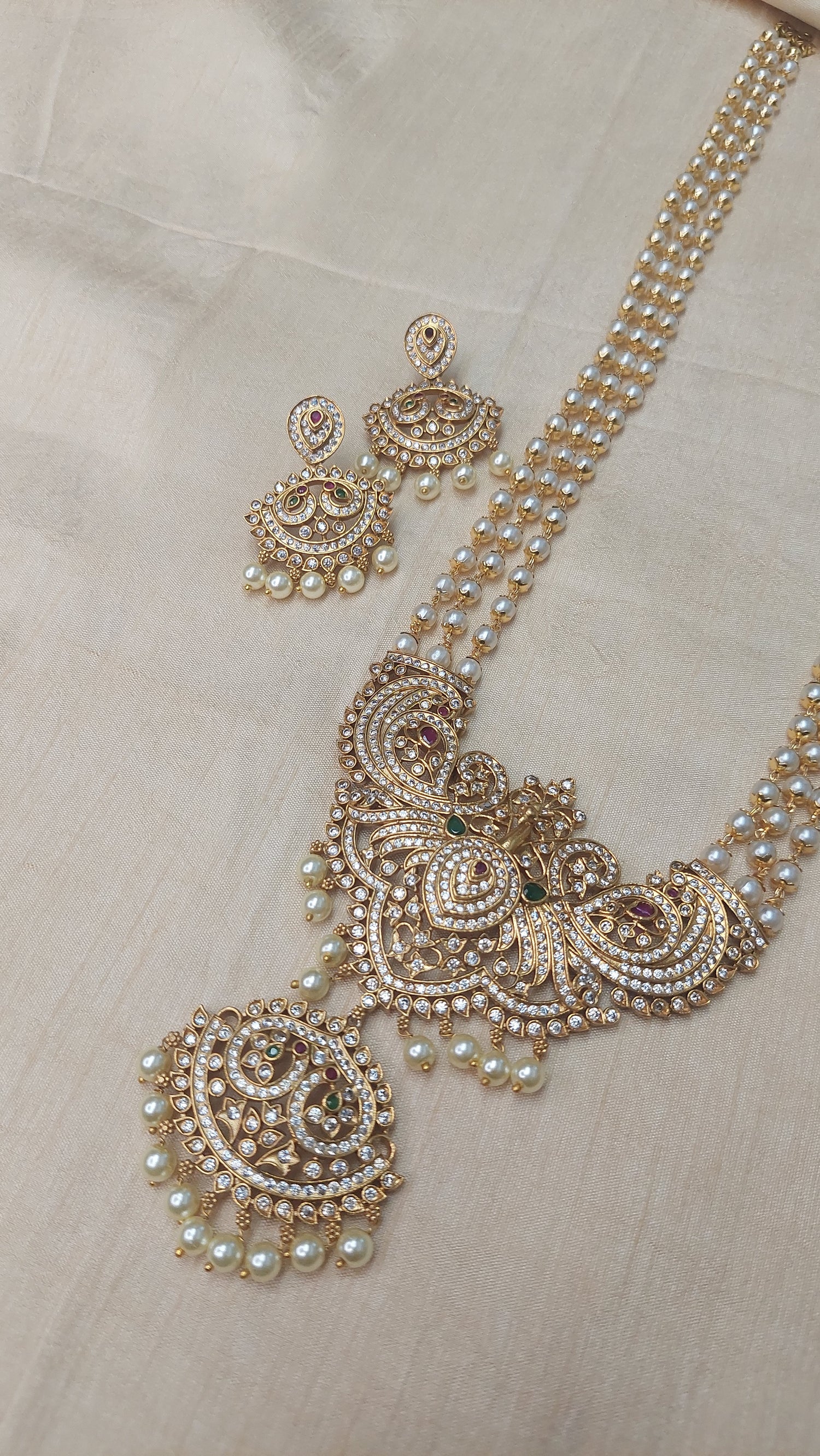 Matte gold finish long pearl necklace, with A.D. stone peacock double pendant. Comes with matching earrings.