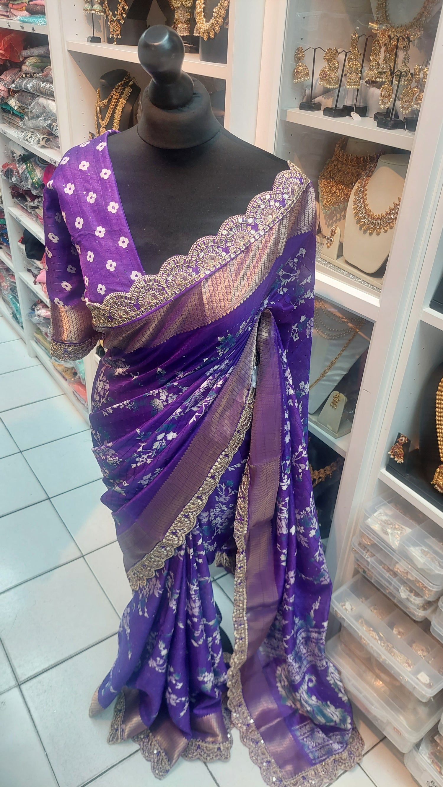 Purple sana silk saree with gold zari double border. Comes with contrasting printed blouse.