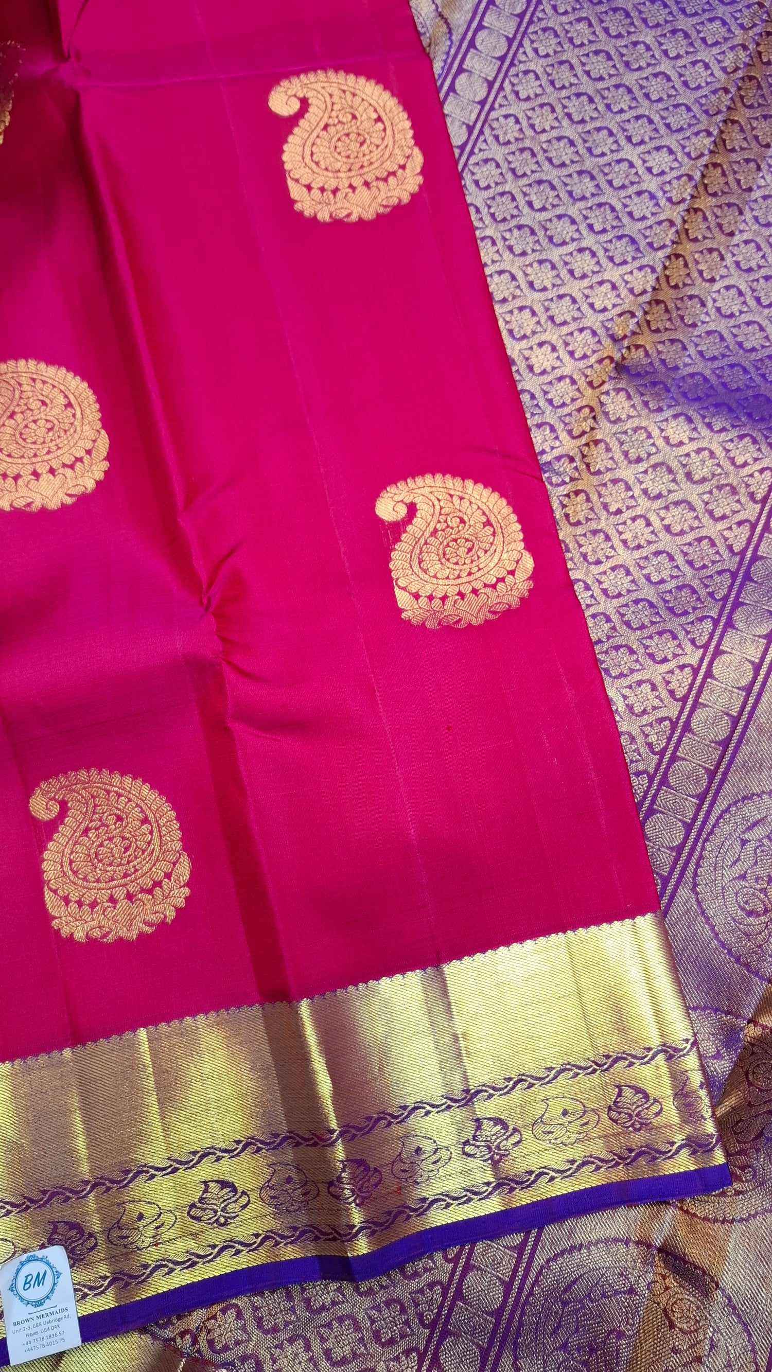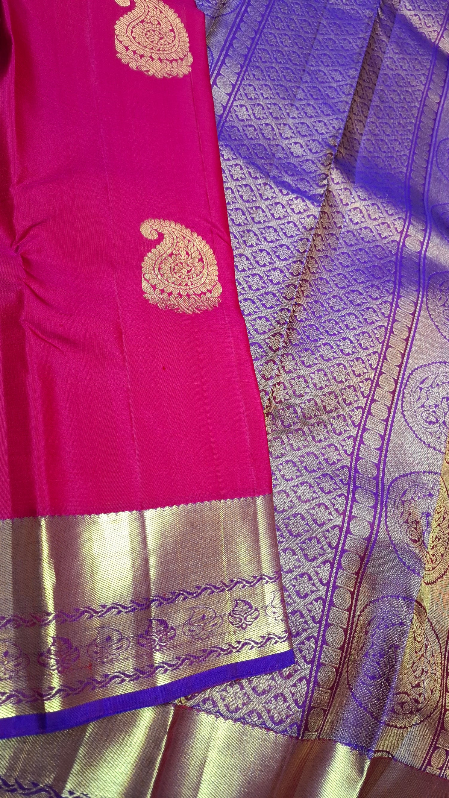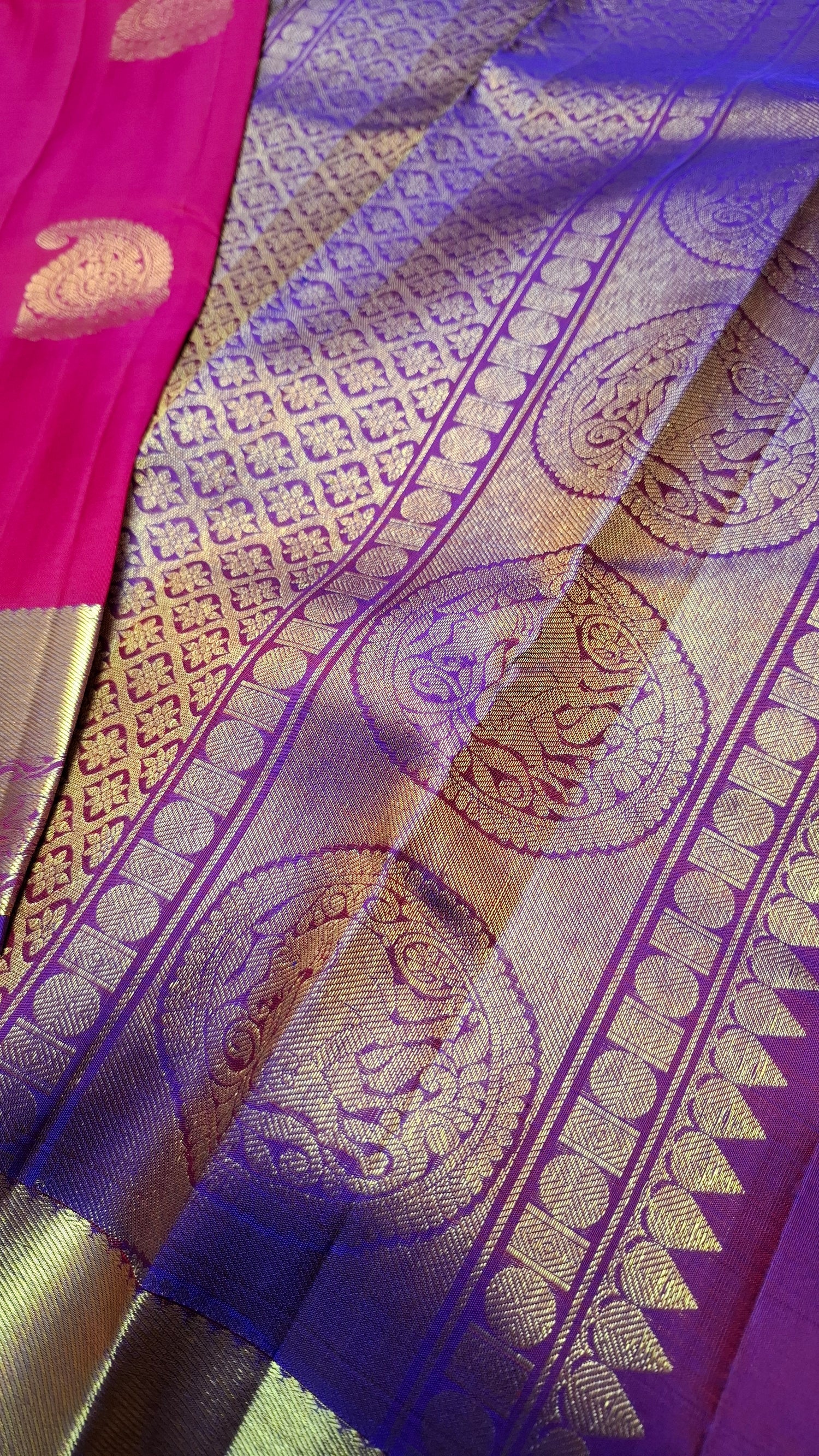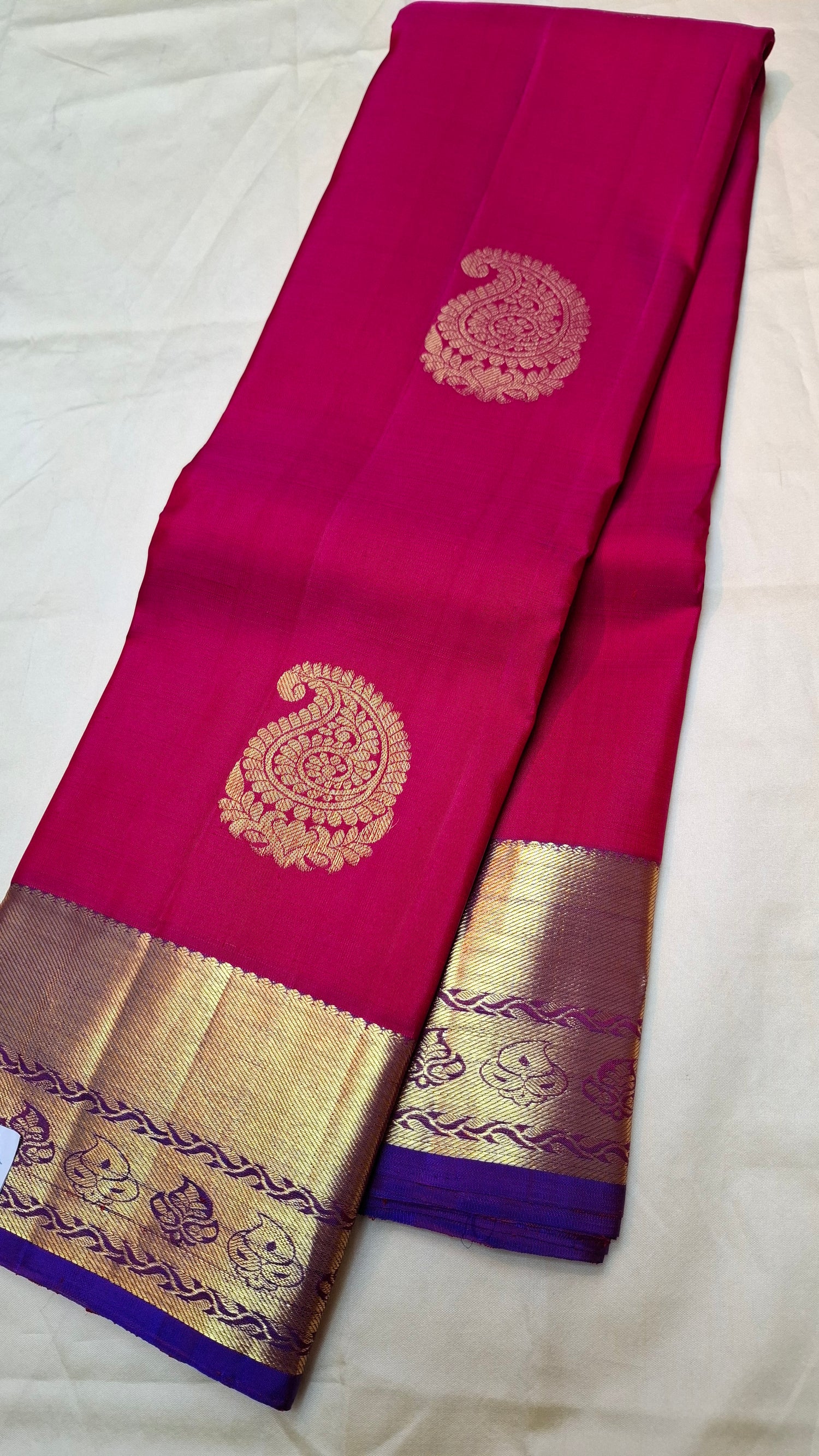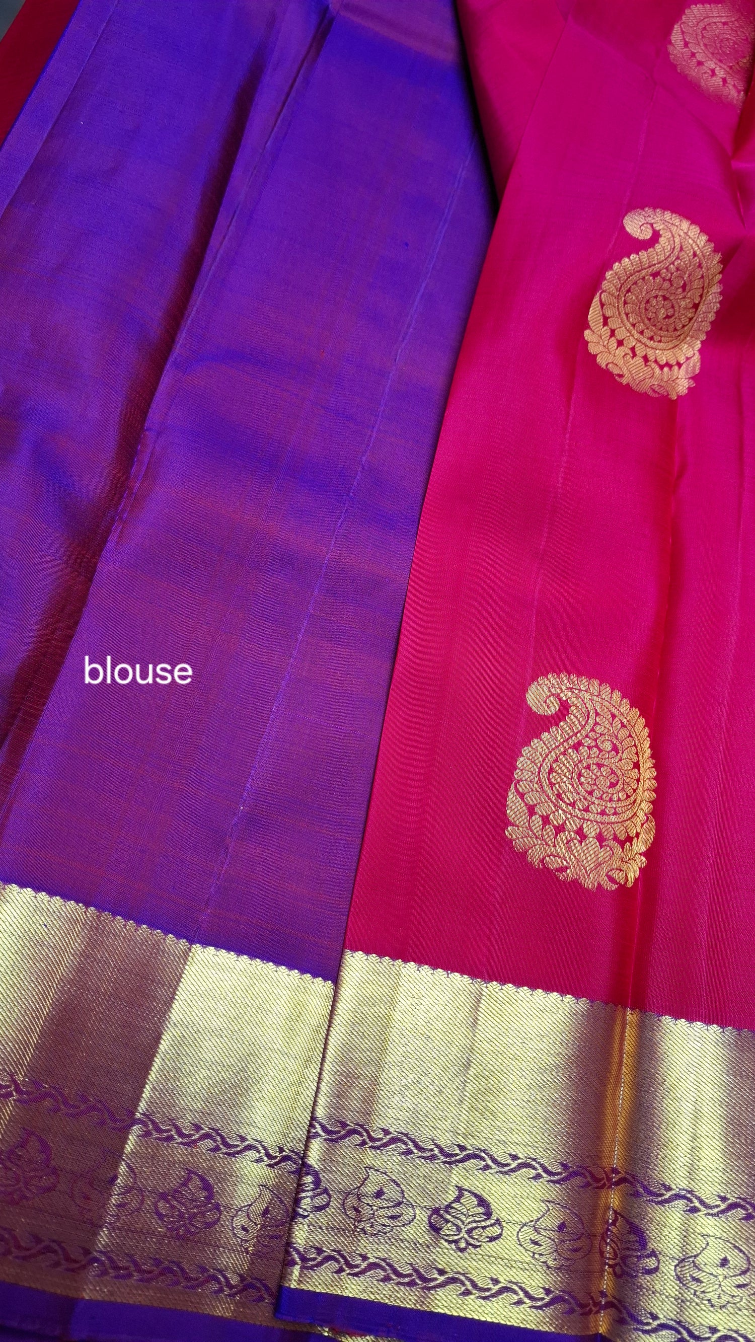 Dark hot pink pure Kanjipuram Silk saree with gold zari border. Rich purple pallu/ headpiece & with double tone purple running blouse piece.