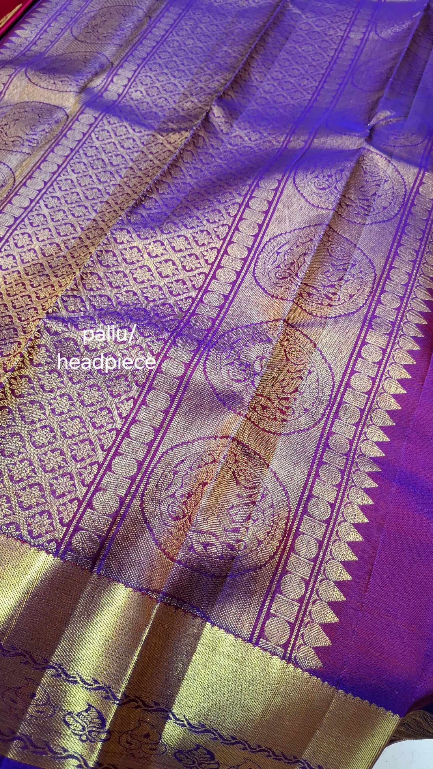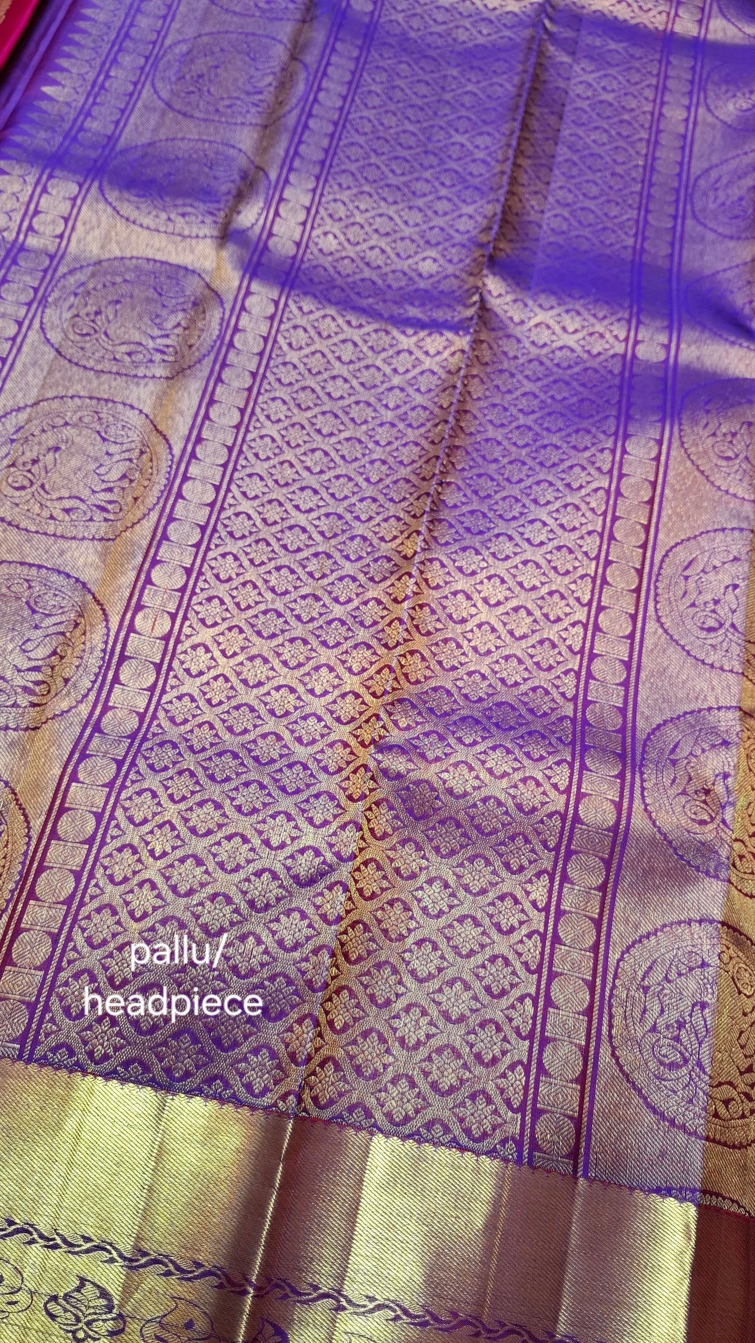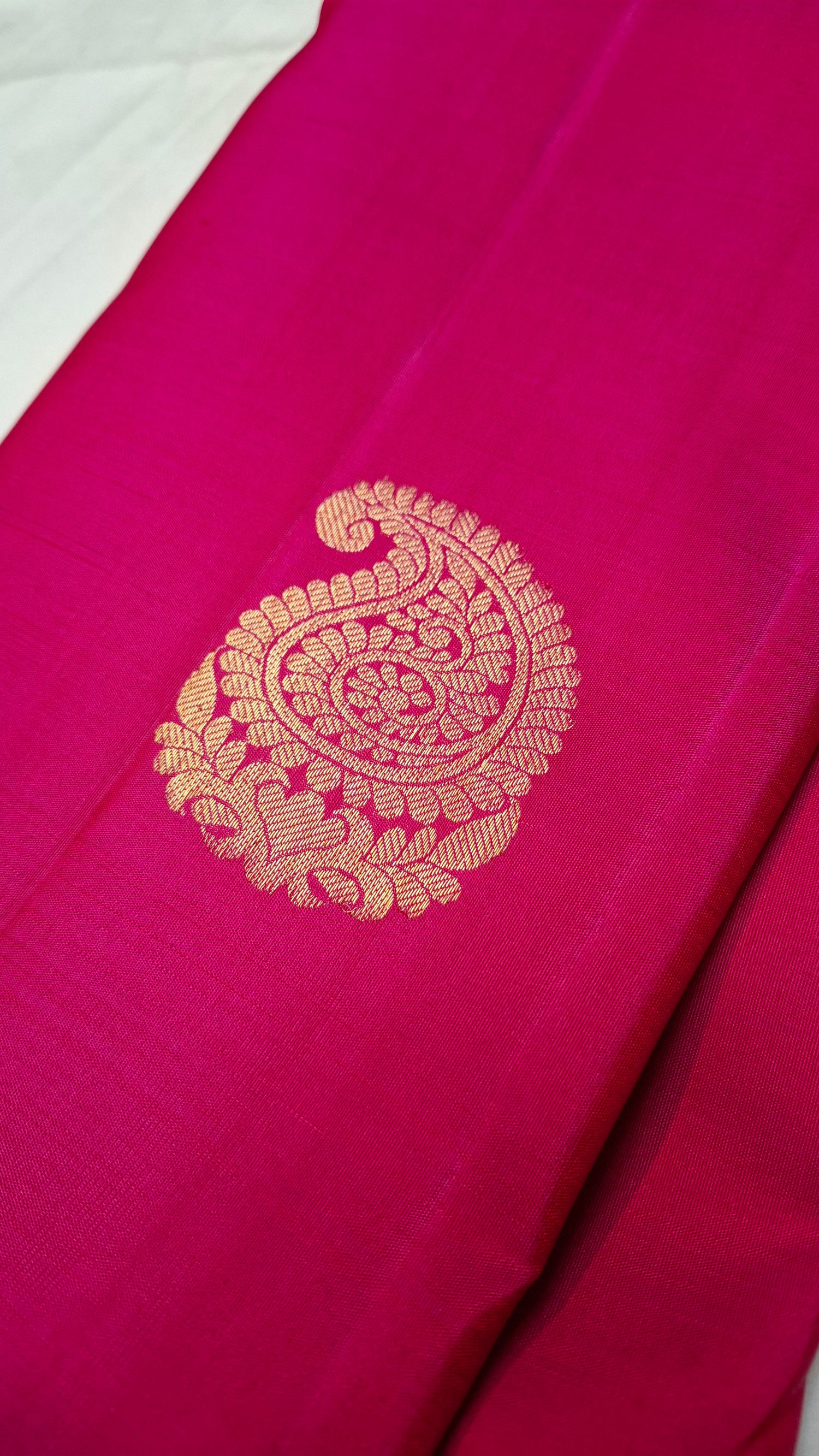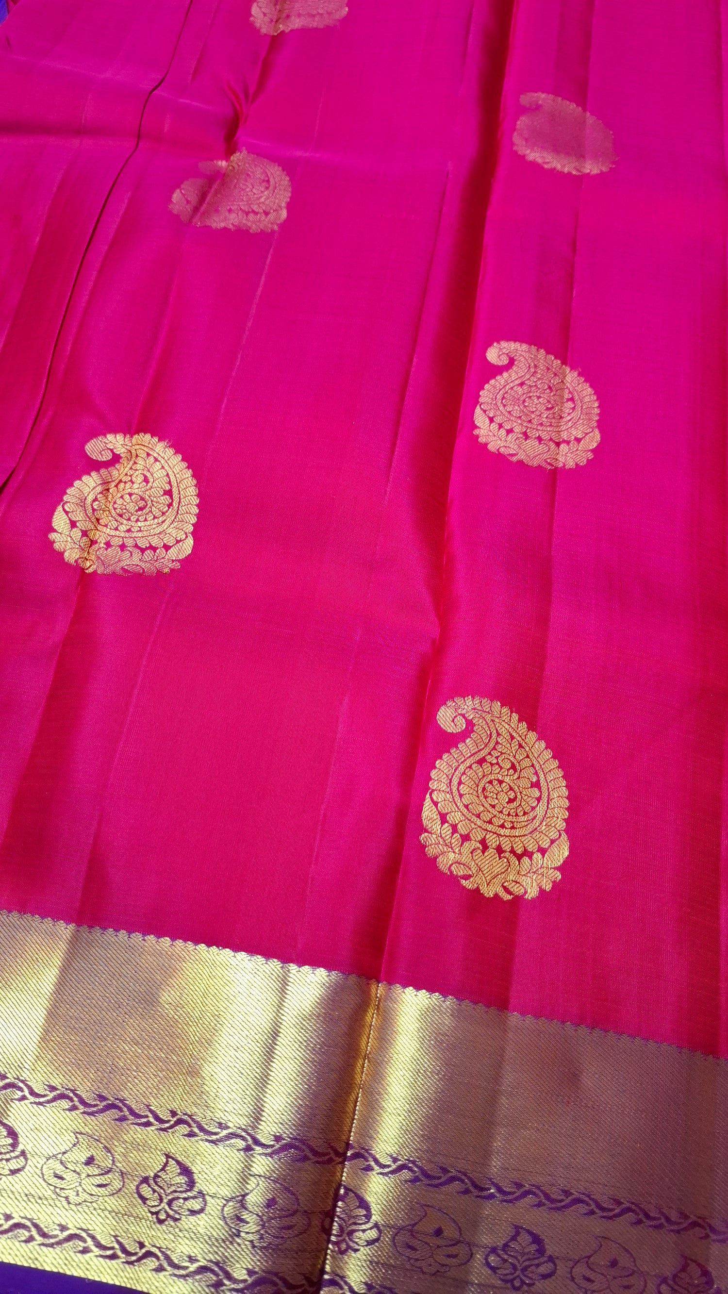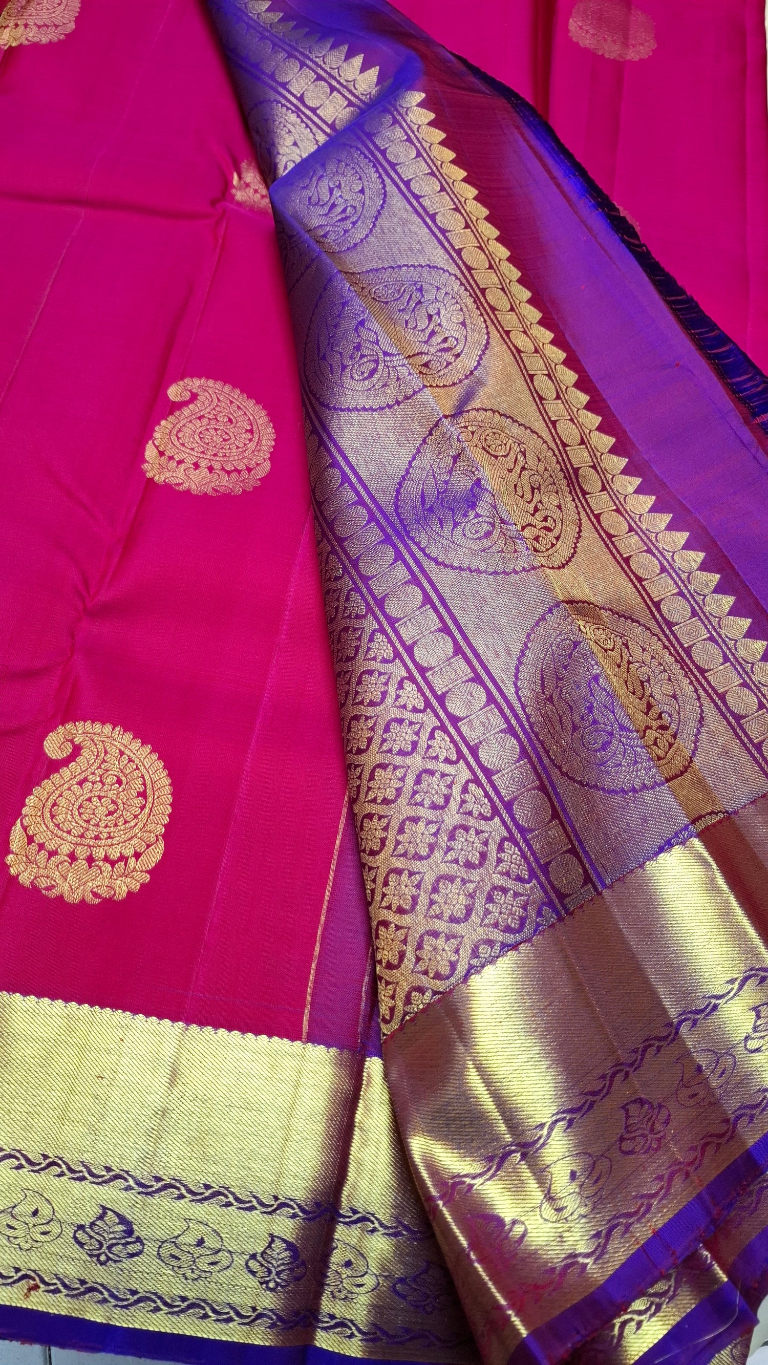Dark hot pink pure Kanjipuram Silk saree with gold zari border. Rich purple pallu/ headpiece & with double tone purple running blouse piece.
