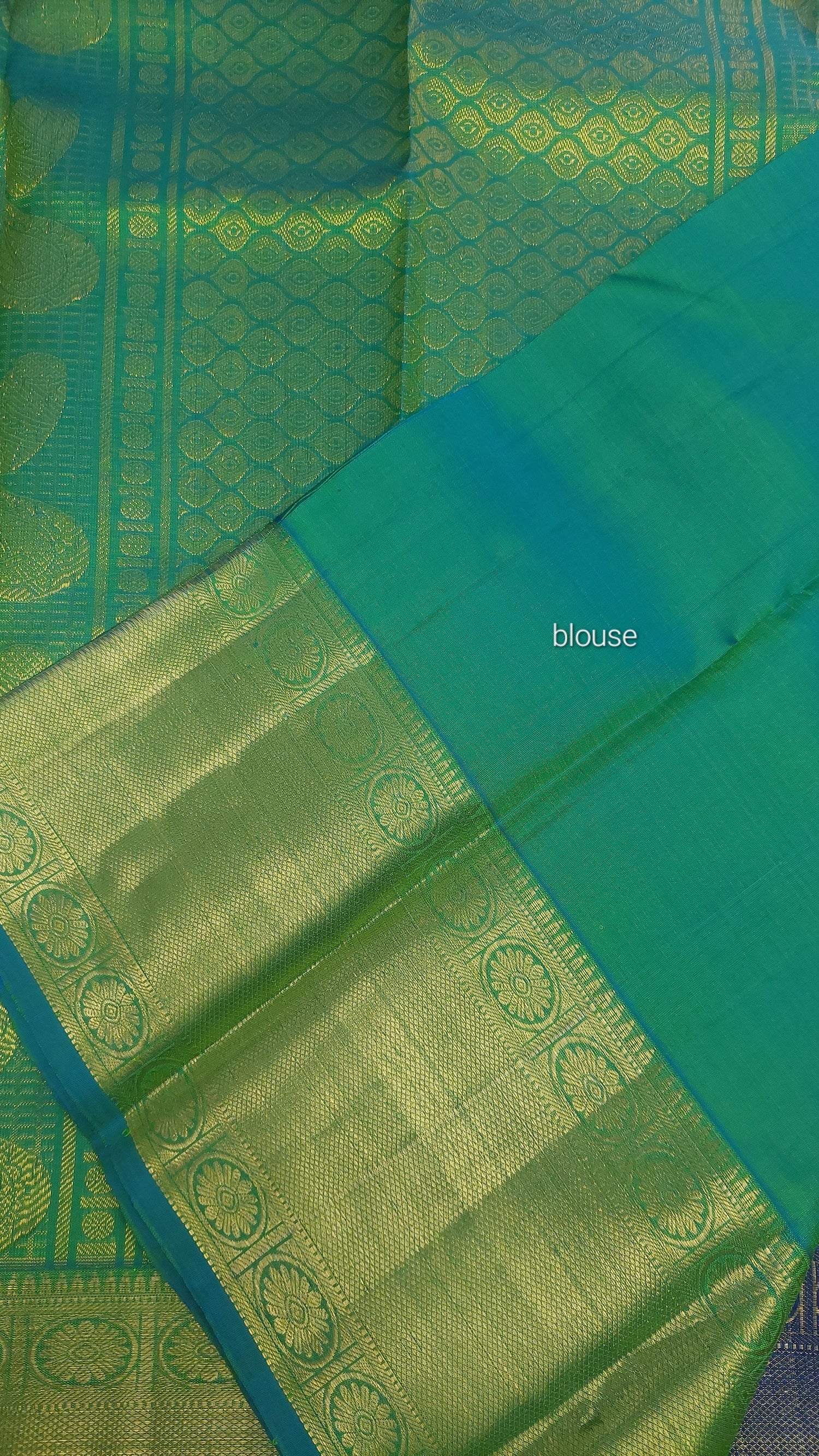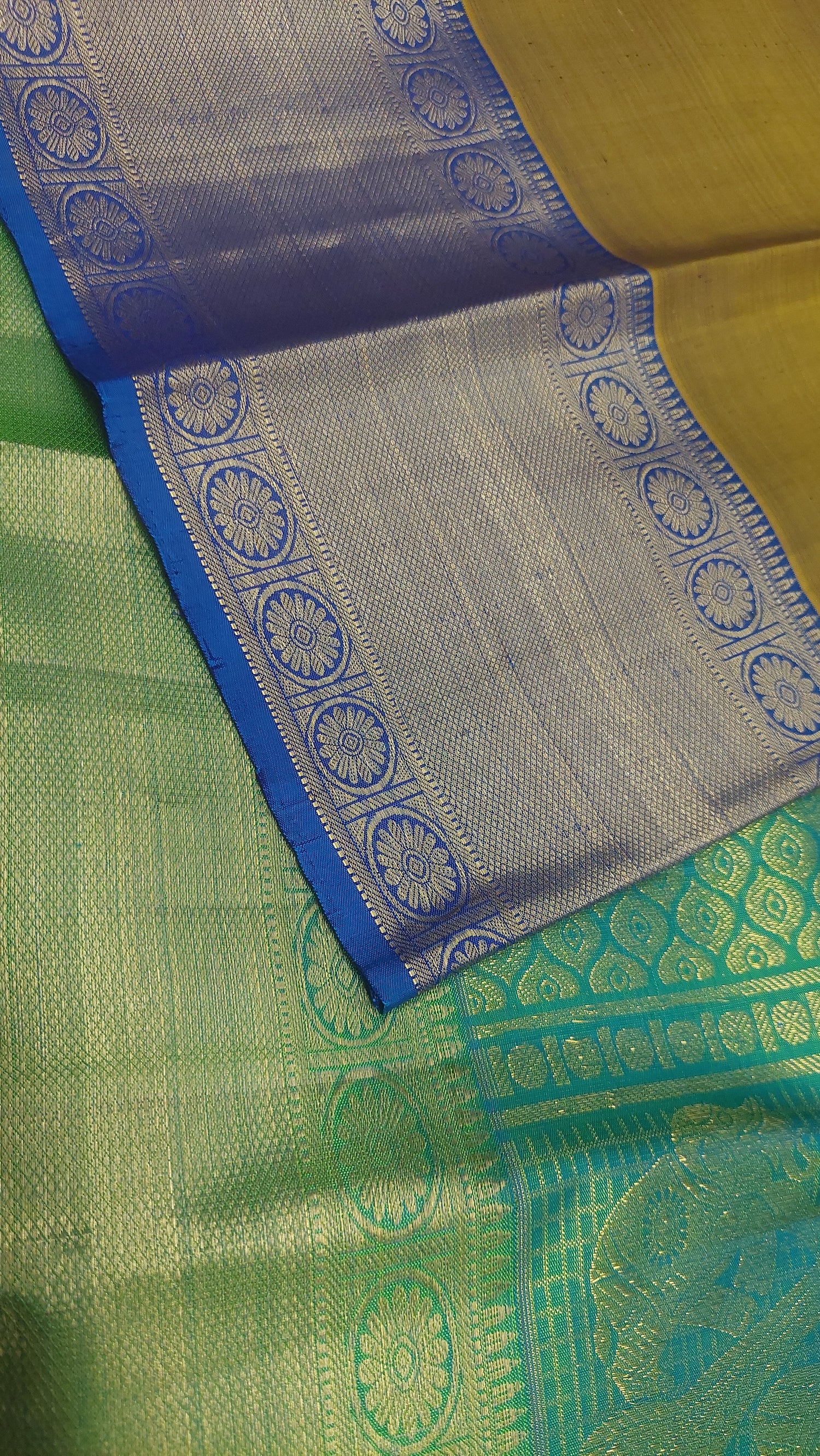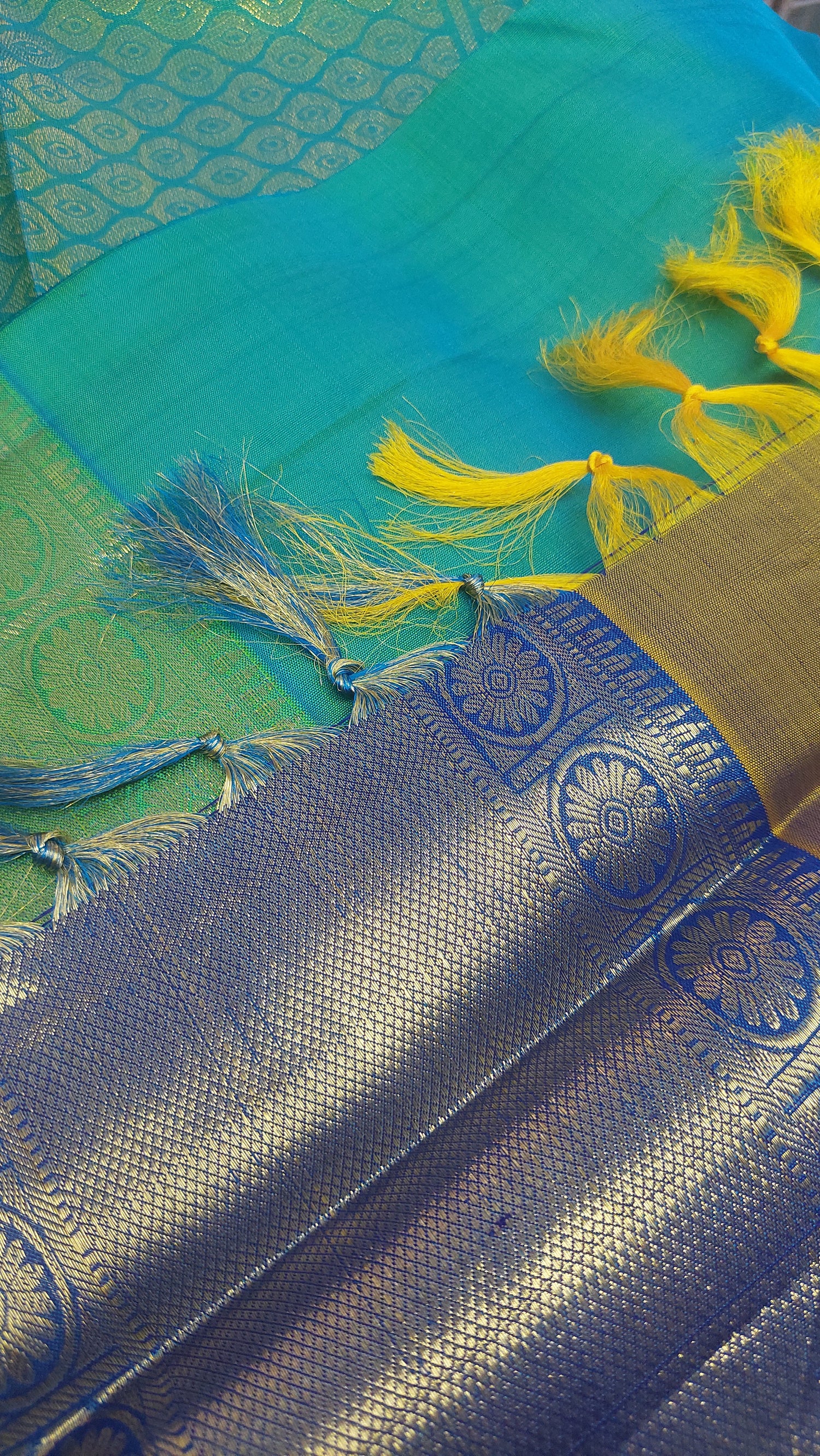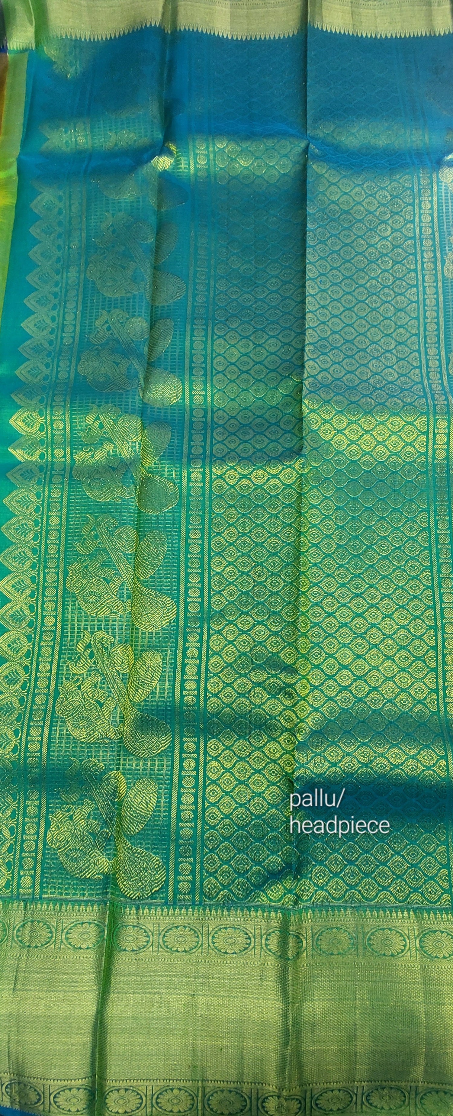 This double tonne pure silk saree with tints of lemon grass green, yellow and blues. Contrasting again with double tone green/ blue pallu/ headpiece. Gold zari border. Running contrasting blouse with border.