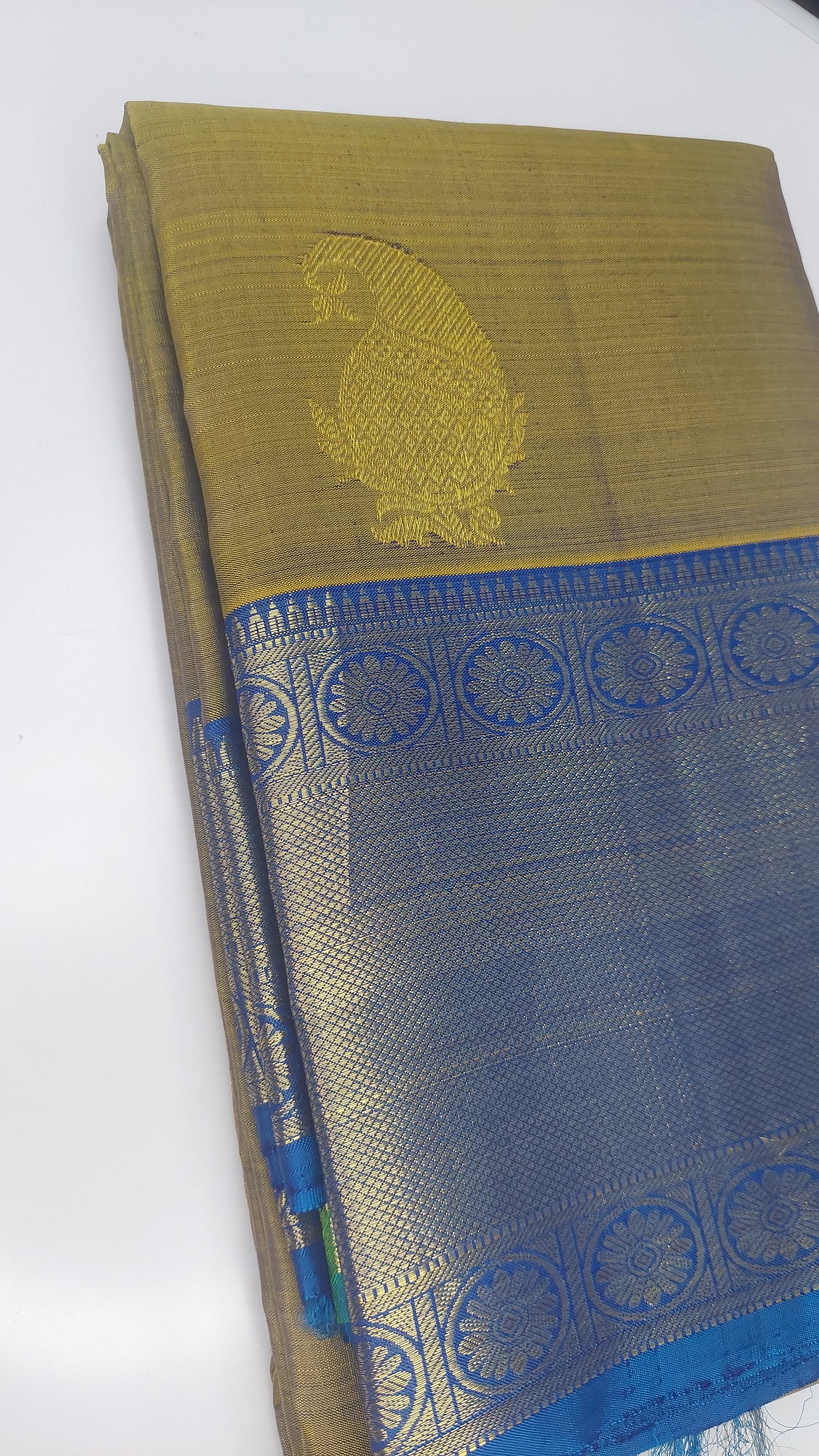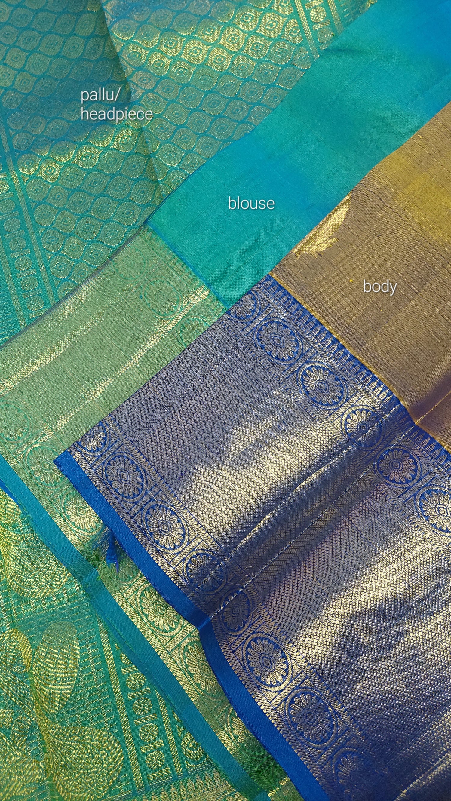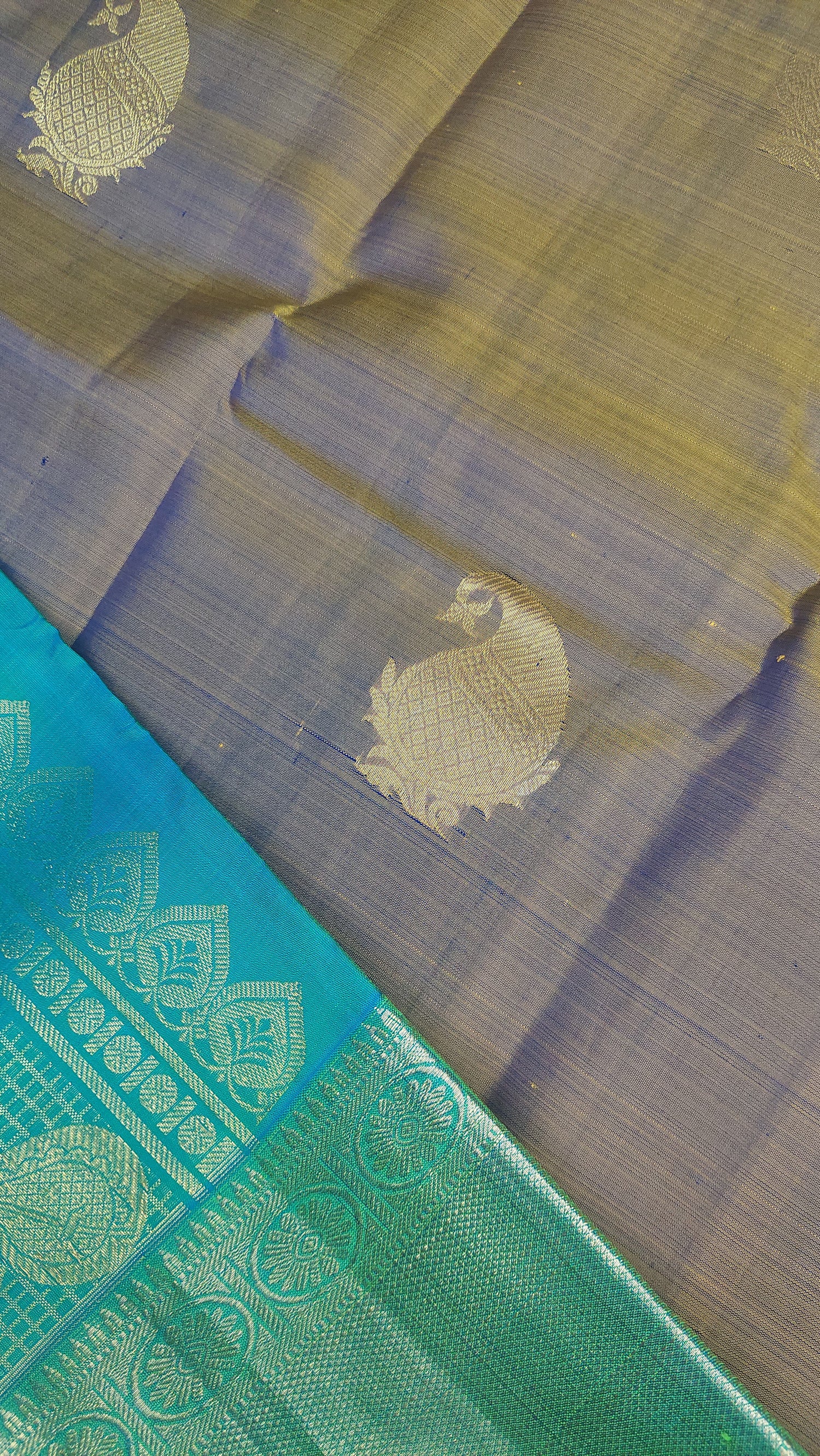 This double tonne pure silk saree with tints of lemon grass green, yellow and blues. Contrasting again with double tone green/ blue pallu/ headpiece. Gold zari border. Running contrasting blouse with border.