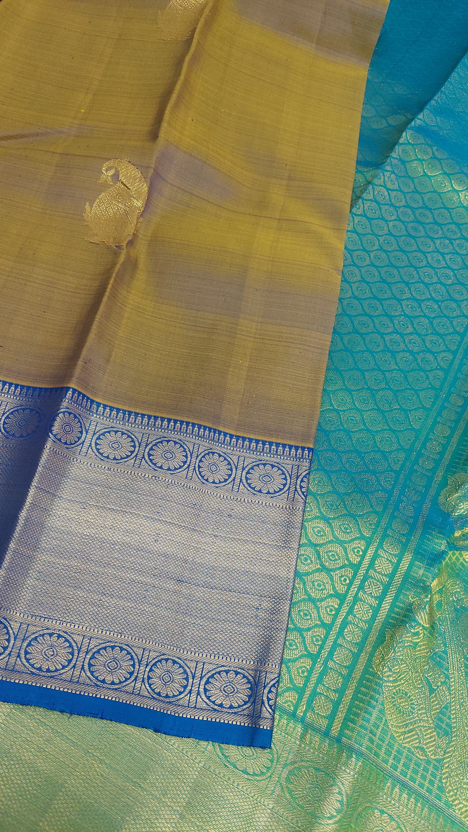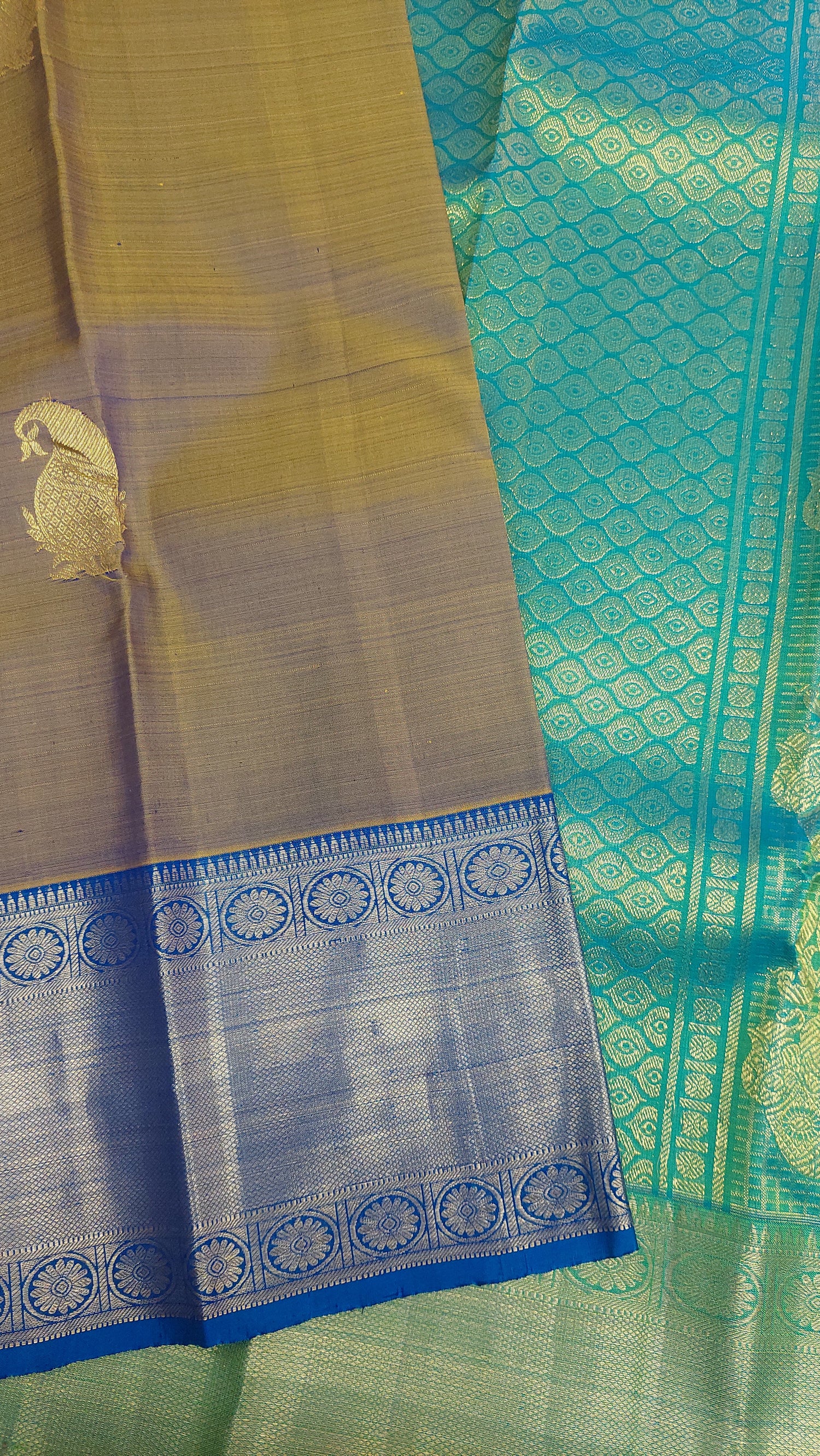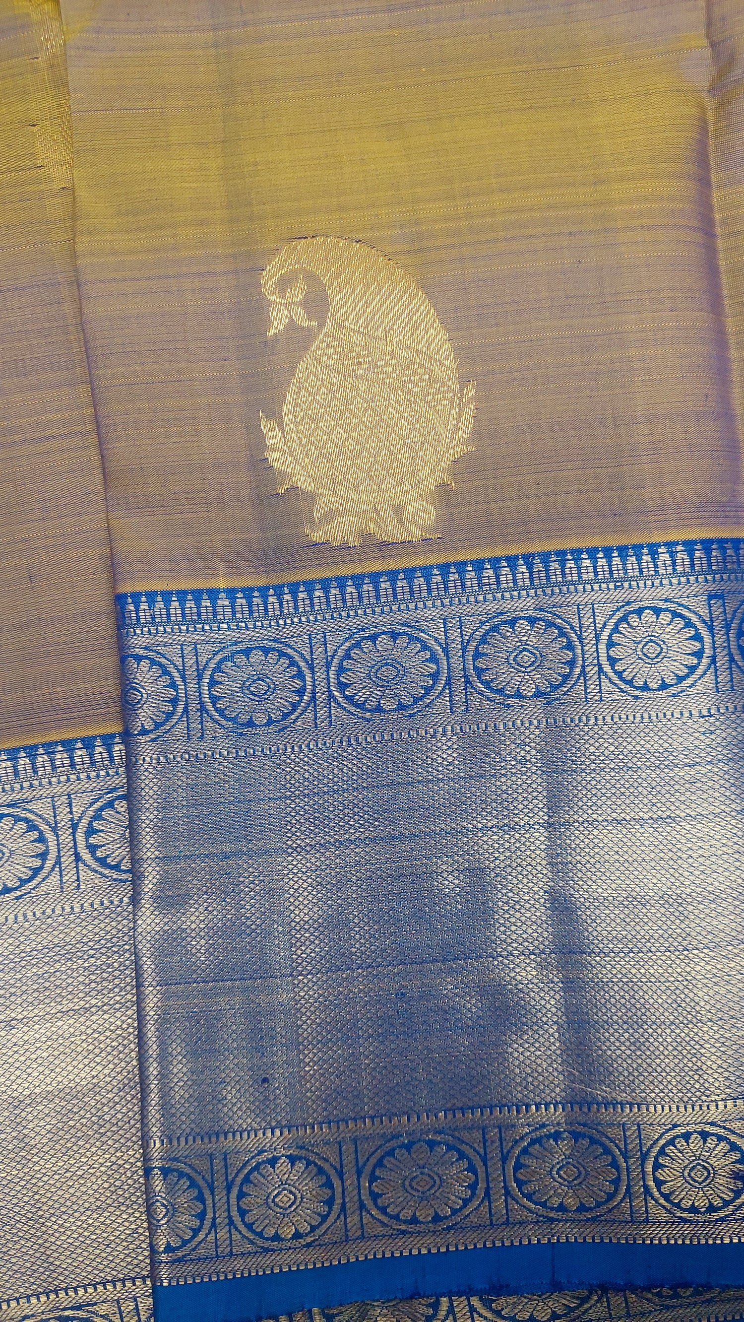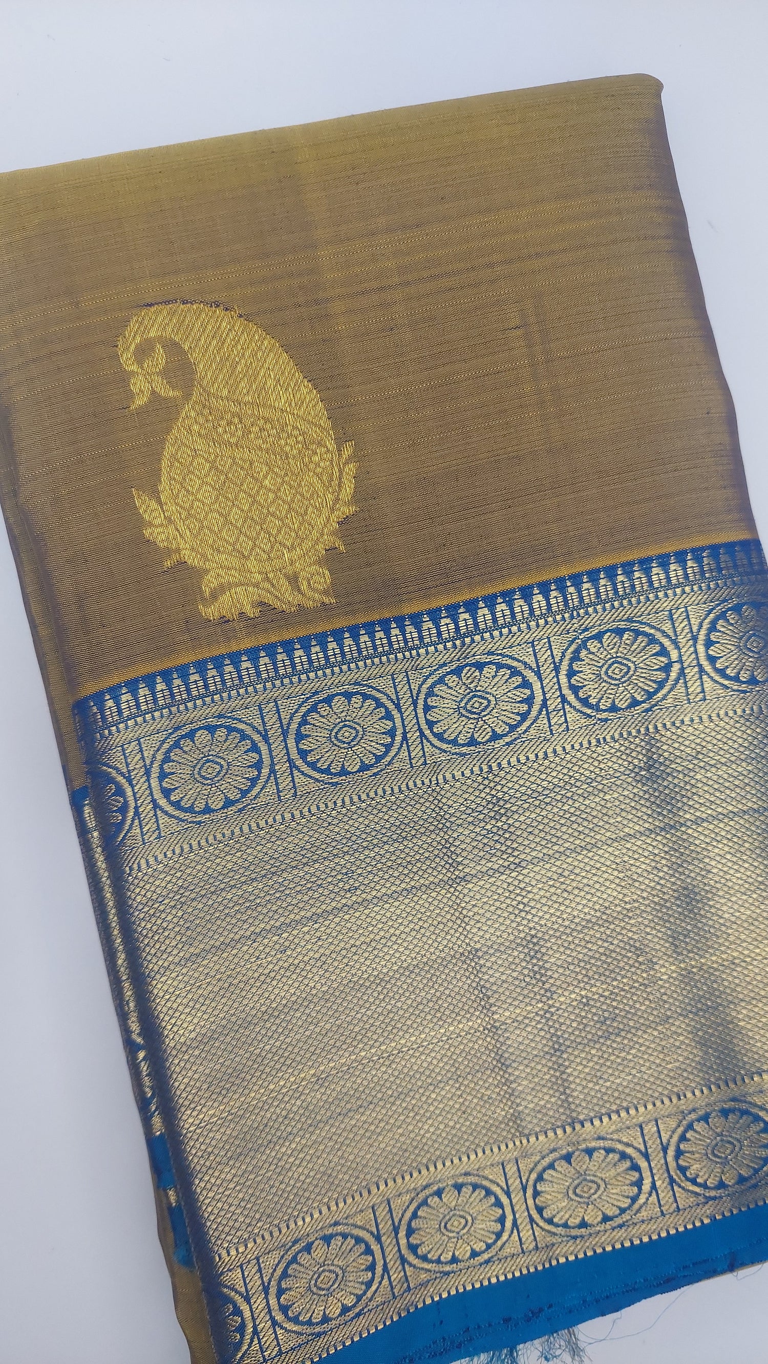 This double tonne pure silk saree with tints of lemon grass green, yellow and blues. Contrasting again with double tone green/ blue pallu/ headpiece. Gold zari border. Running contrasting blouse with border.