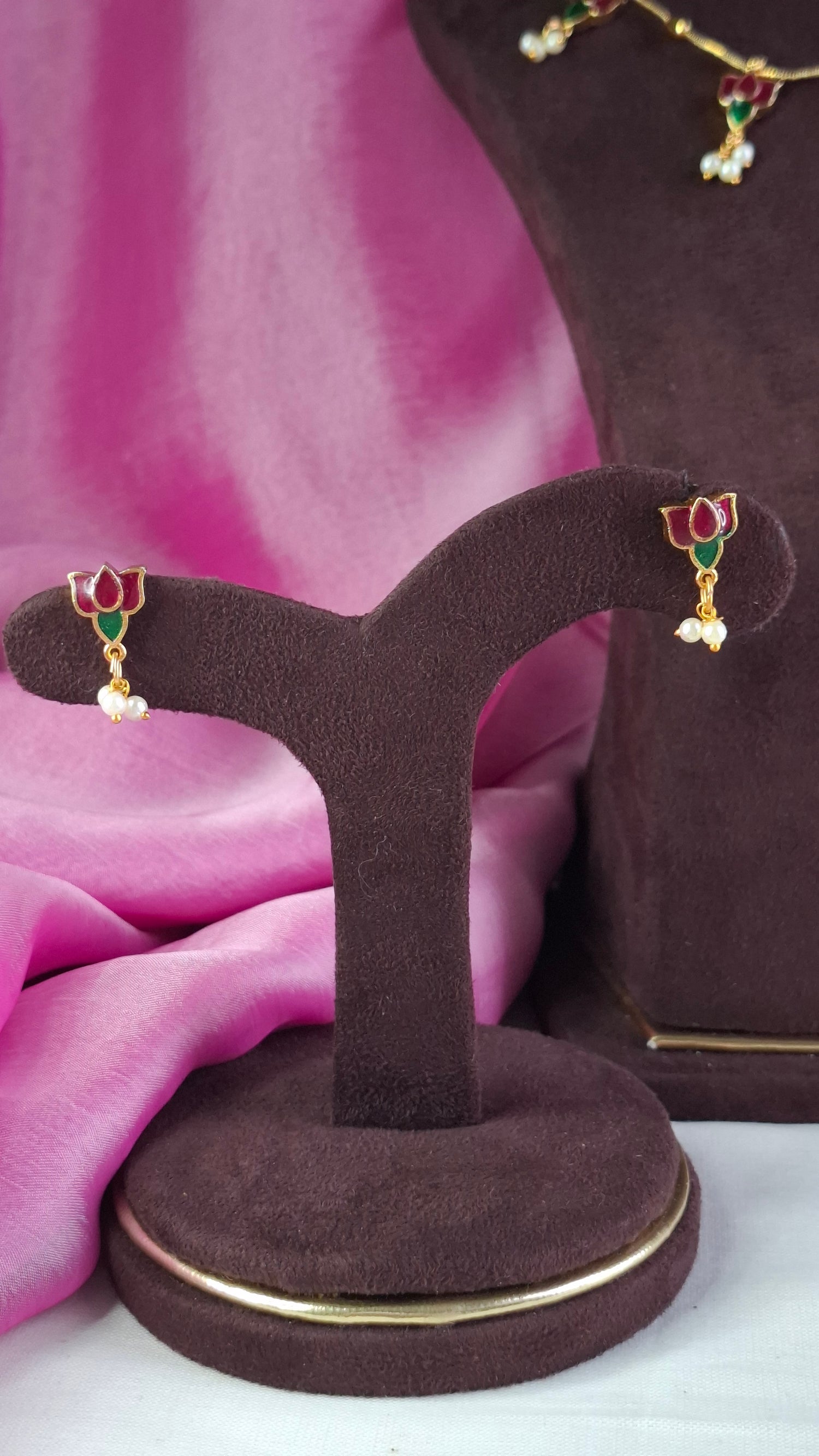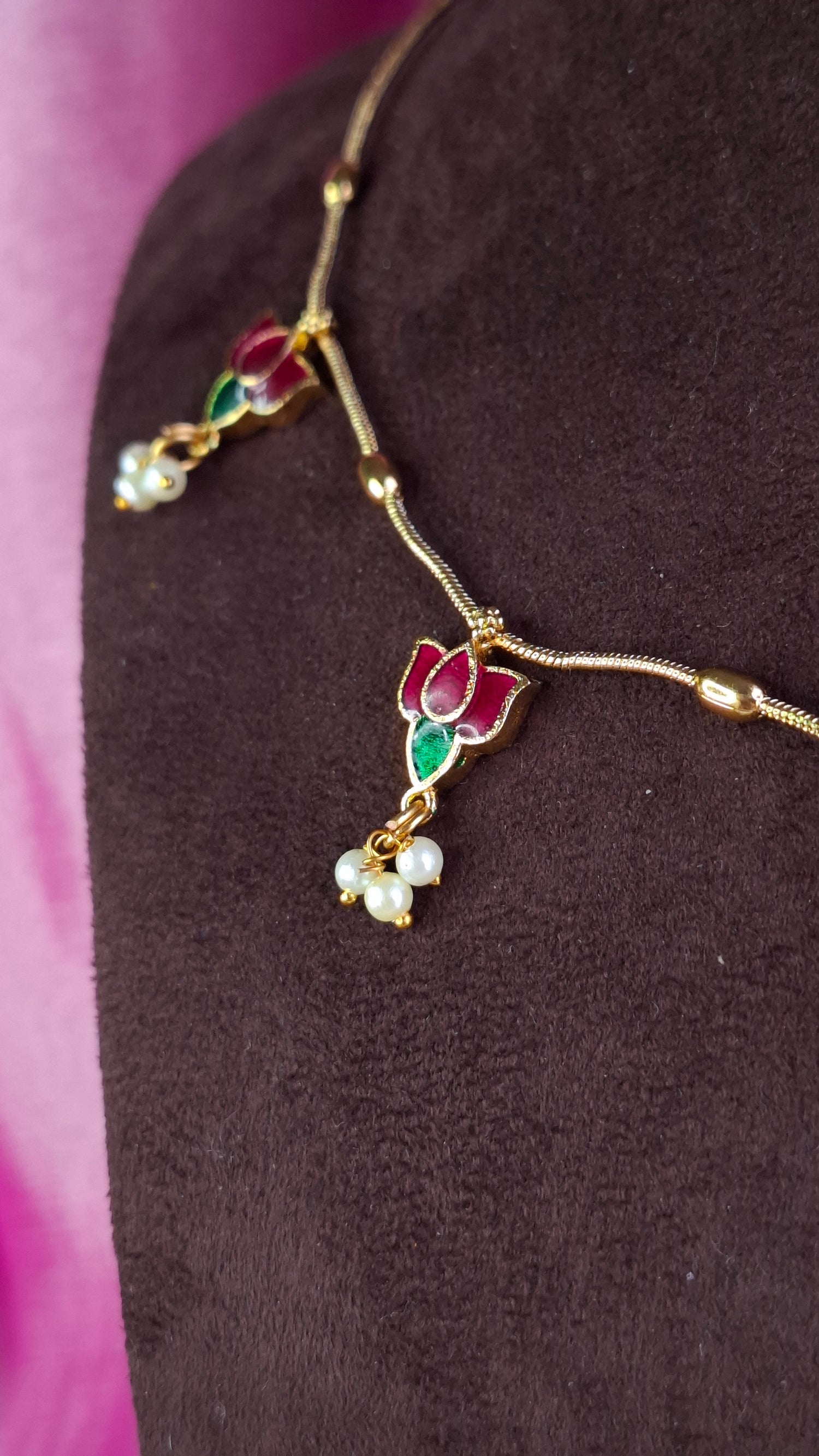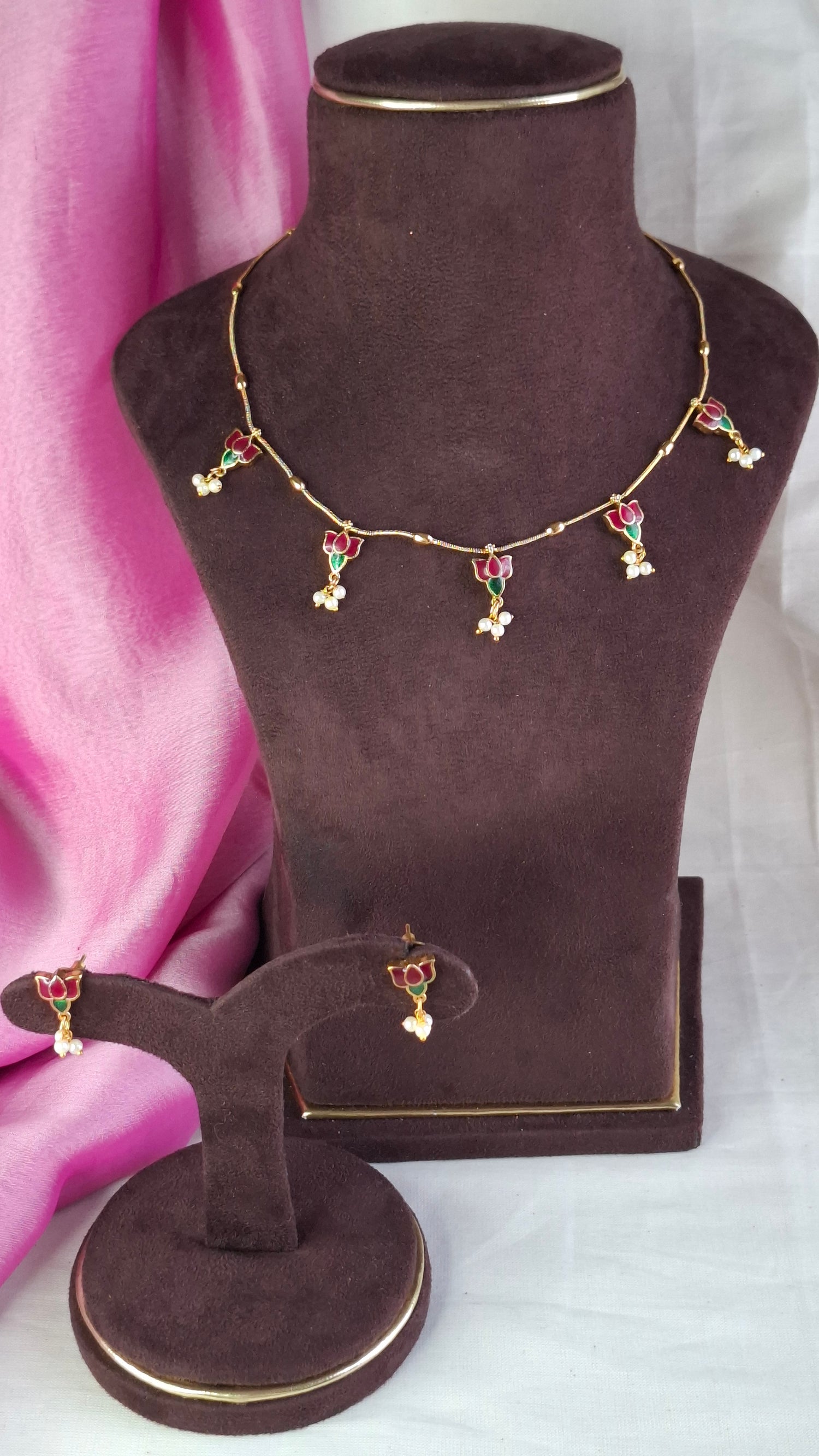 Simple gold chain with lotus motifs. Comes with matching earrings.