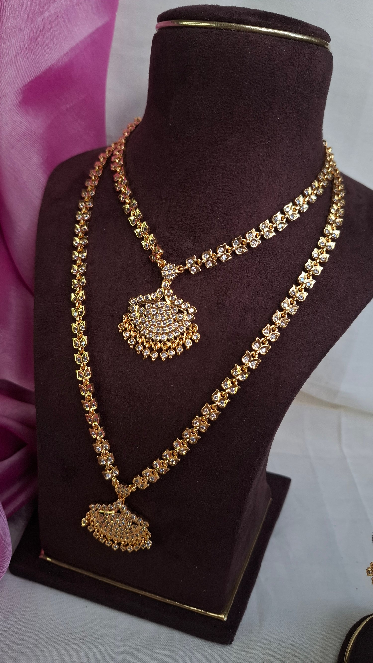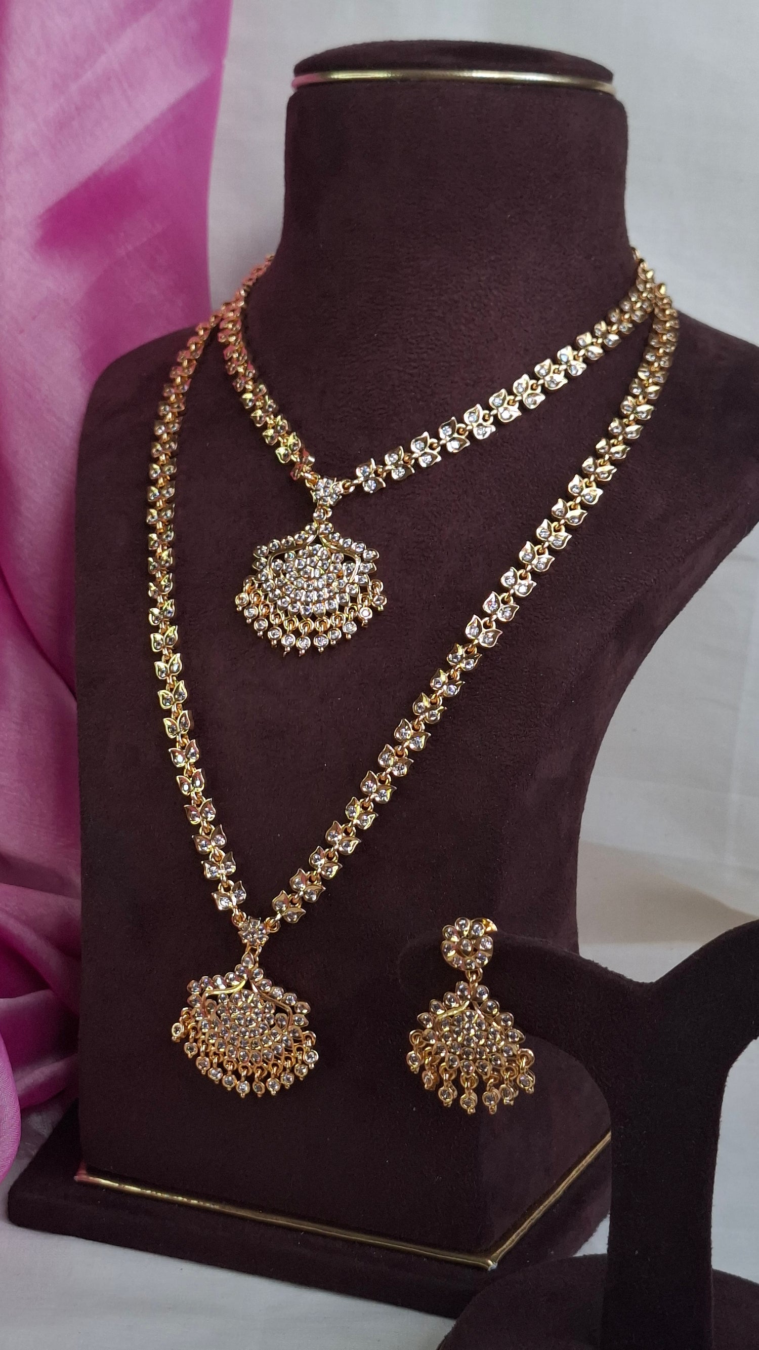 Yellow gold finish impon short & long necklace with A.D. stones. Comes with matching screw type earrings.