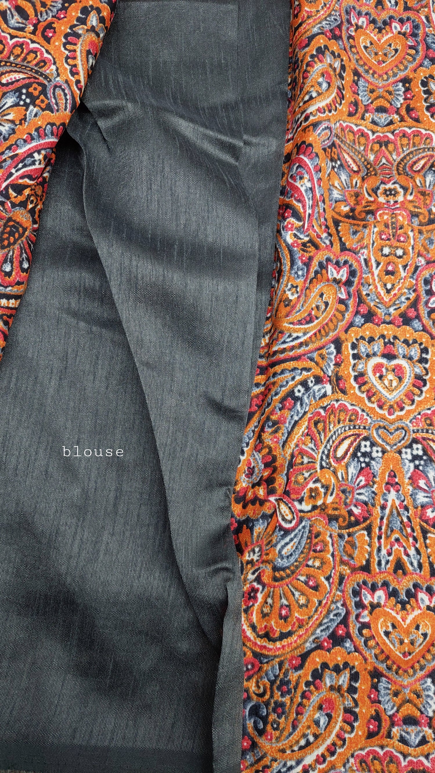 Kalamkari printed designer saree with grey stitched on border. Contrasting grey plain blouse material.