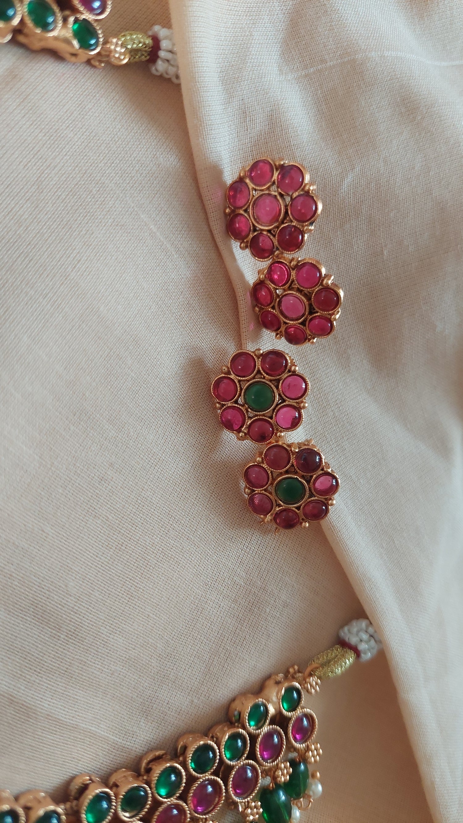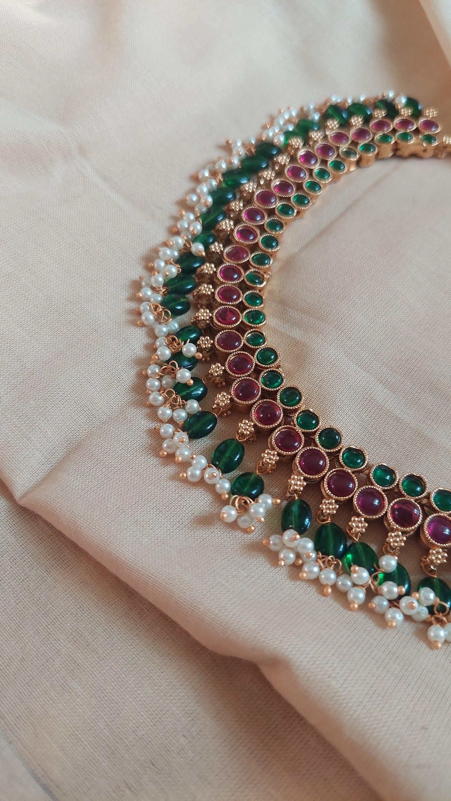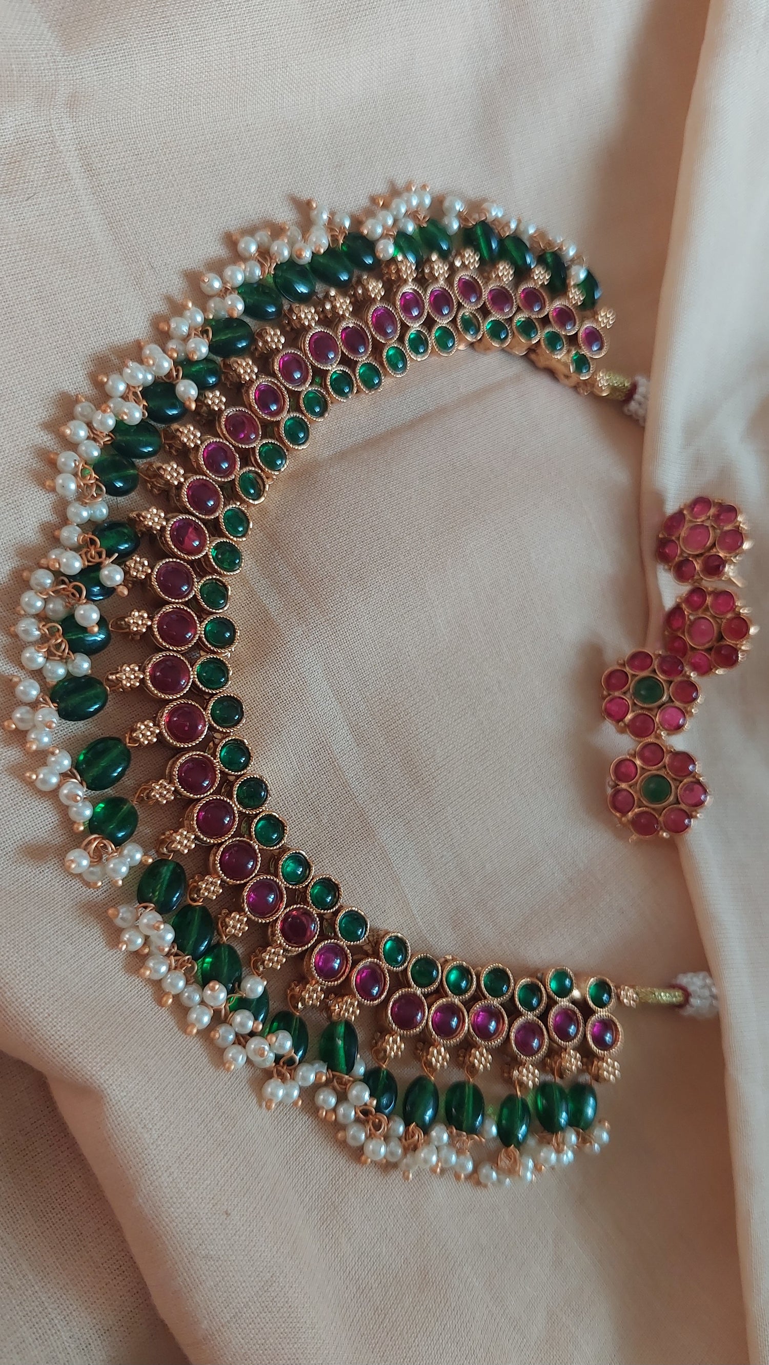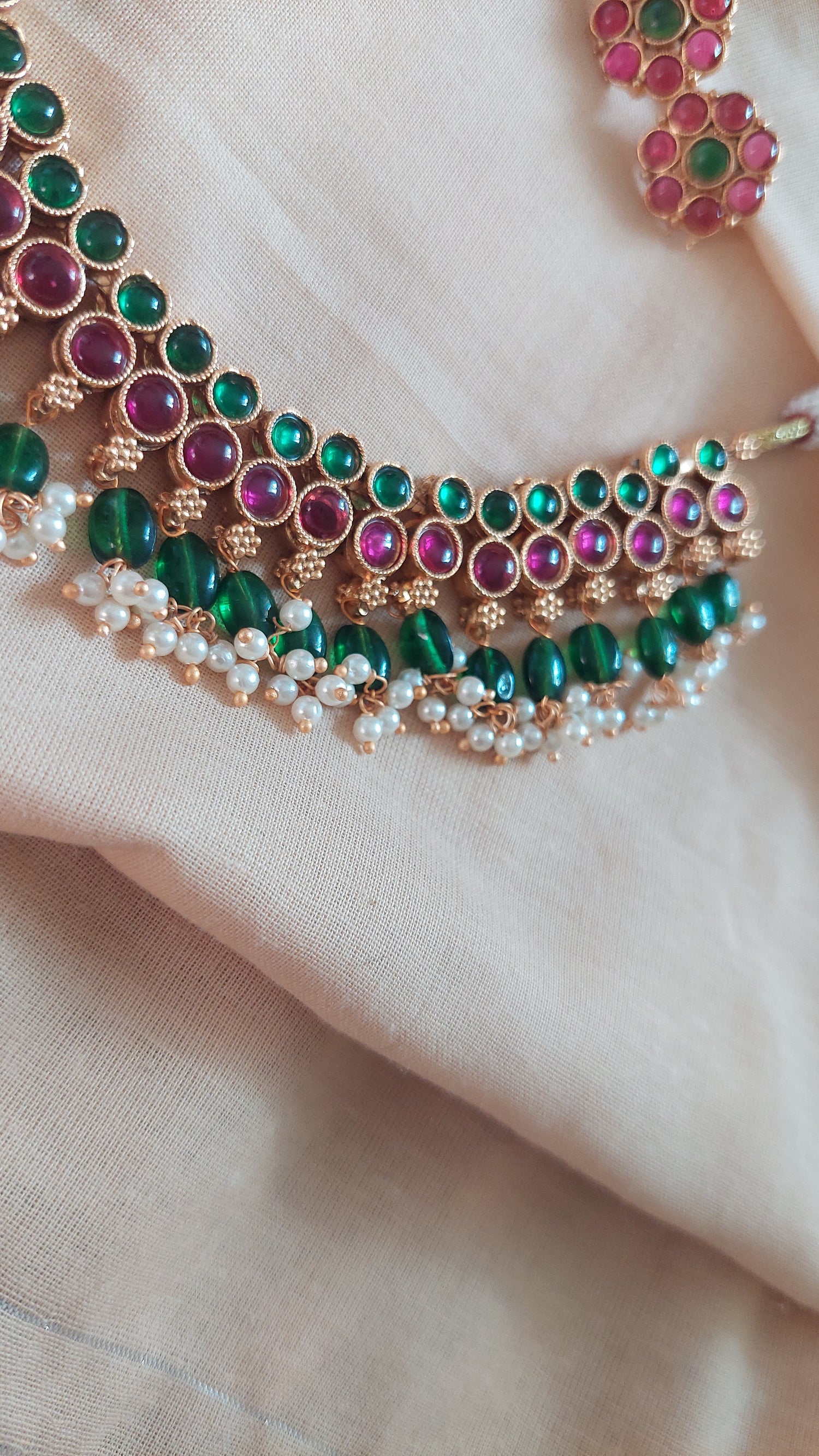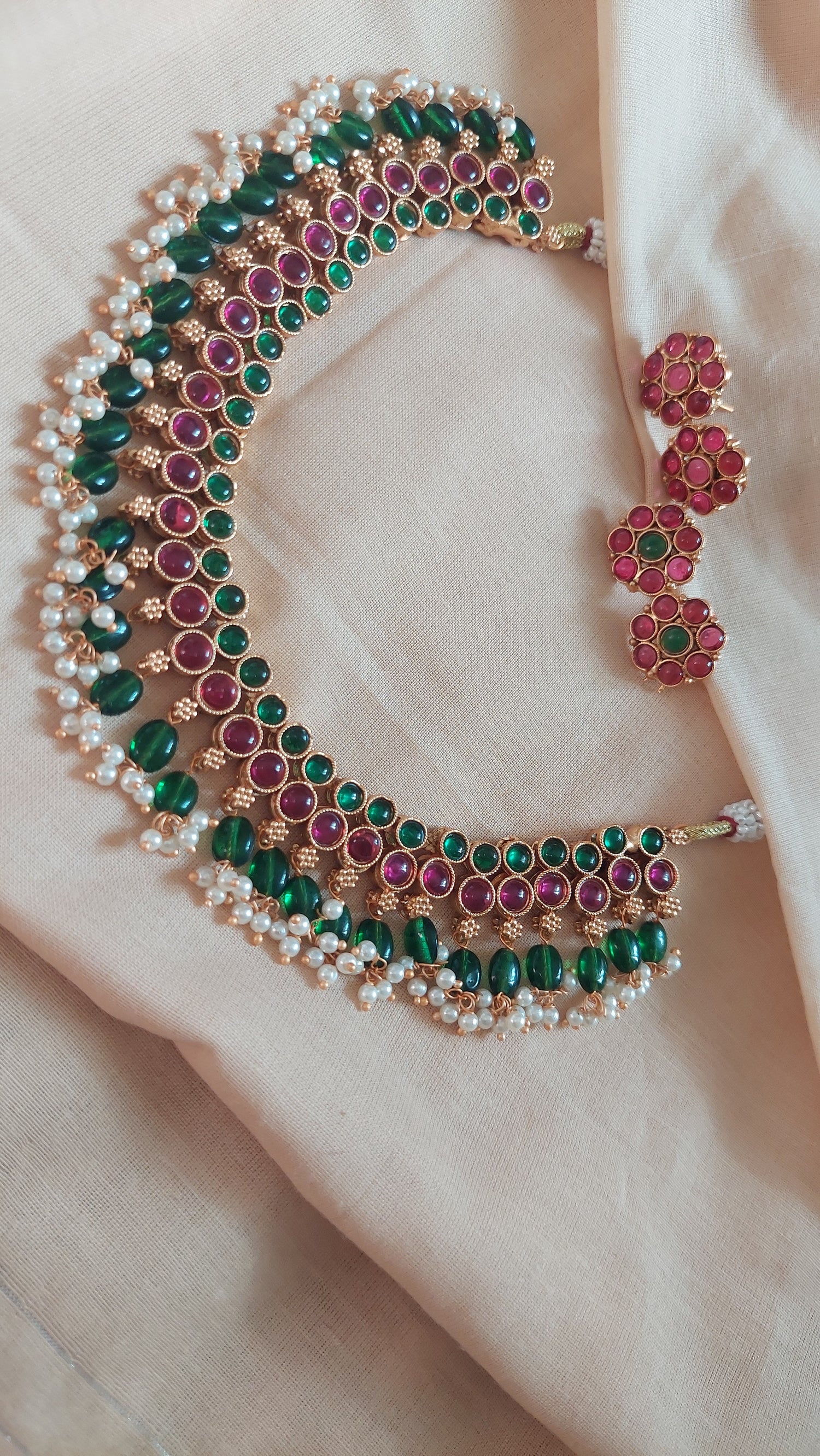 Short kemp short necklace with green beads and white pearls. Comes with x2 pairs of matching stud earrings.