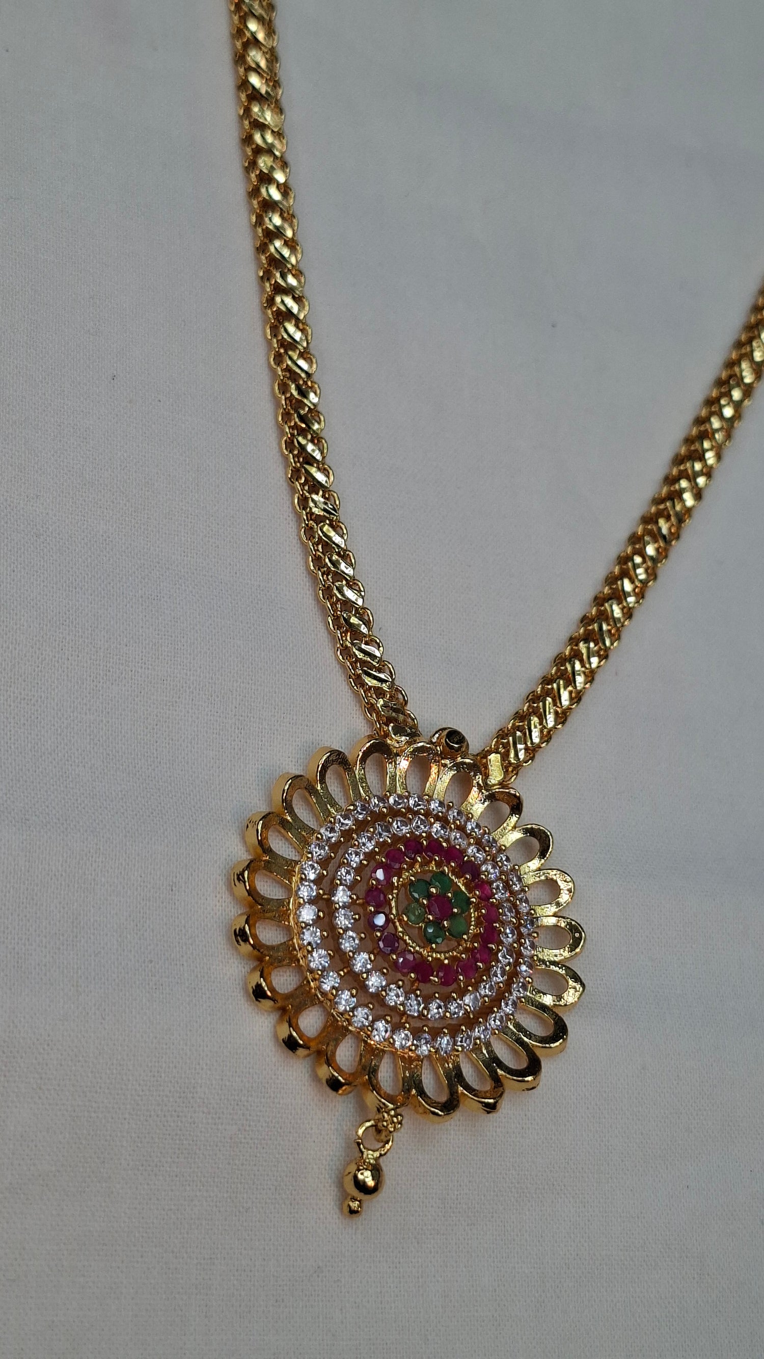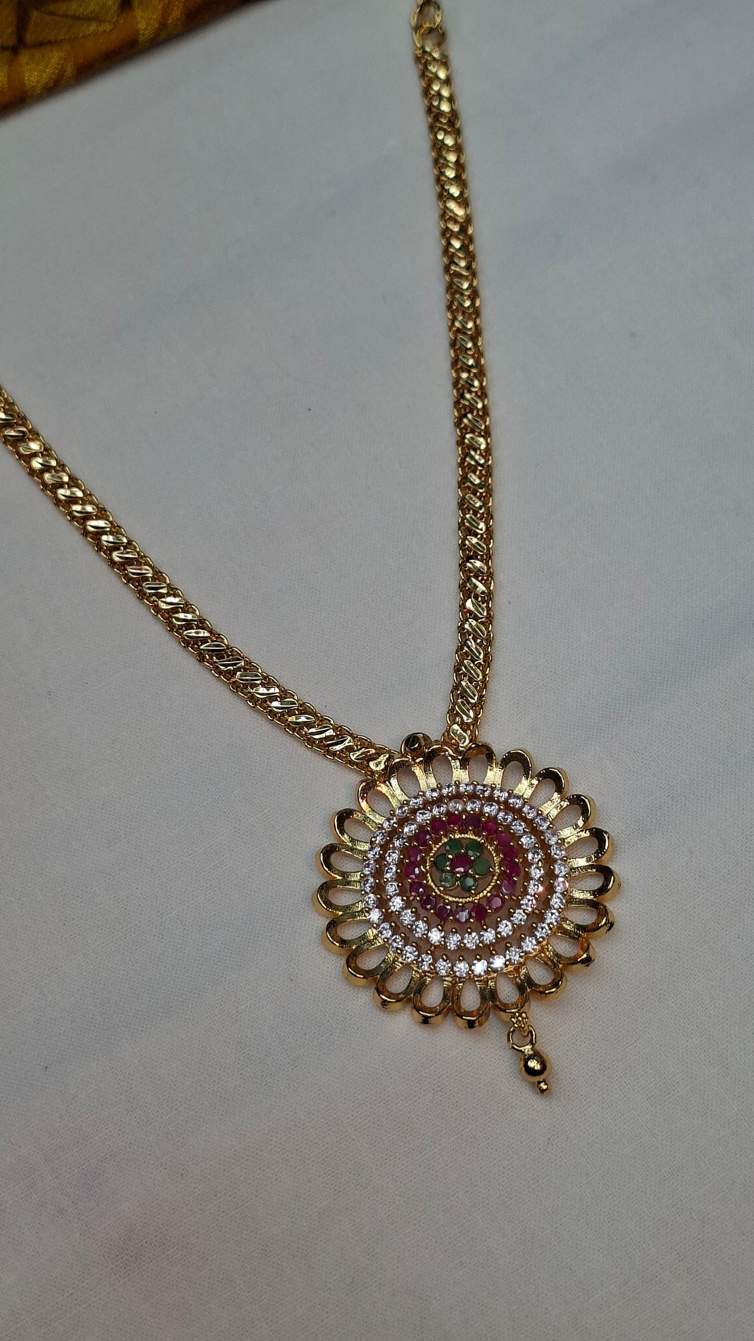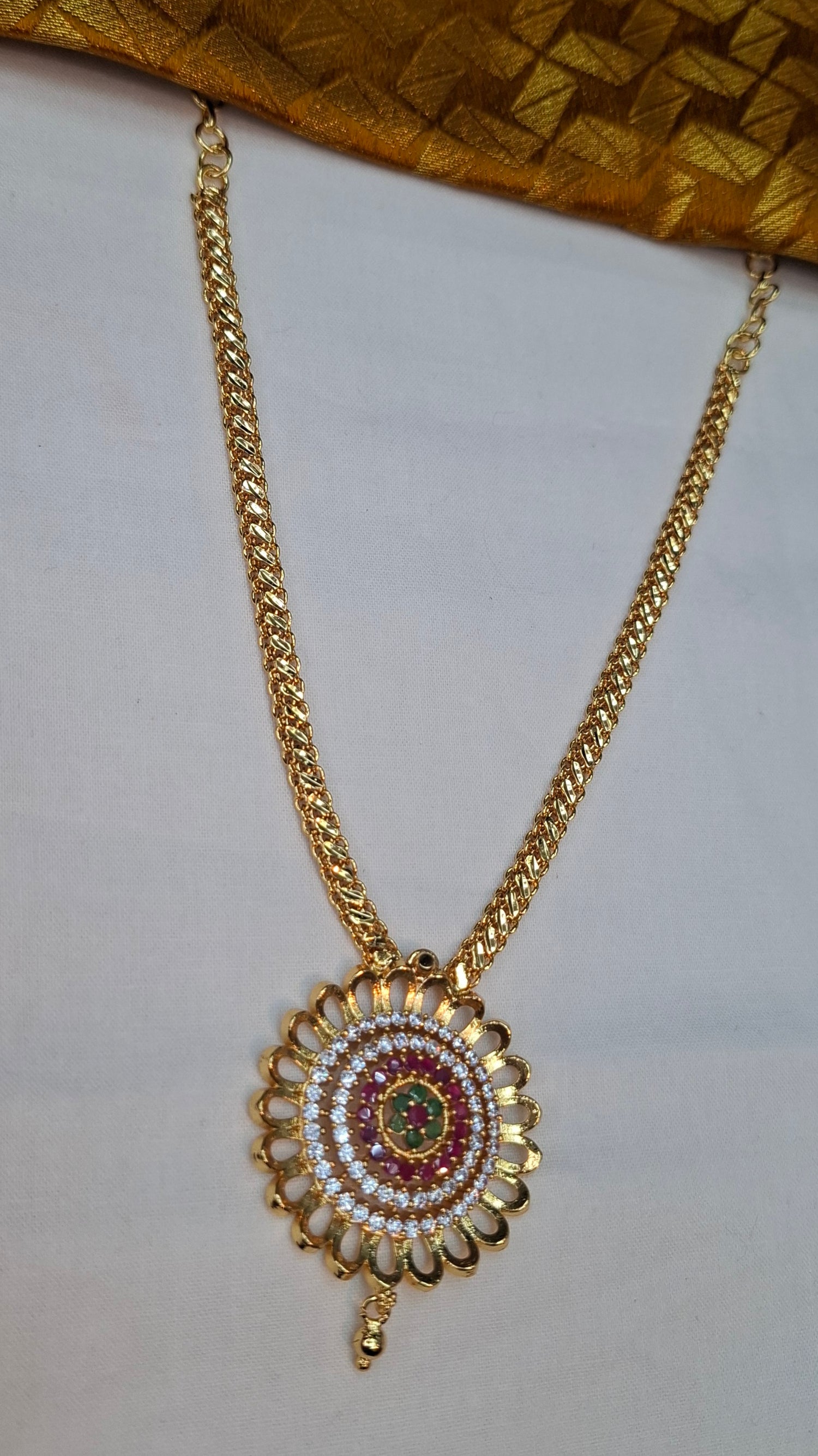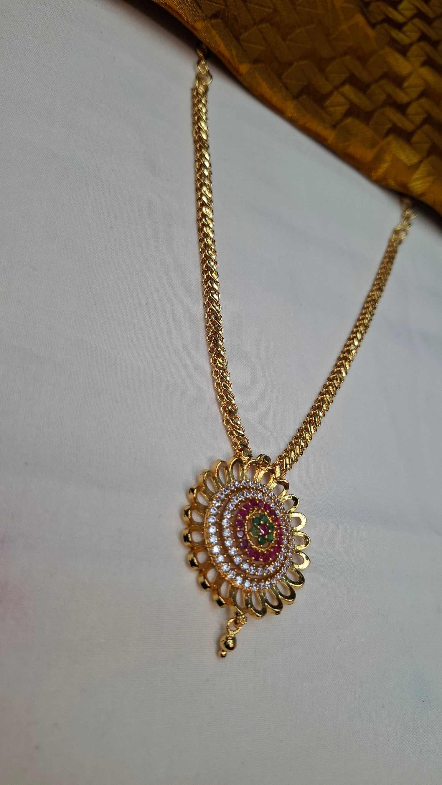 Gold short necklace with A.D. stones.