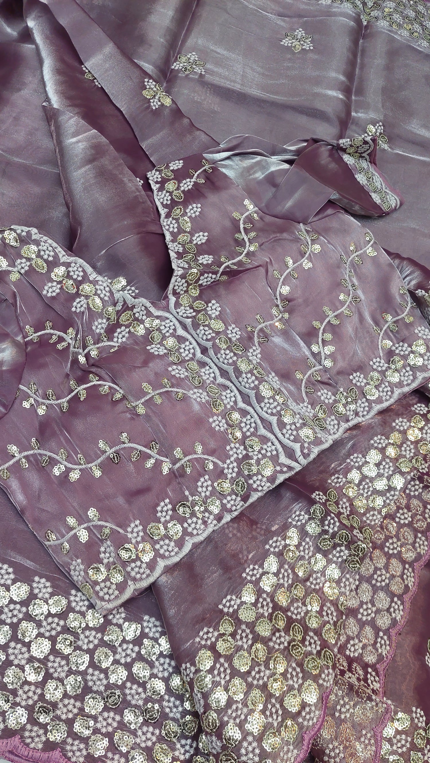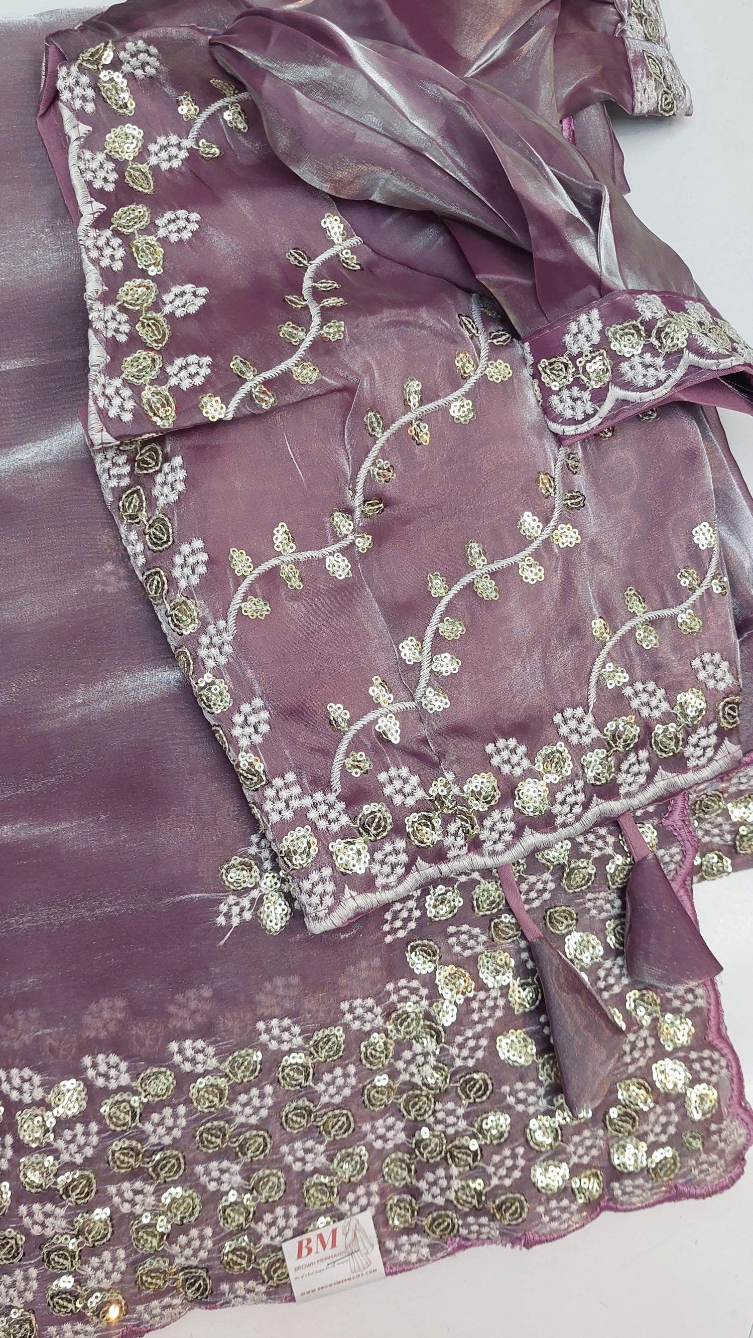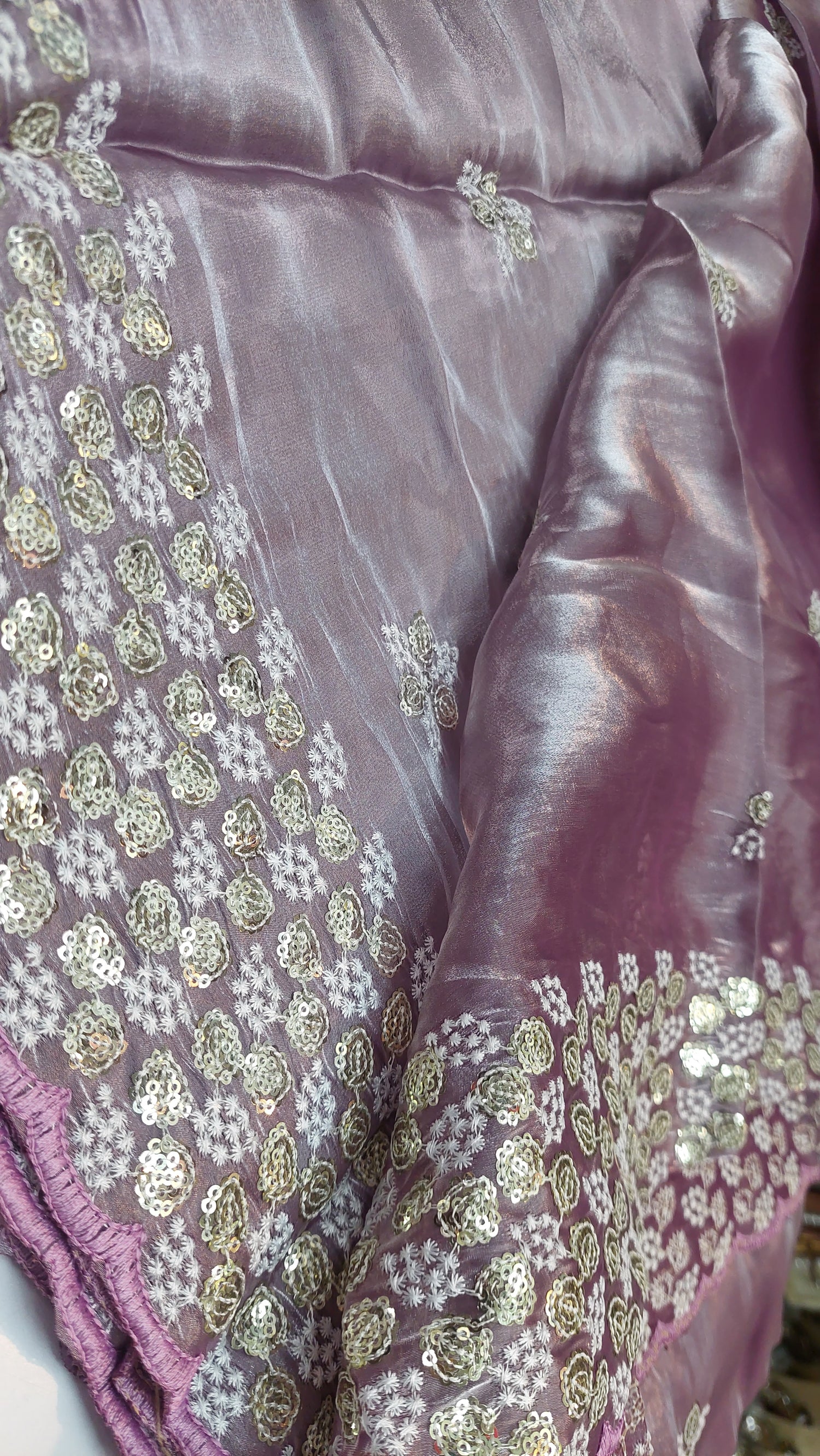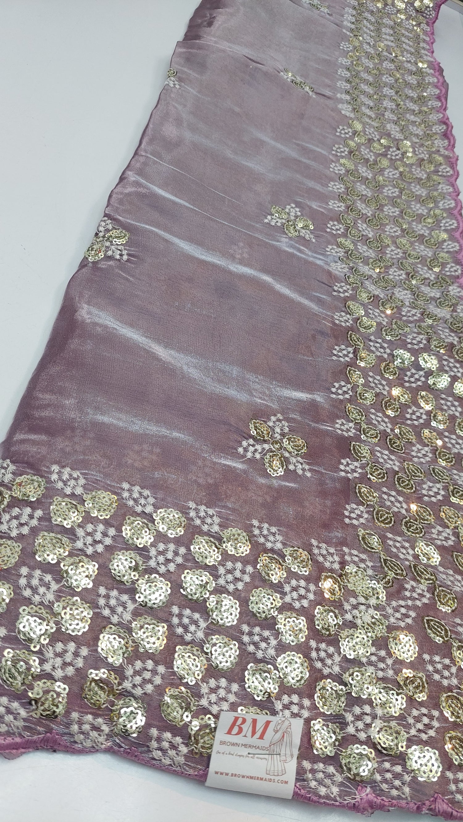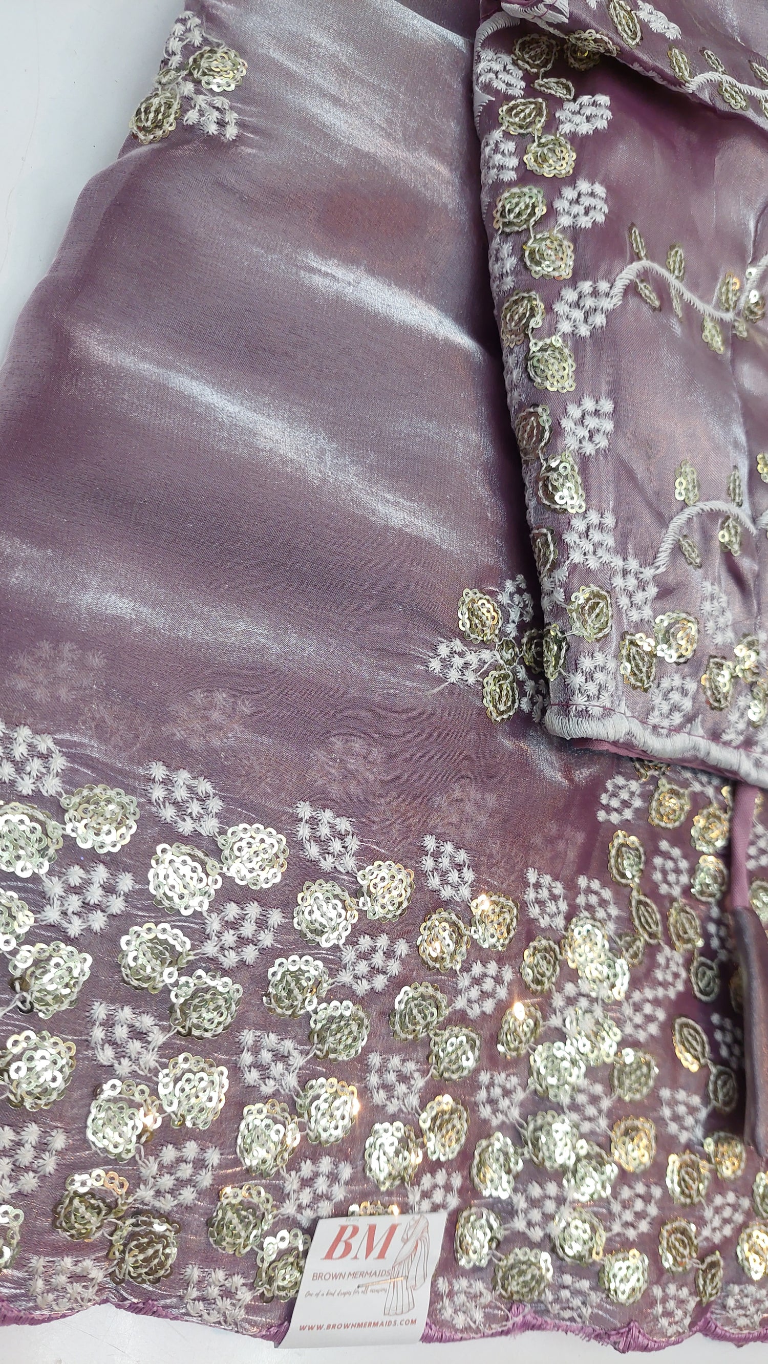 Lilac shimmer tissue designer saree either champagne gold sequins froal border. Comes with ready made blouse.