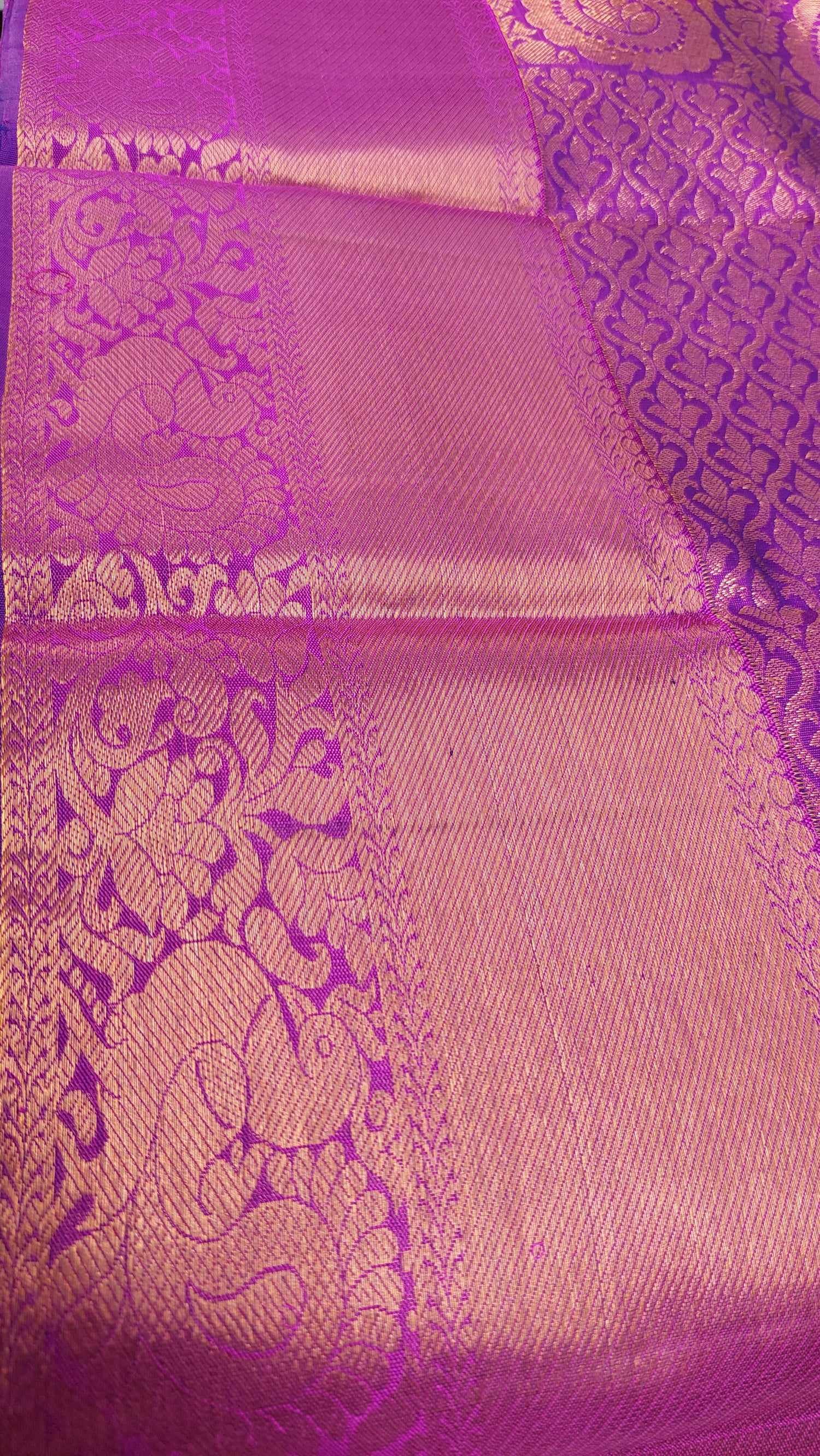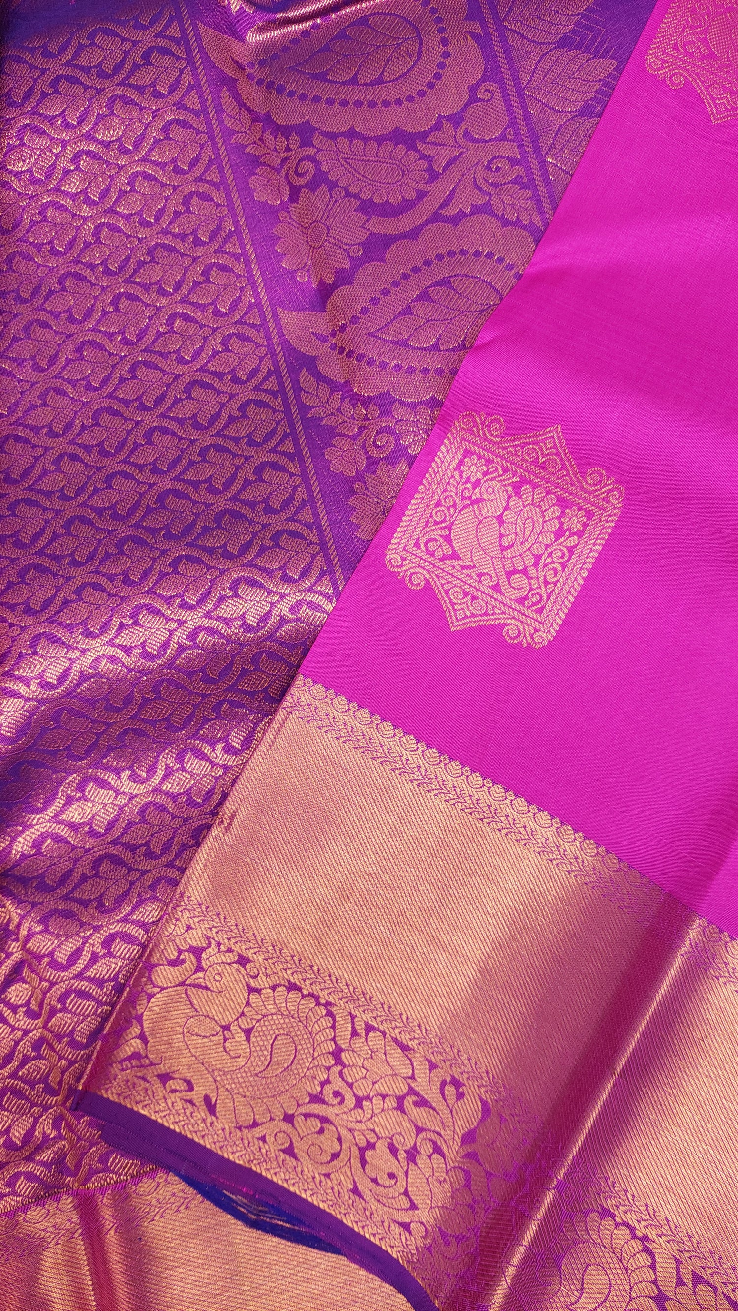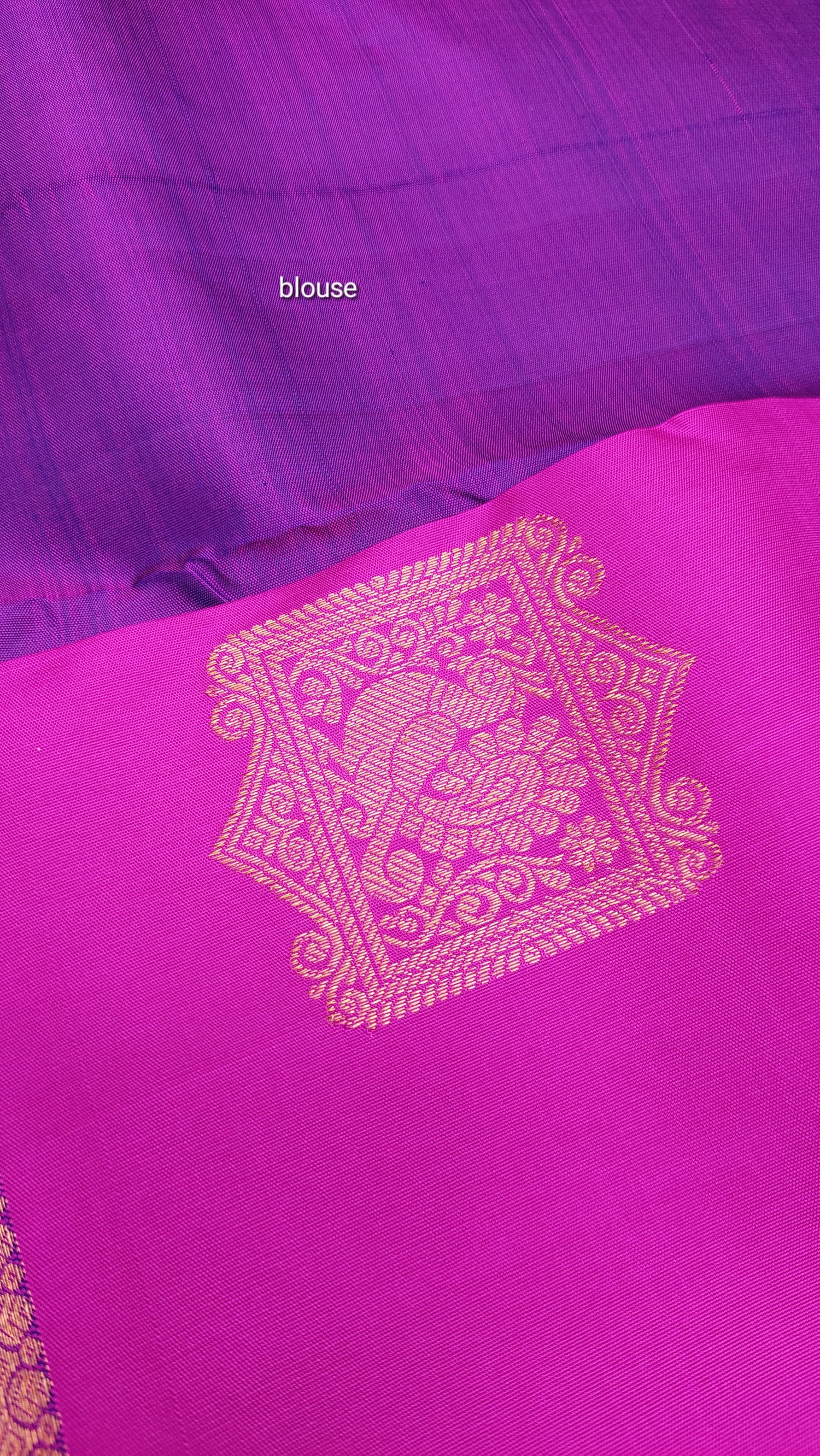 Magenta Kanjipuram Silk saree with contrasting purple border. Peacock gold zari motifs throughout this saree. Contrasting purple running blouse.