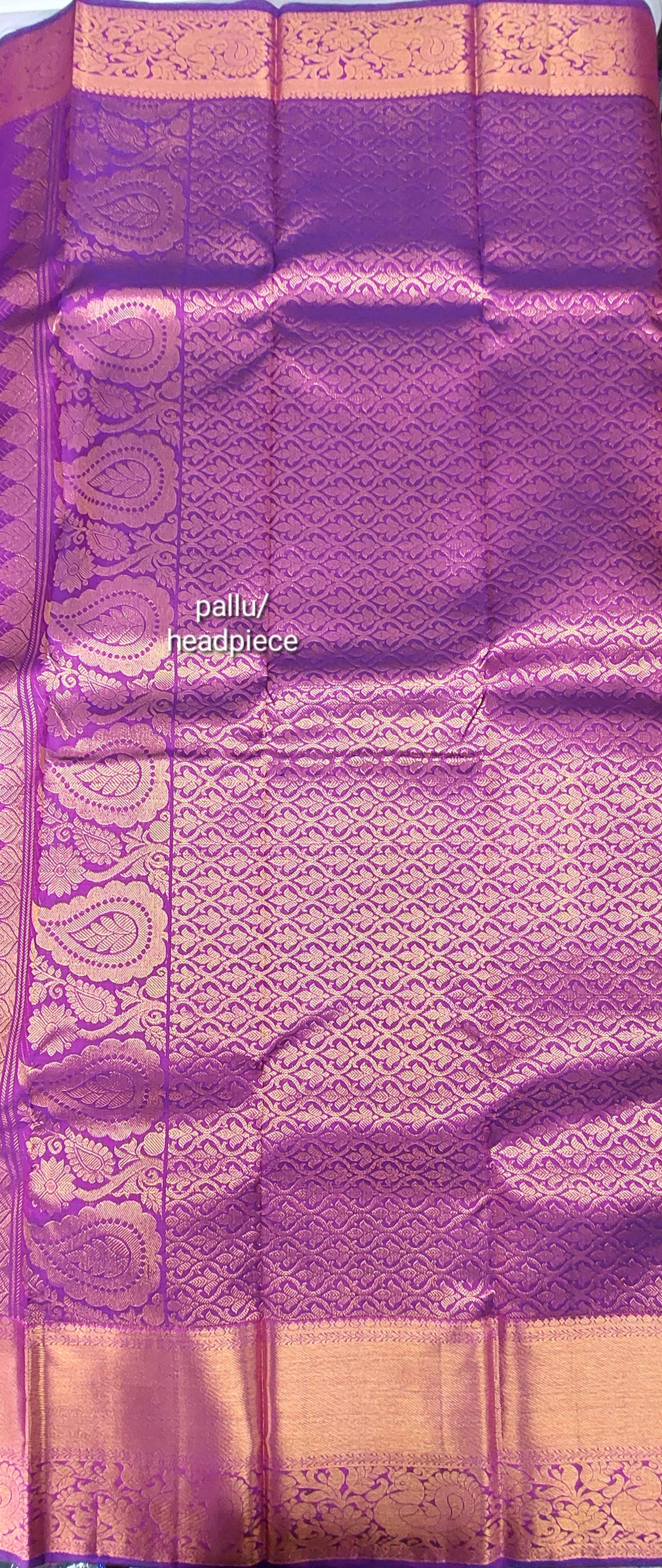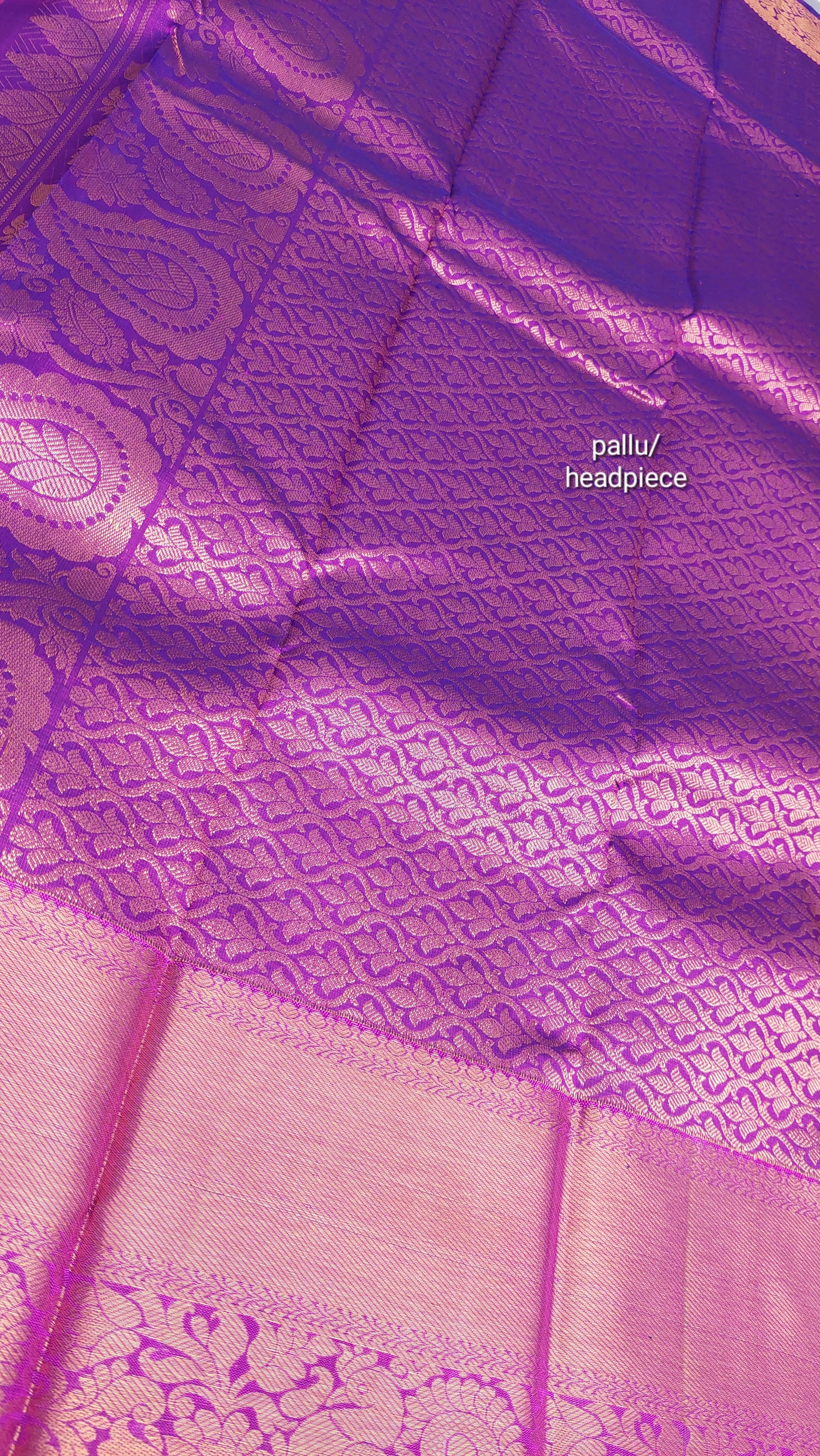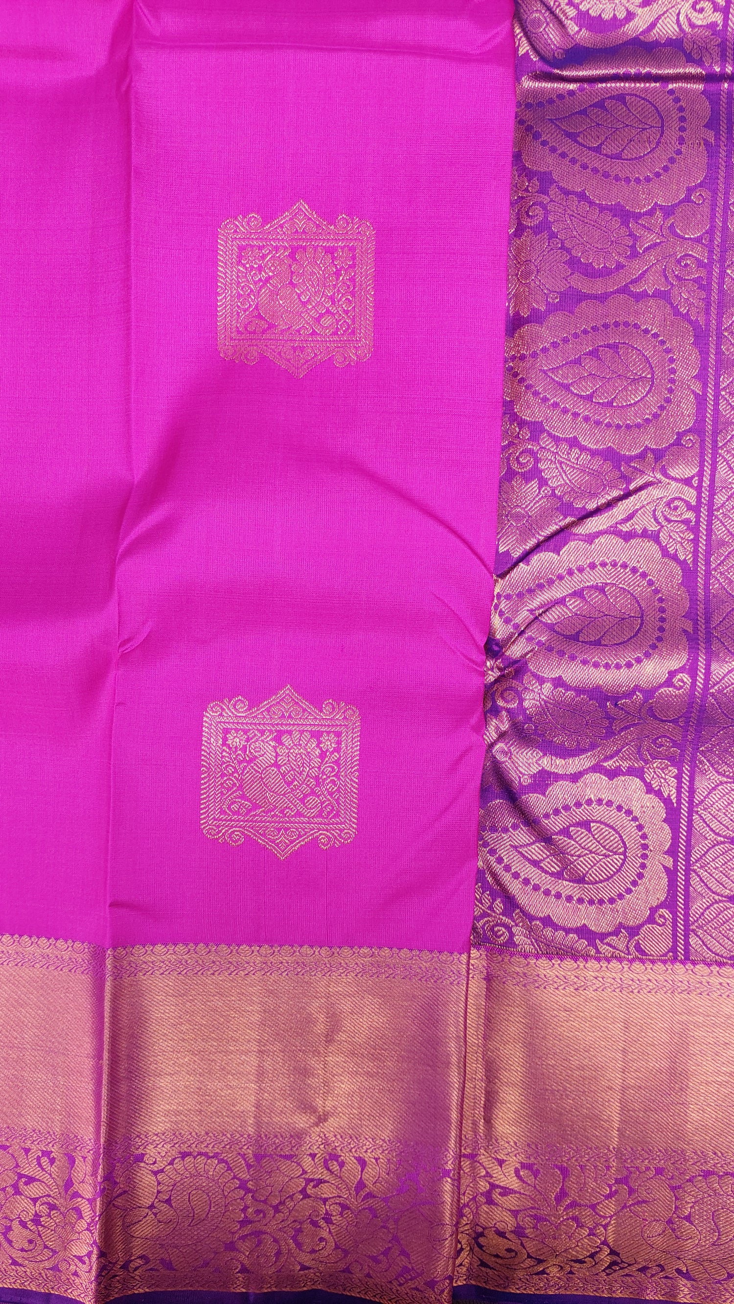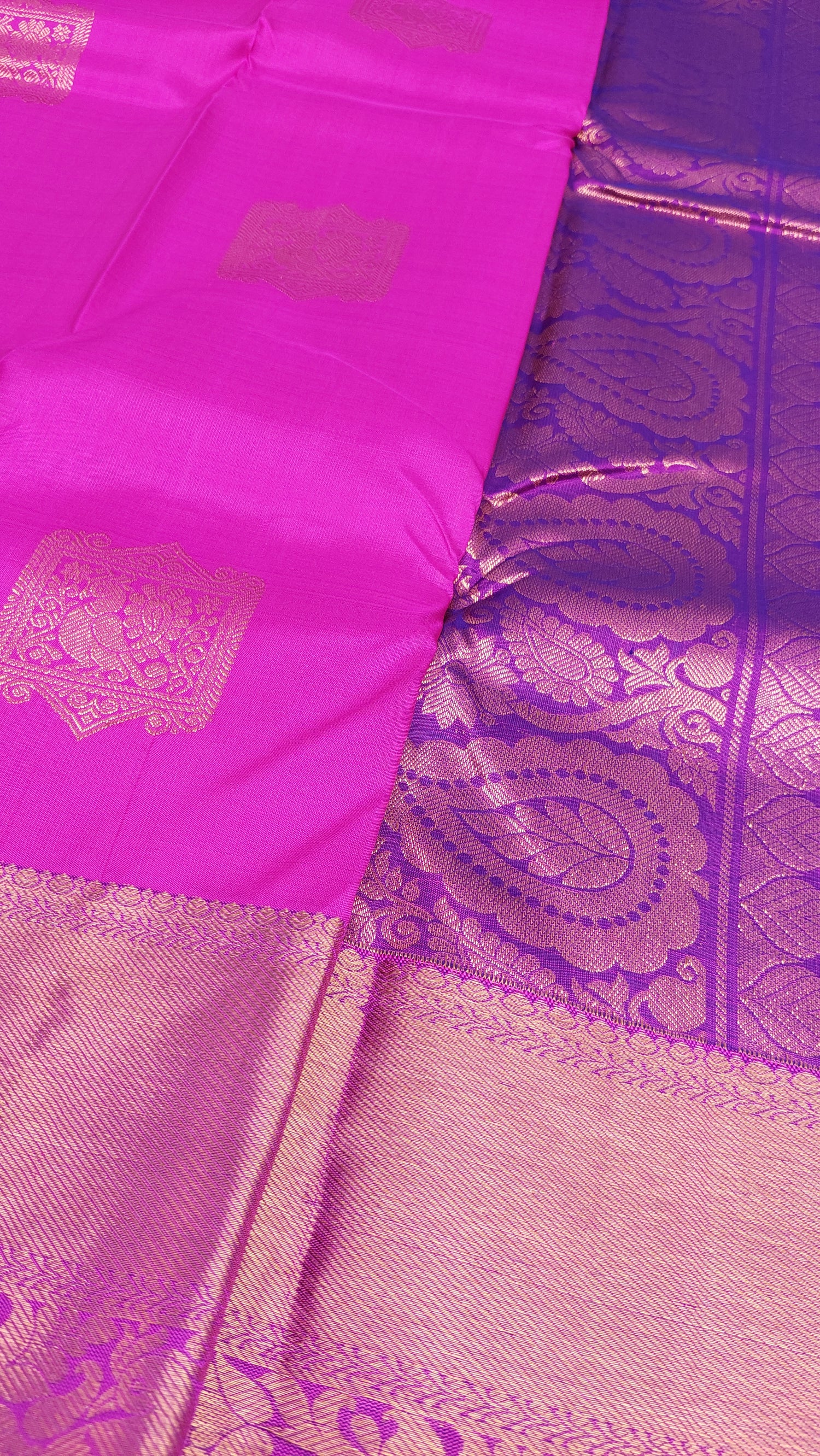 Magenta Kanjipuram Silk saree with contrasting purple border. Peacock gold zari motifs throughout this saree. Contrasting purple running blouse.