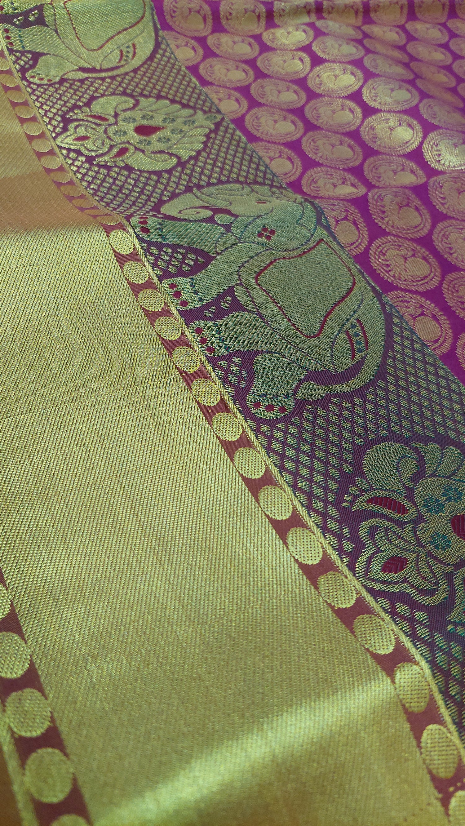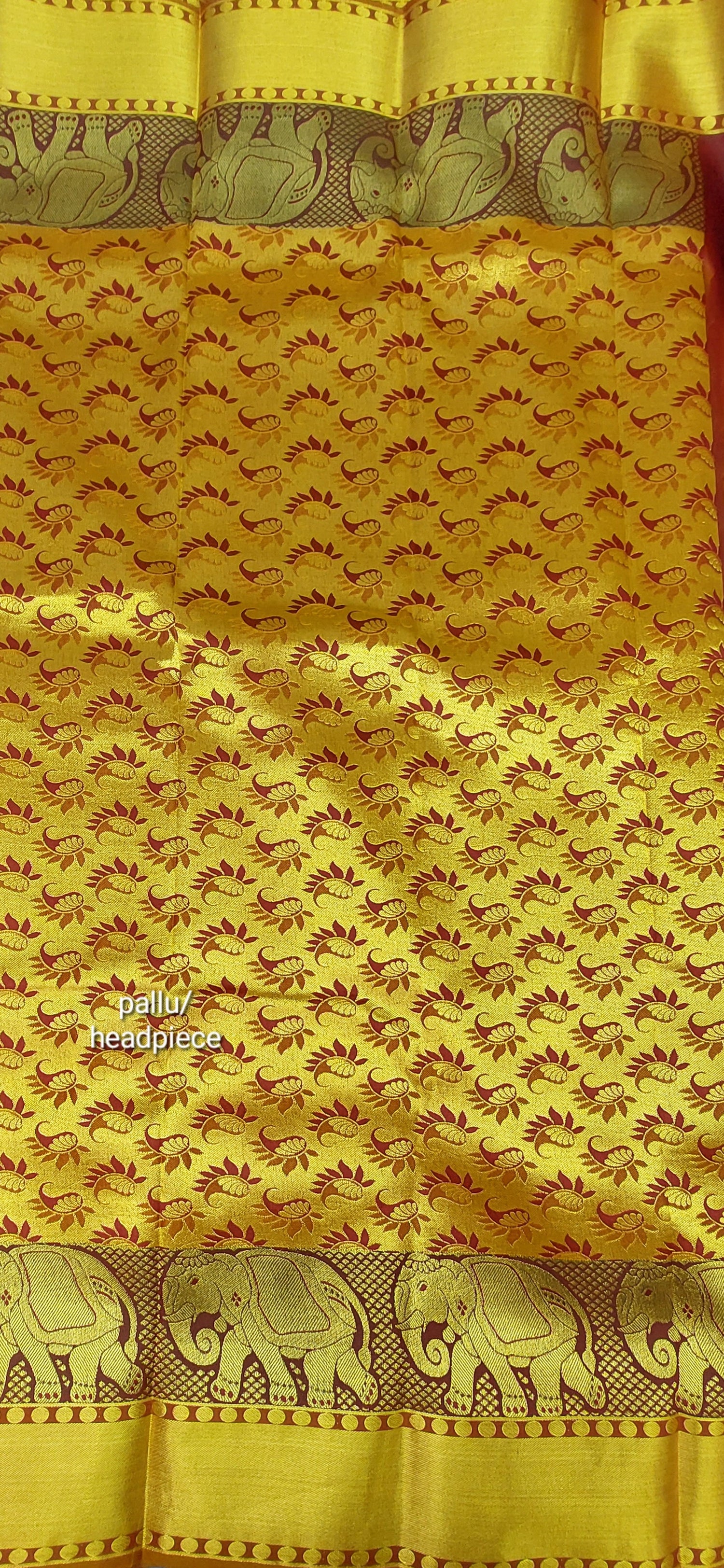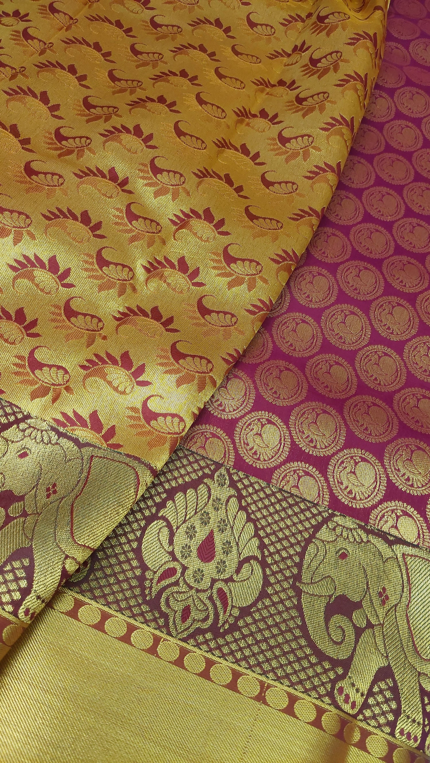 Double tonne magenta red Kanjipuram Silk saree with gold zari border. Contrasting yellow gold pallu/ headpiece. Contrasting running blouse.