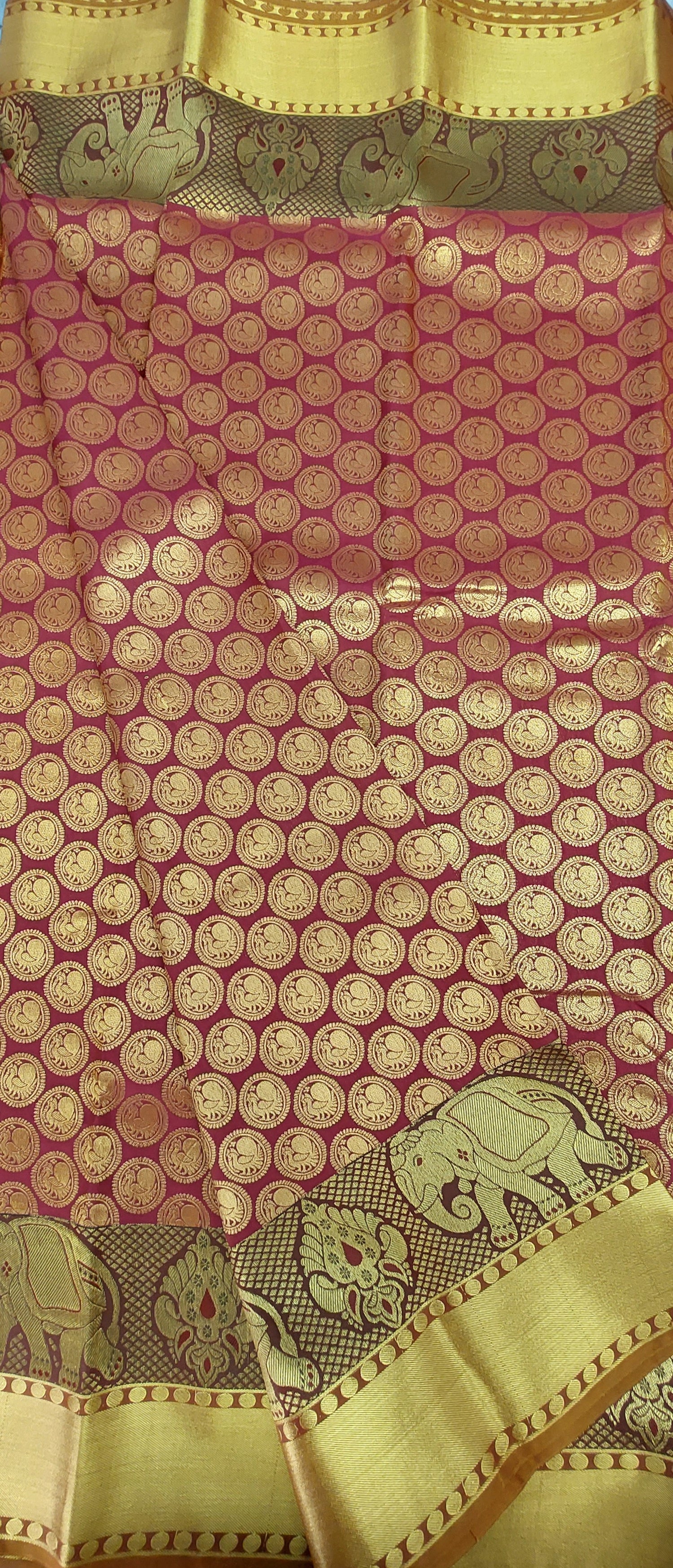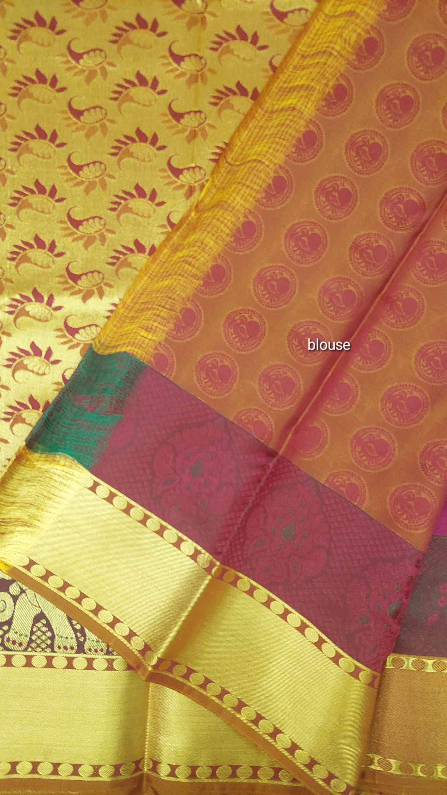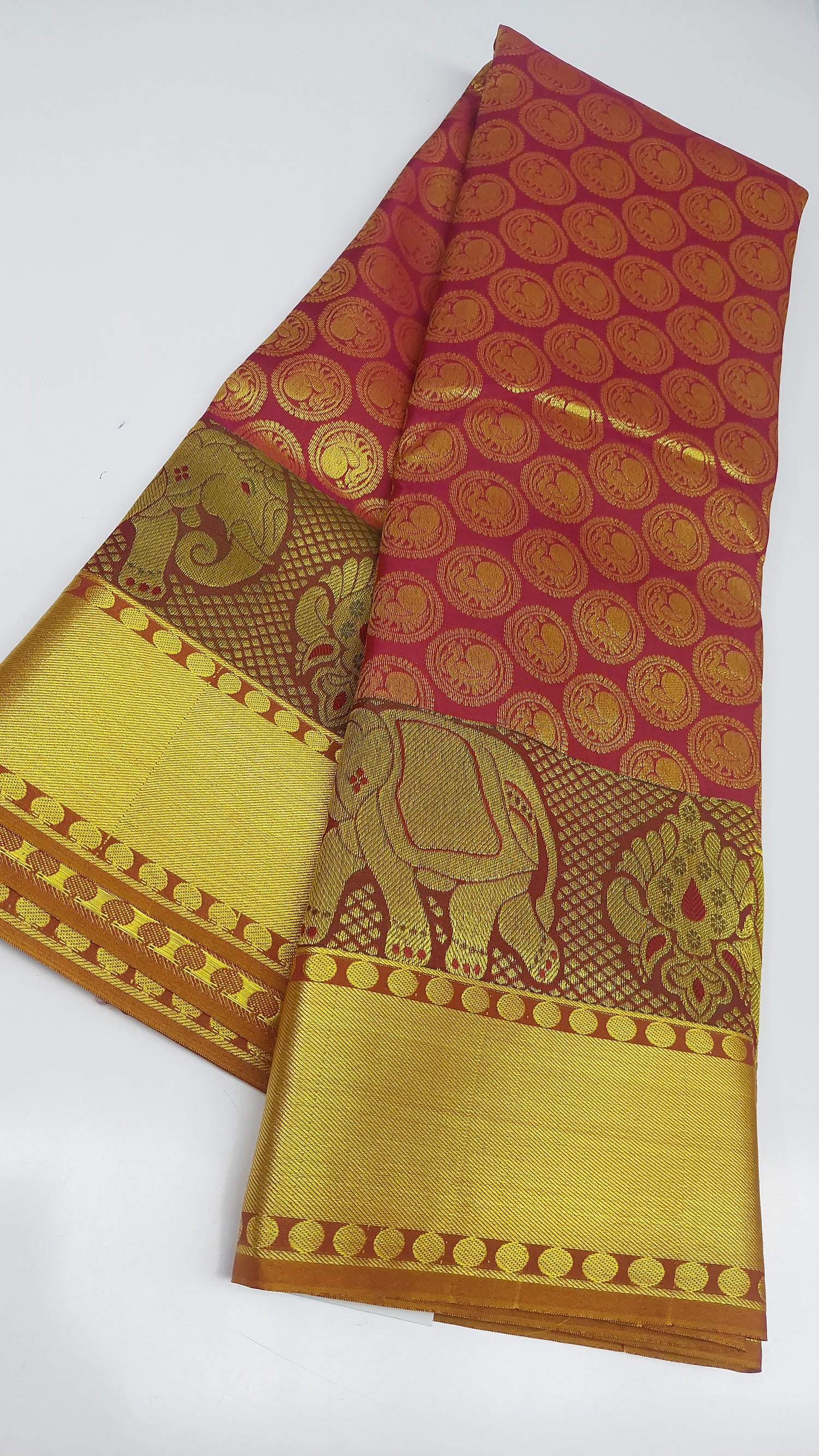 Double tonne magenta red Kanjipuram Silk saree with gold zari border. Contrasting yellow gold pallu/ headpiece. Contrasting running blouse.