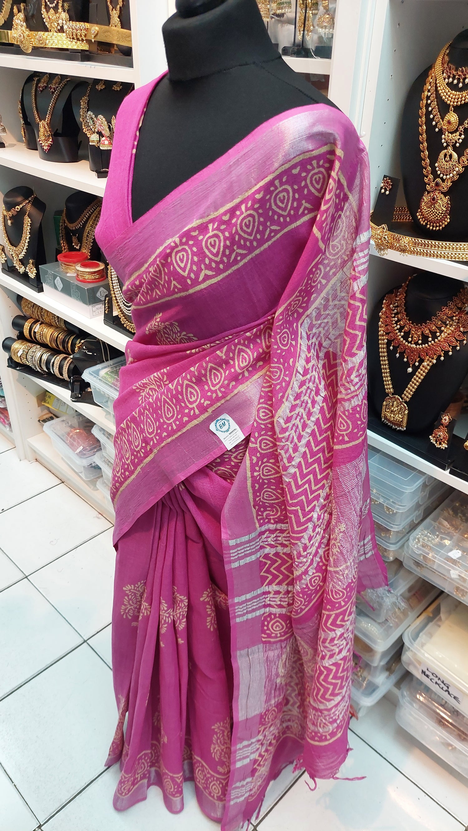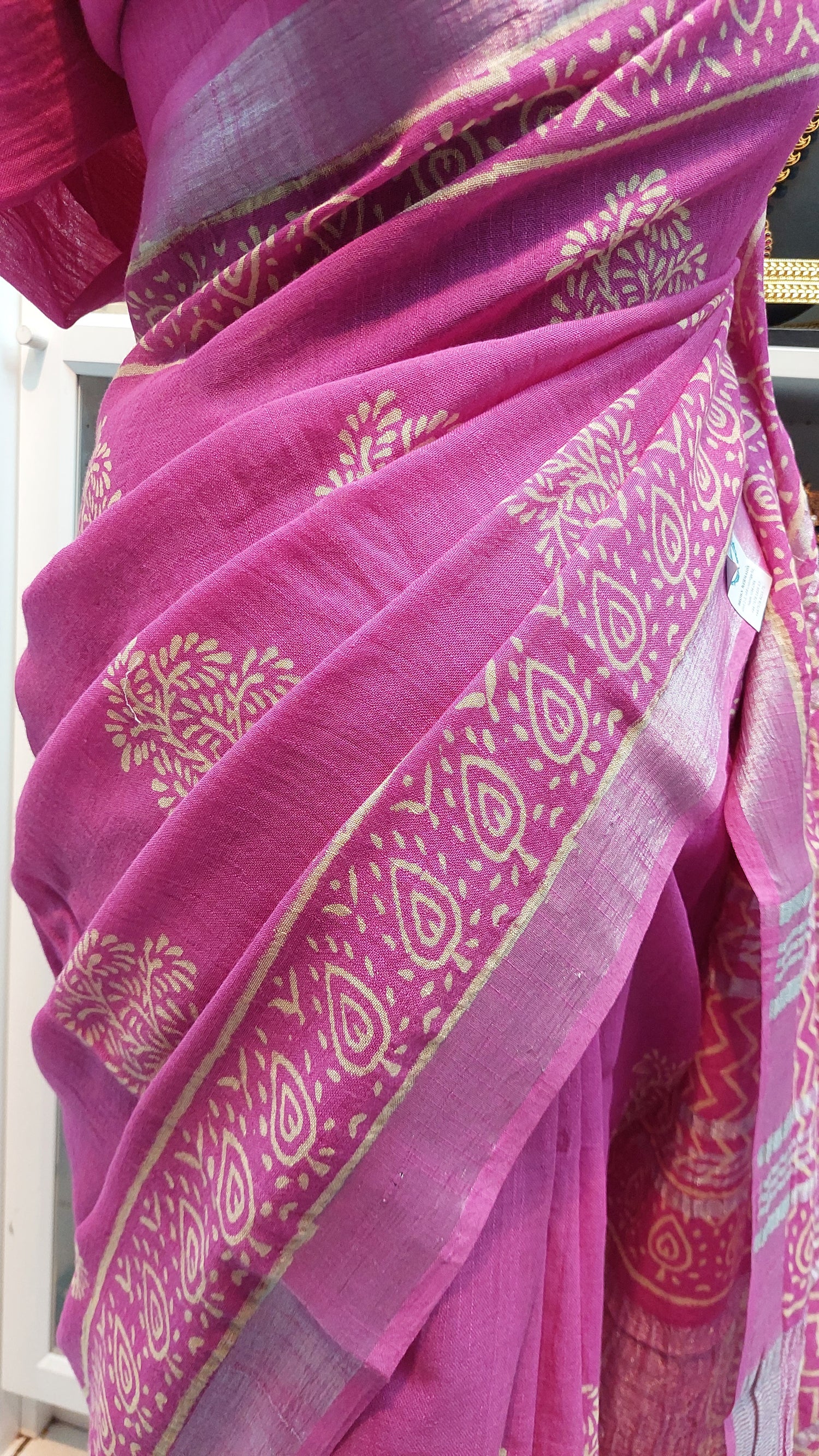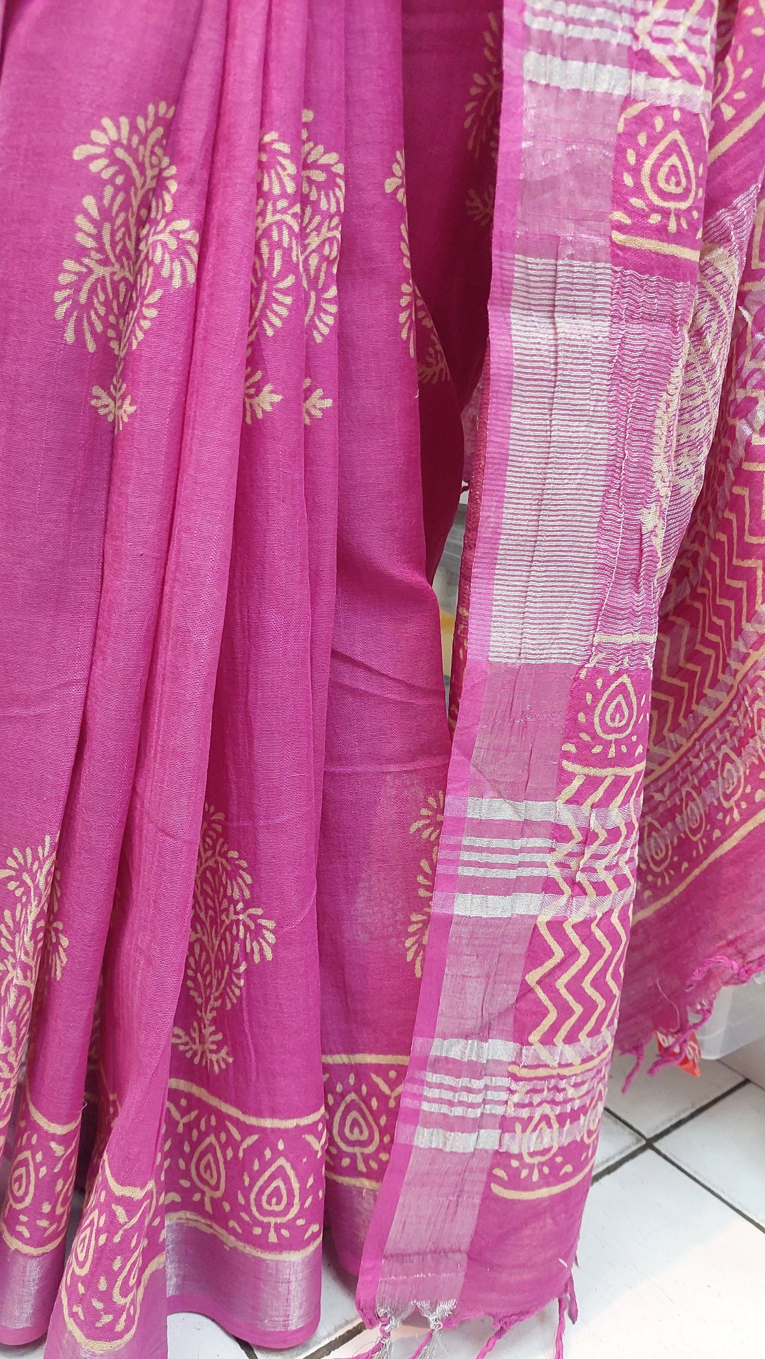 Soft linen saree with silver zari border. Kalamkari print.