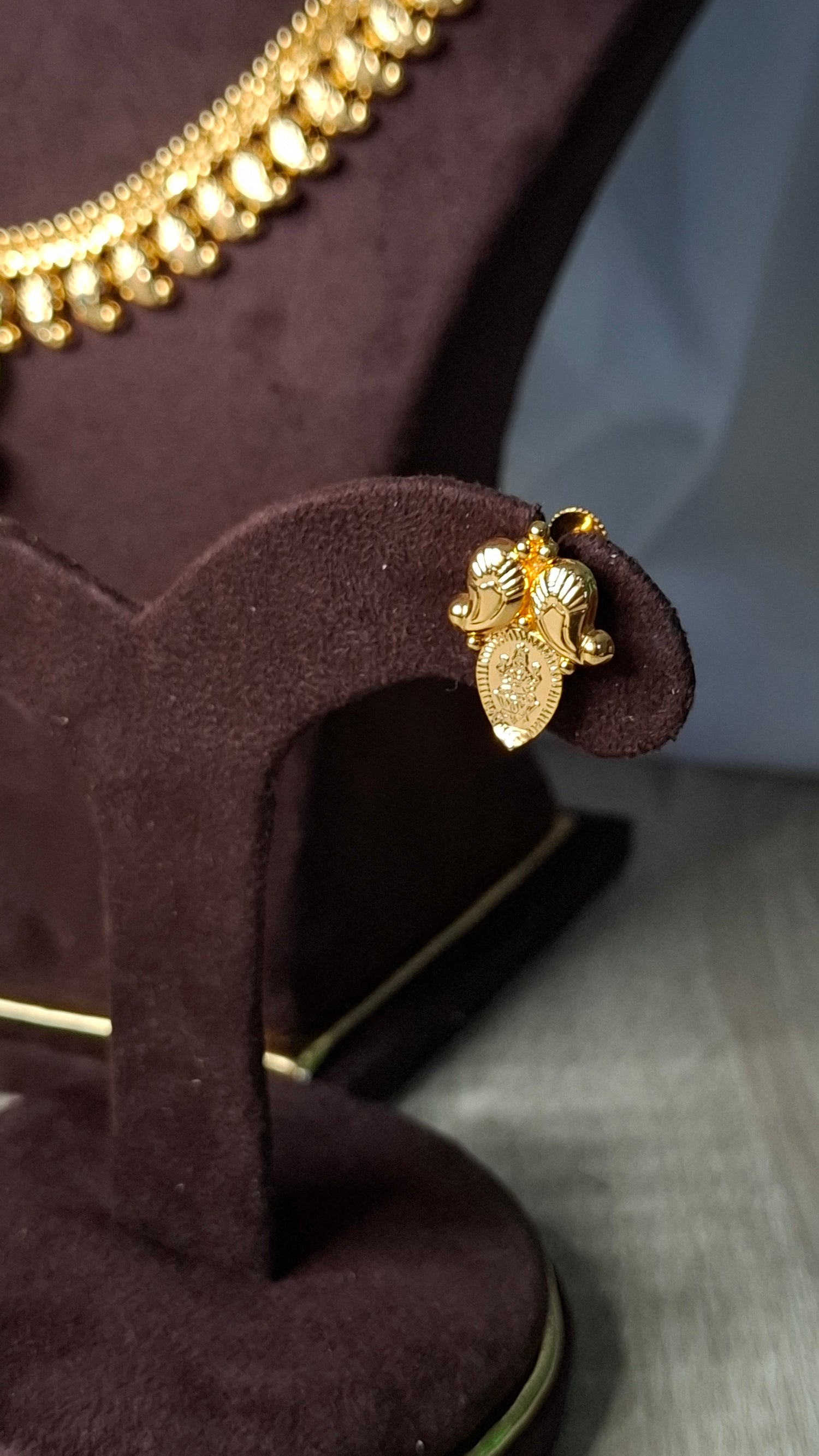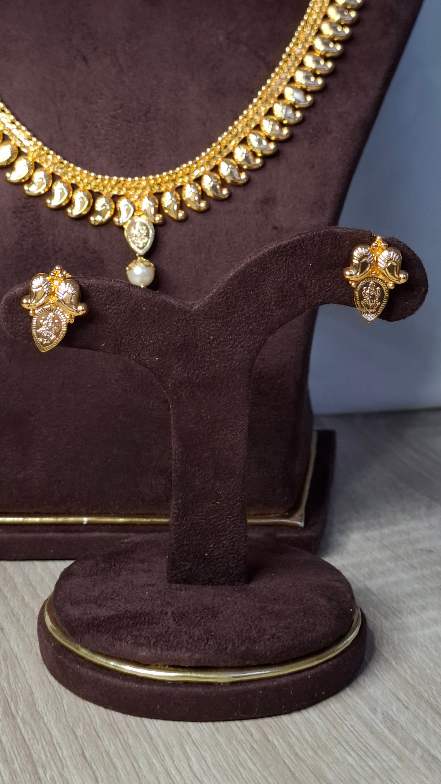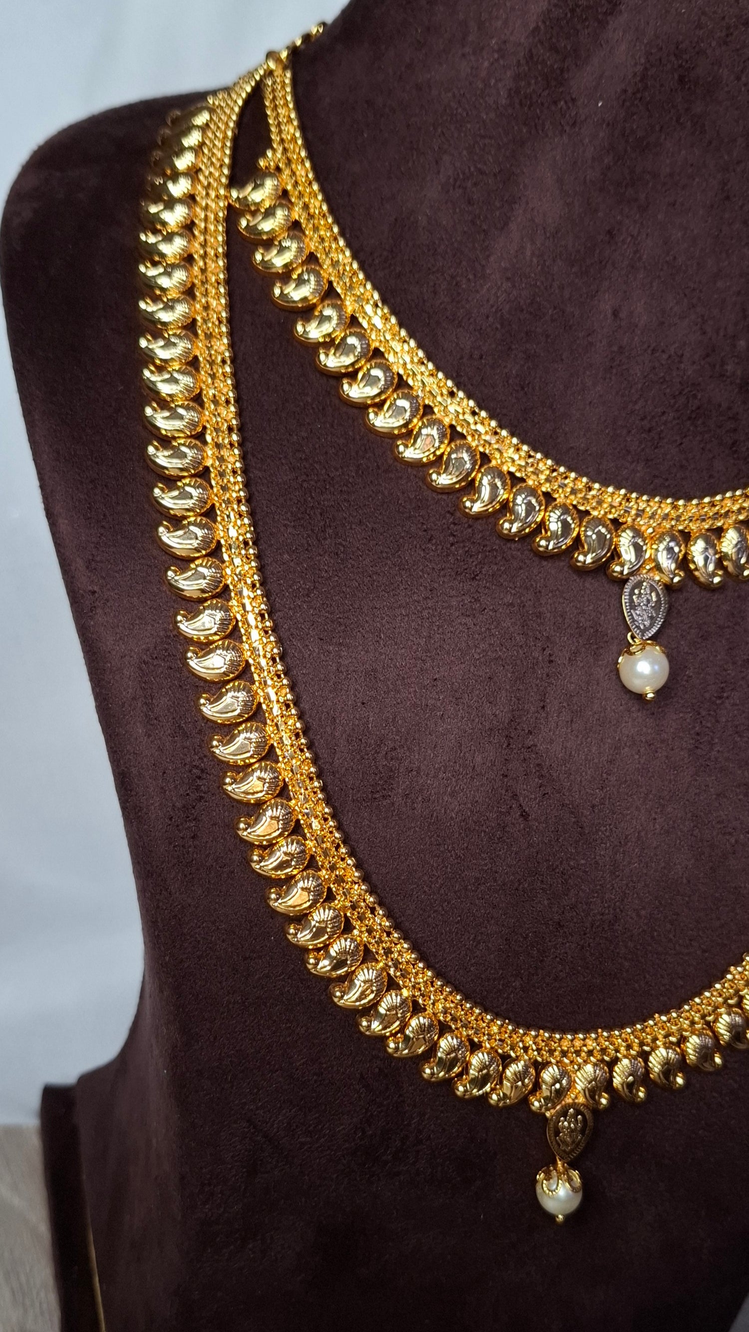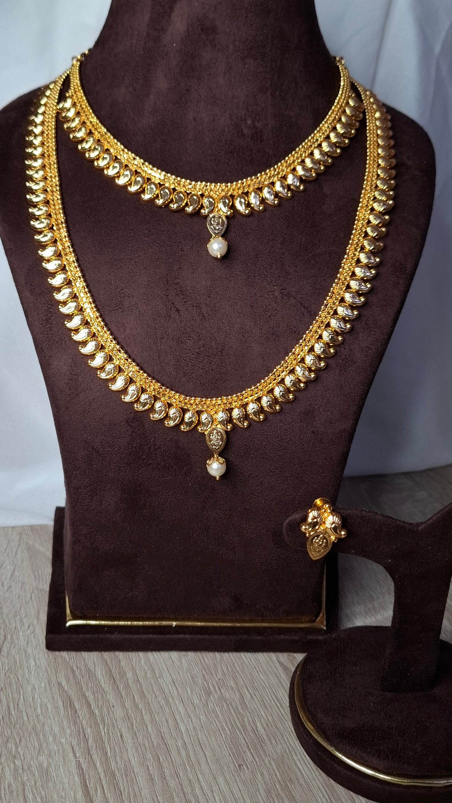 Includes long necklace, short necklace and matching earrings.