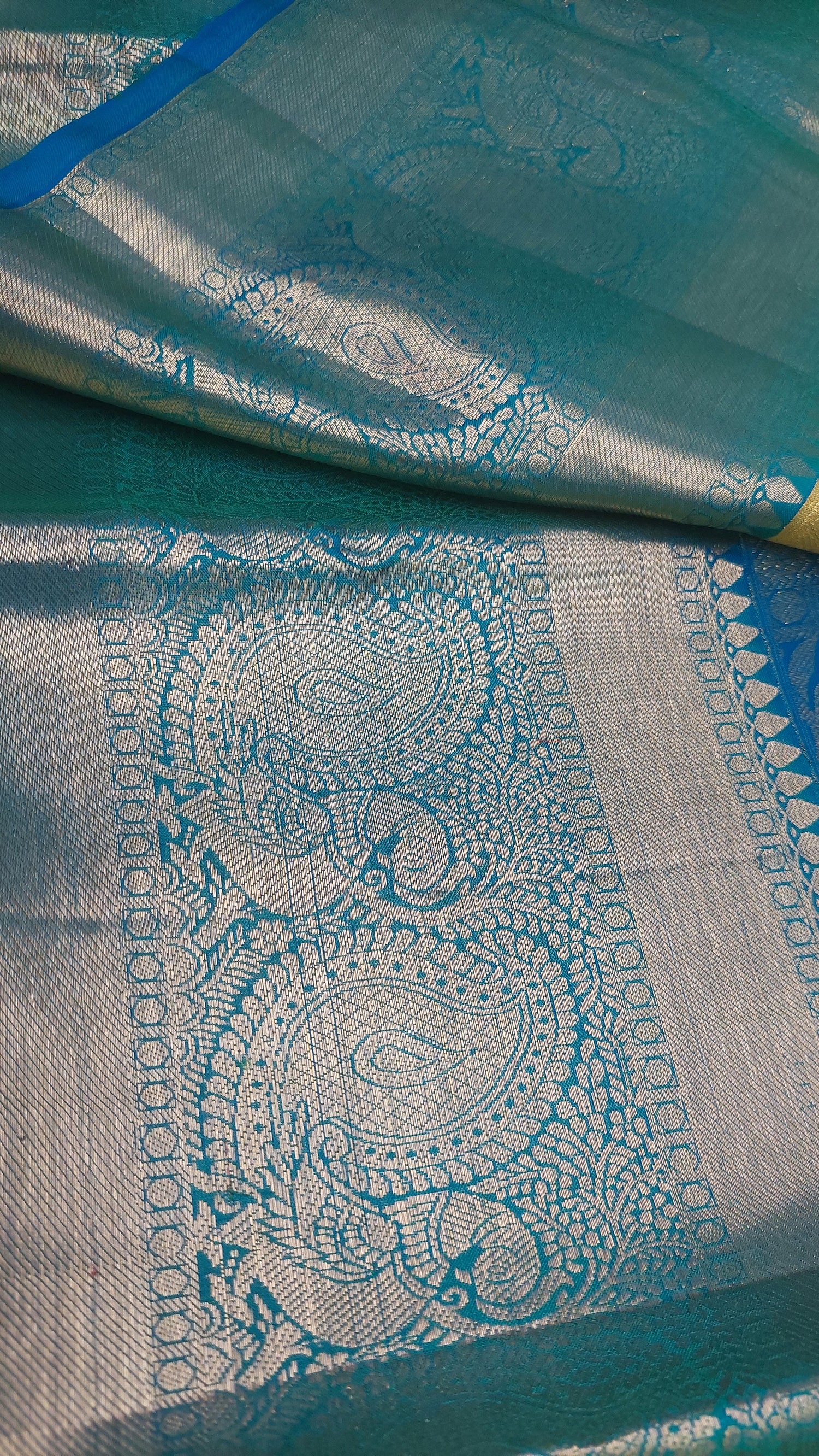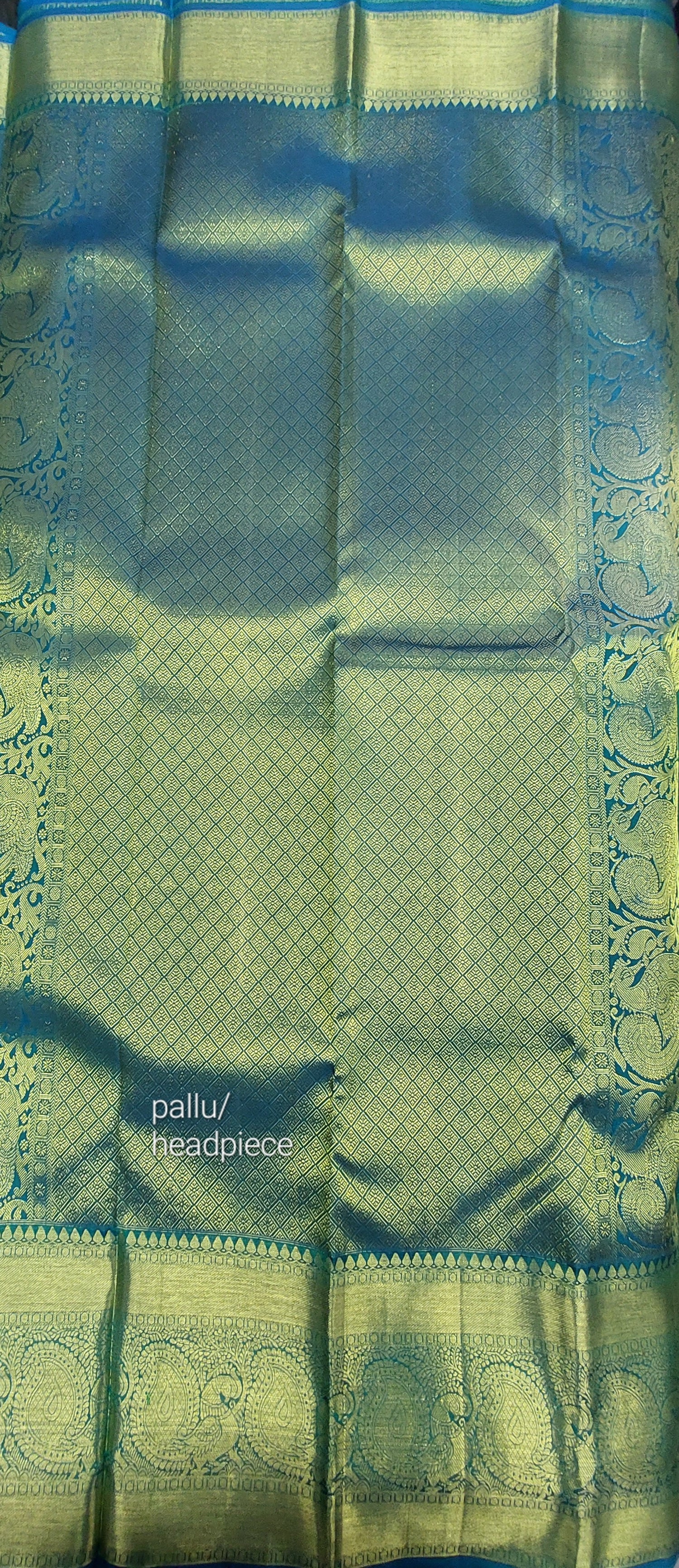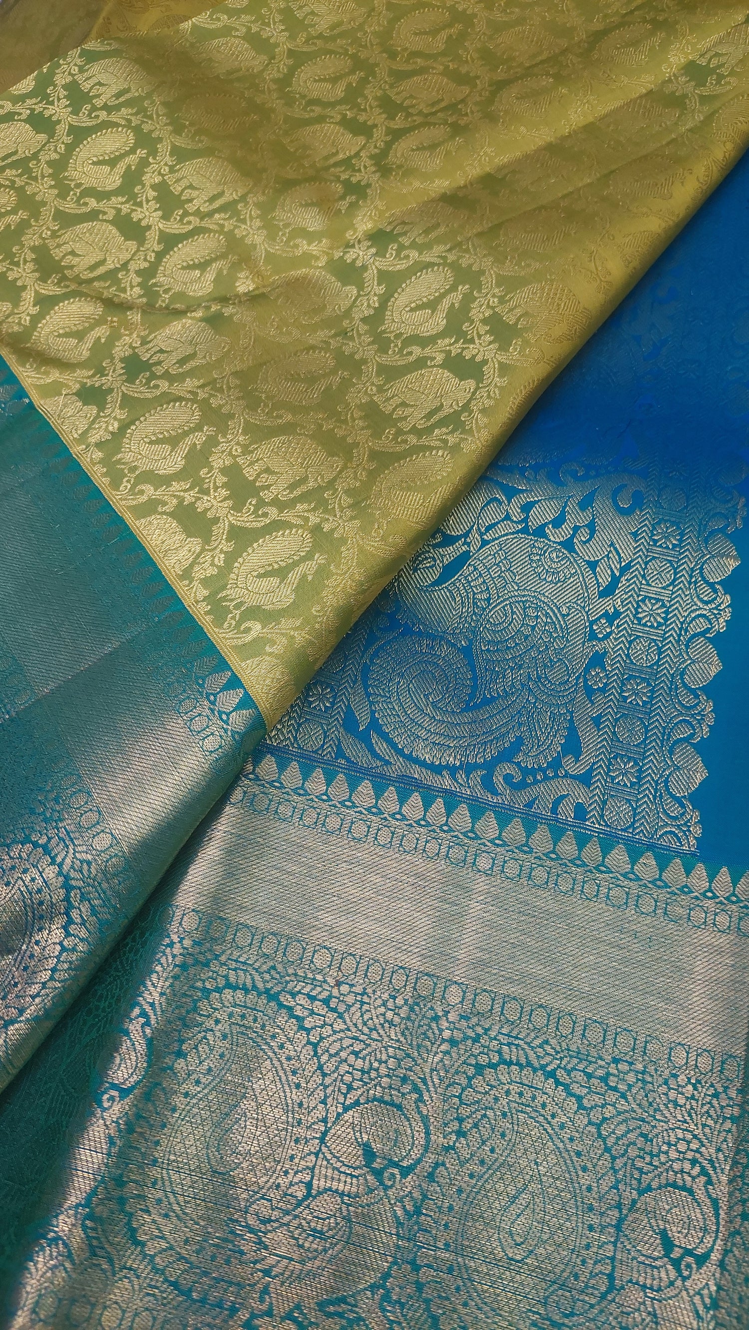 Beautiful double tone olive green pure Kanjipuram Silk saree with contrasting blue pallu/ headpiece. Running blue blouse with border.