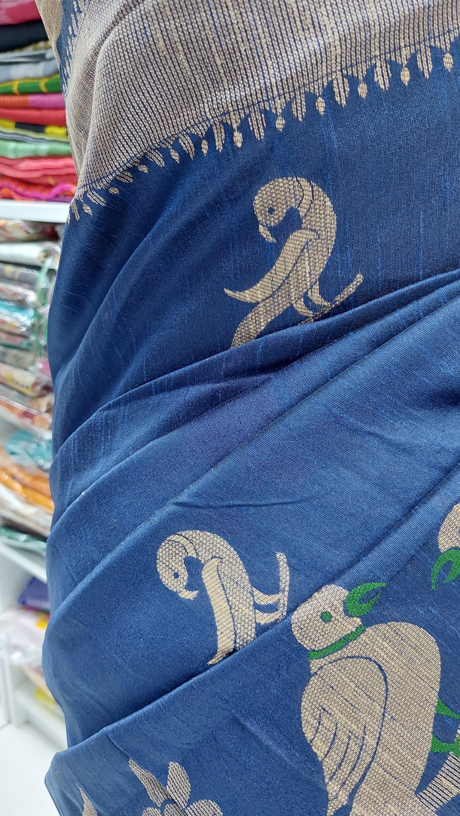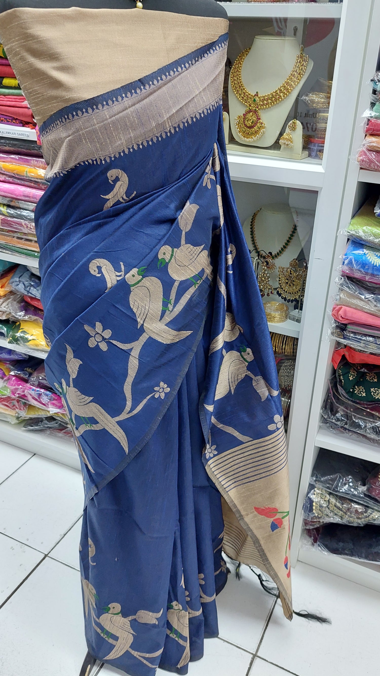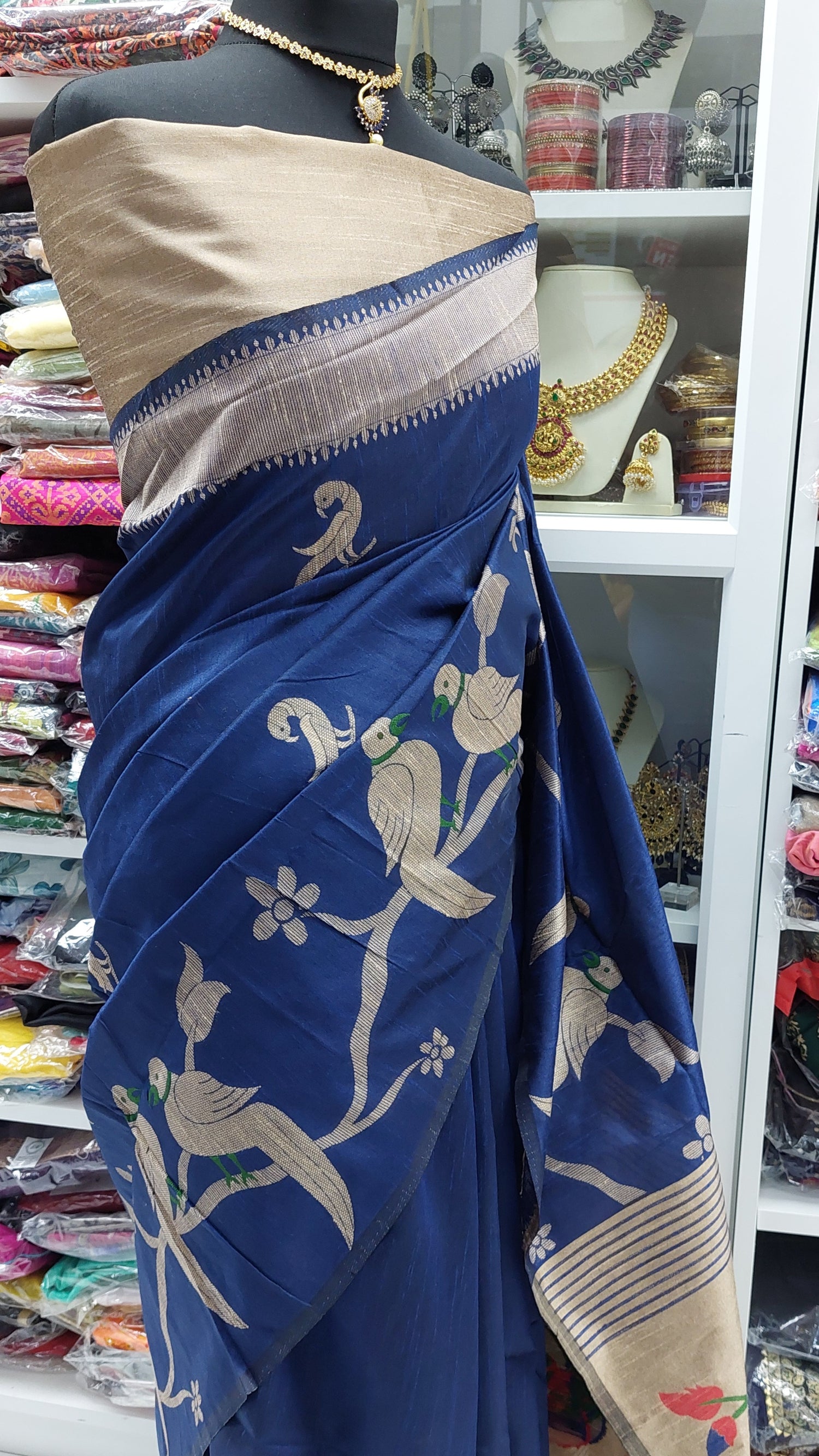 Blue linen cotton saree with parrot embroidery throughout the body. Large parrots in contrasting pallu/headpiece. Contrasting blouse piece.
