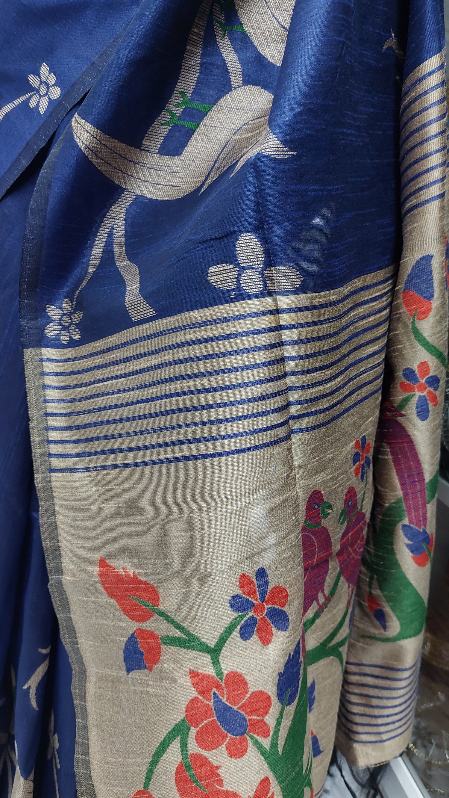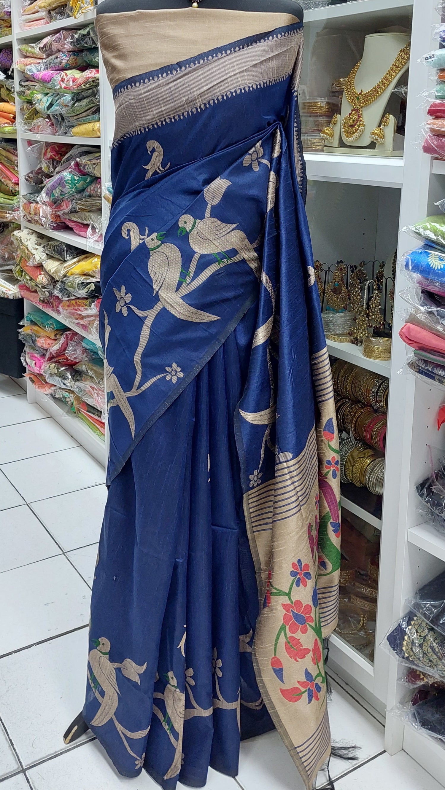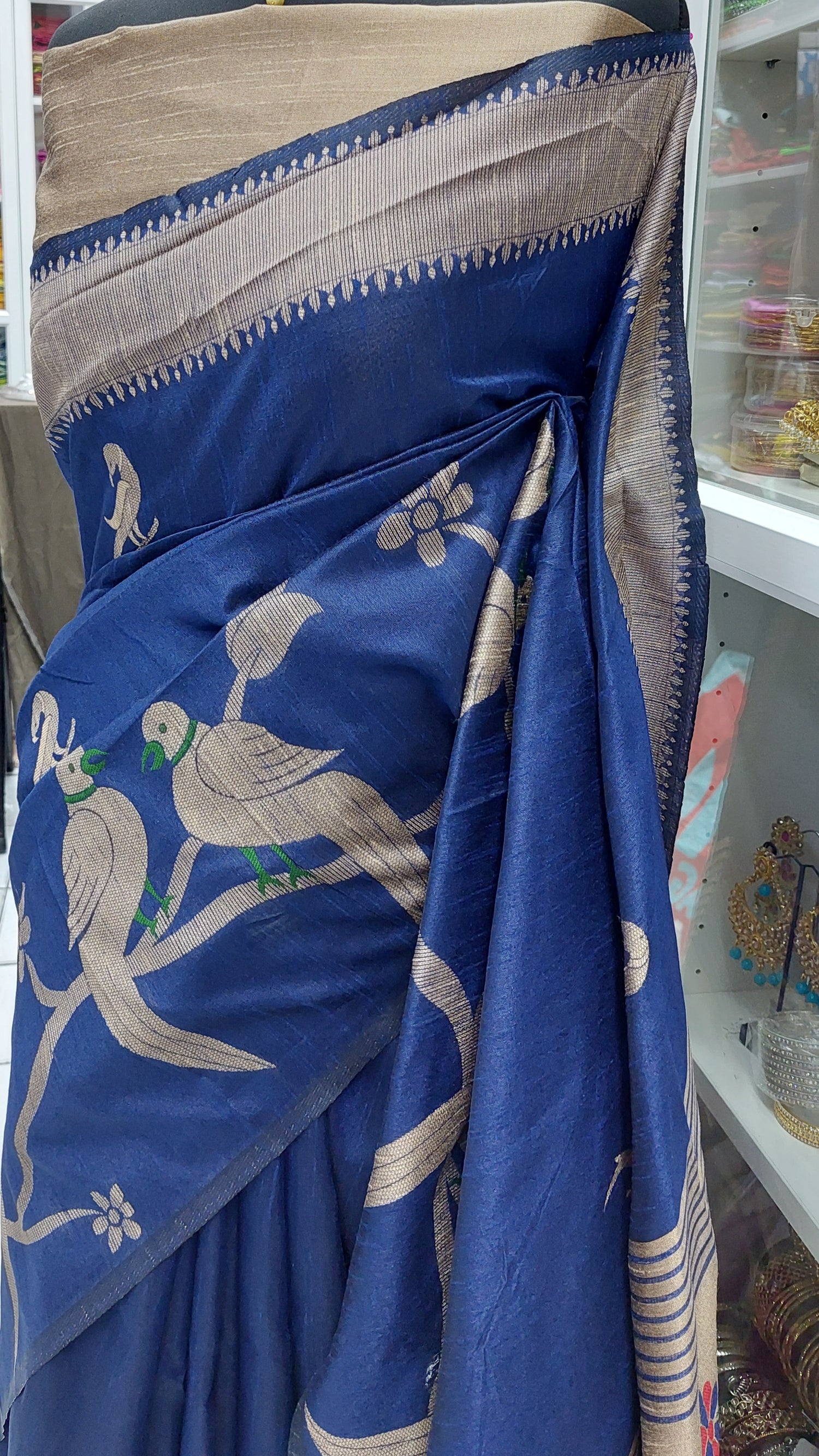 Blue linen cotton saree with parrot embroidery throughout the body. Large parrots in contrasting pallu/headpiece. Contrasting blouse piece.