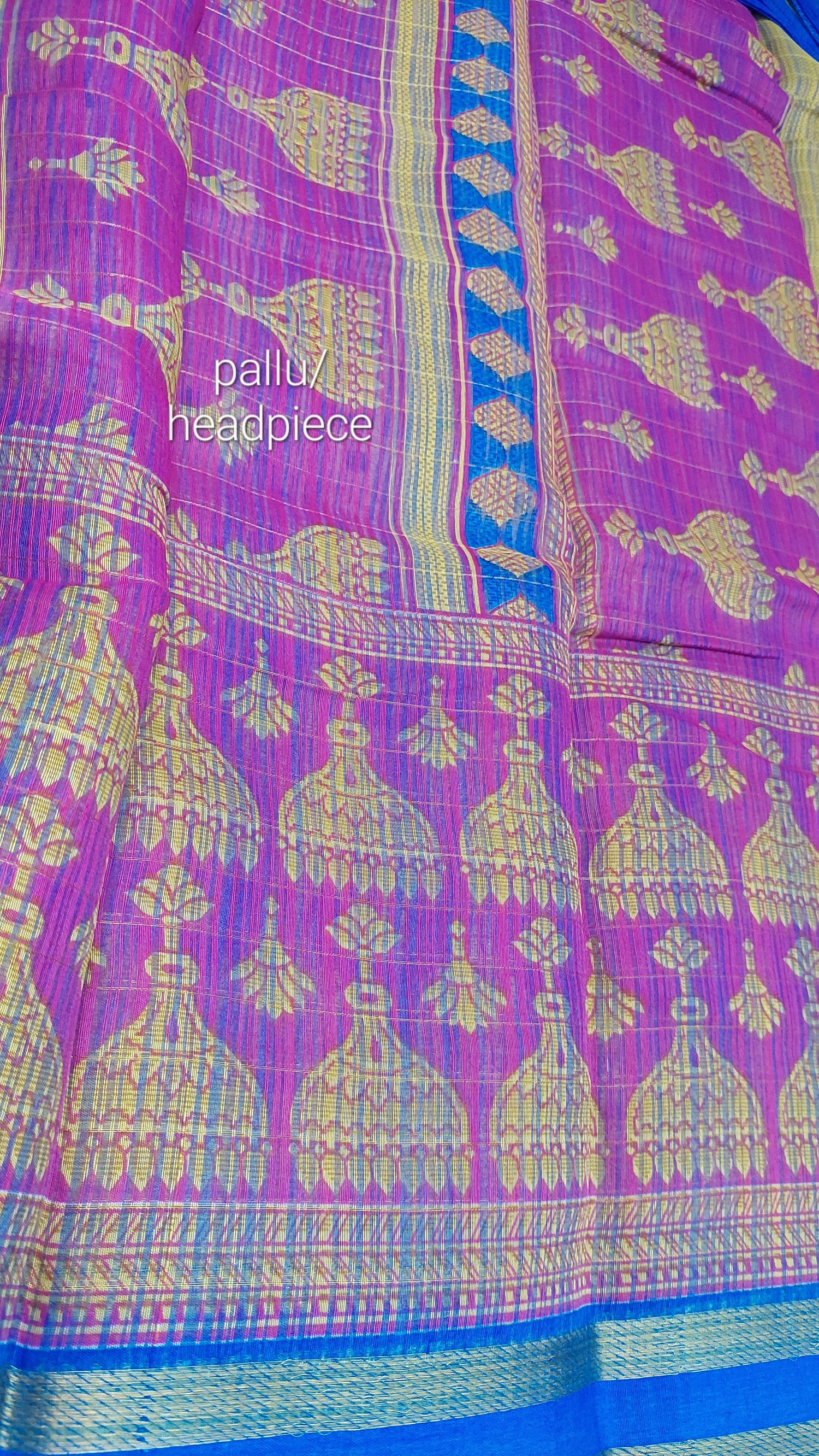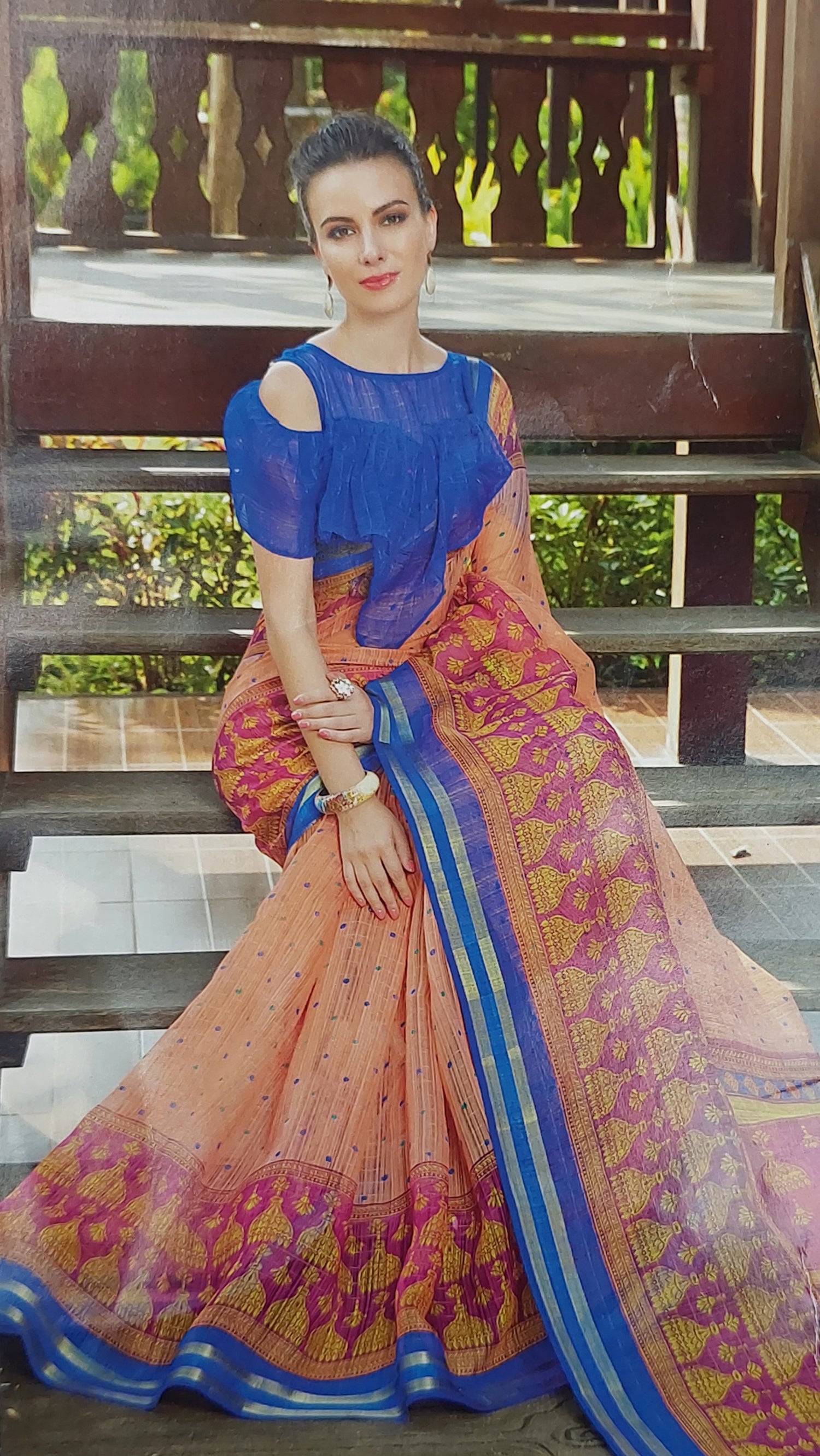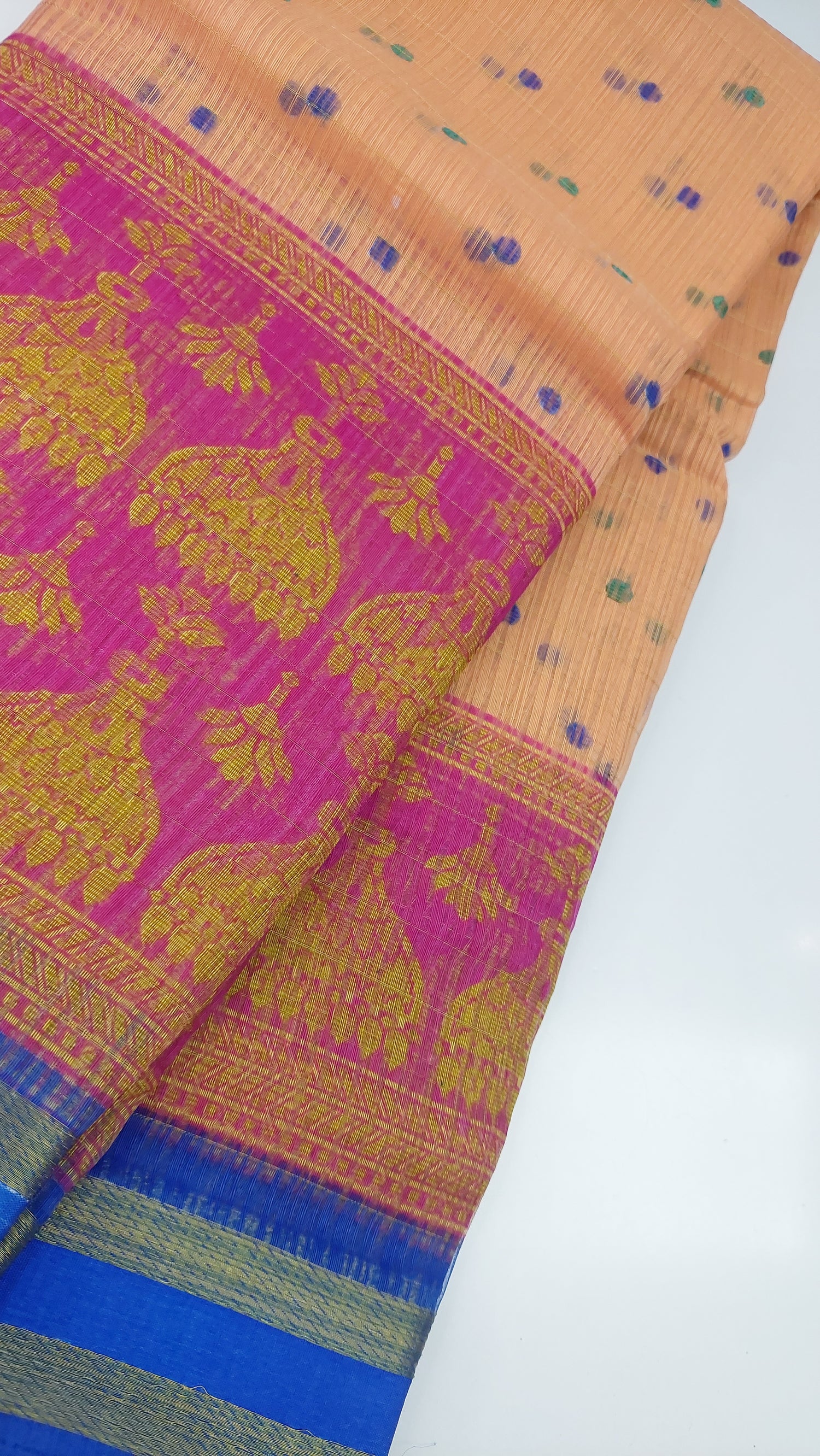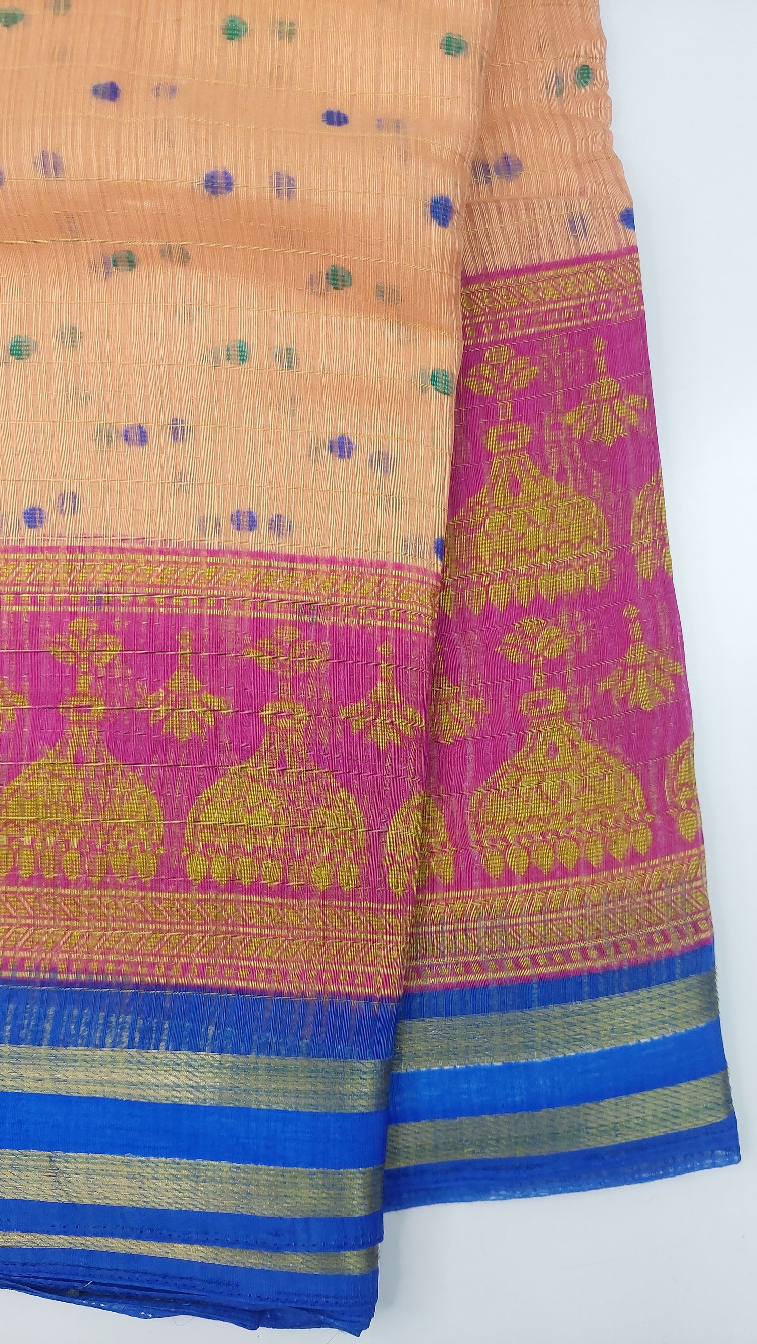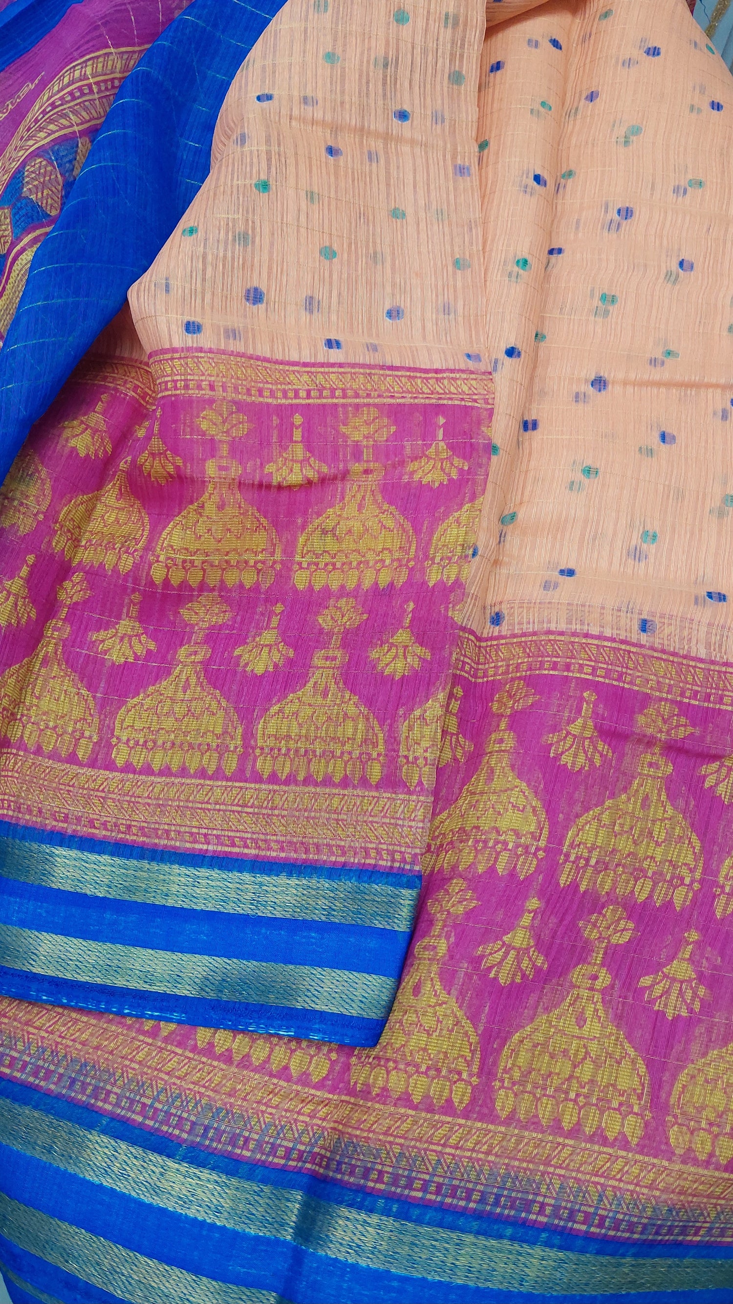 Peach designer cotton saree, with polka dots design. Blue and gold zari border. Contrasting plain running blur with border for the blouse.