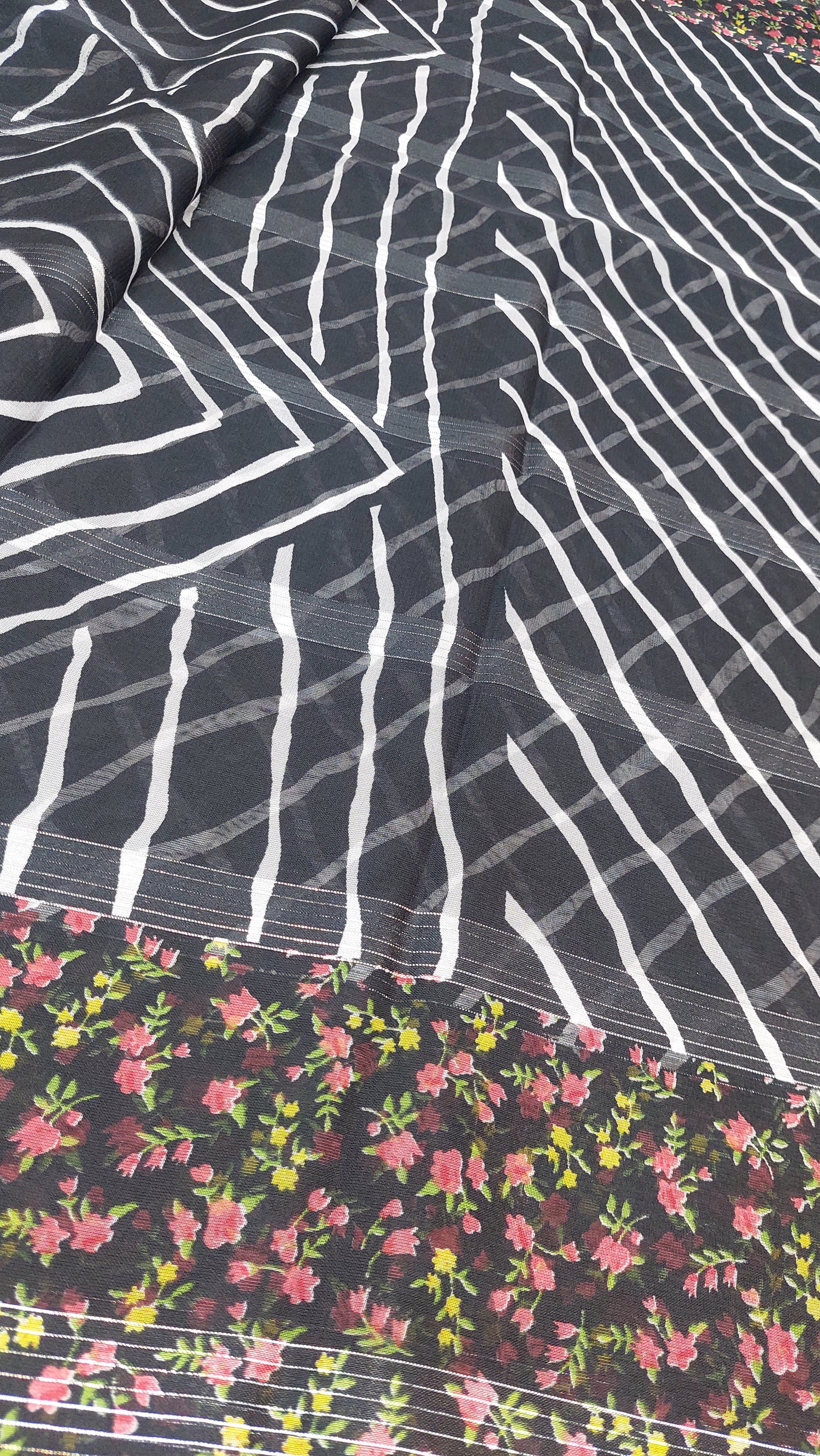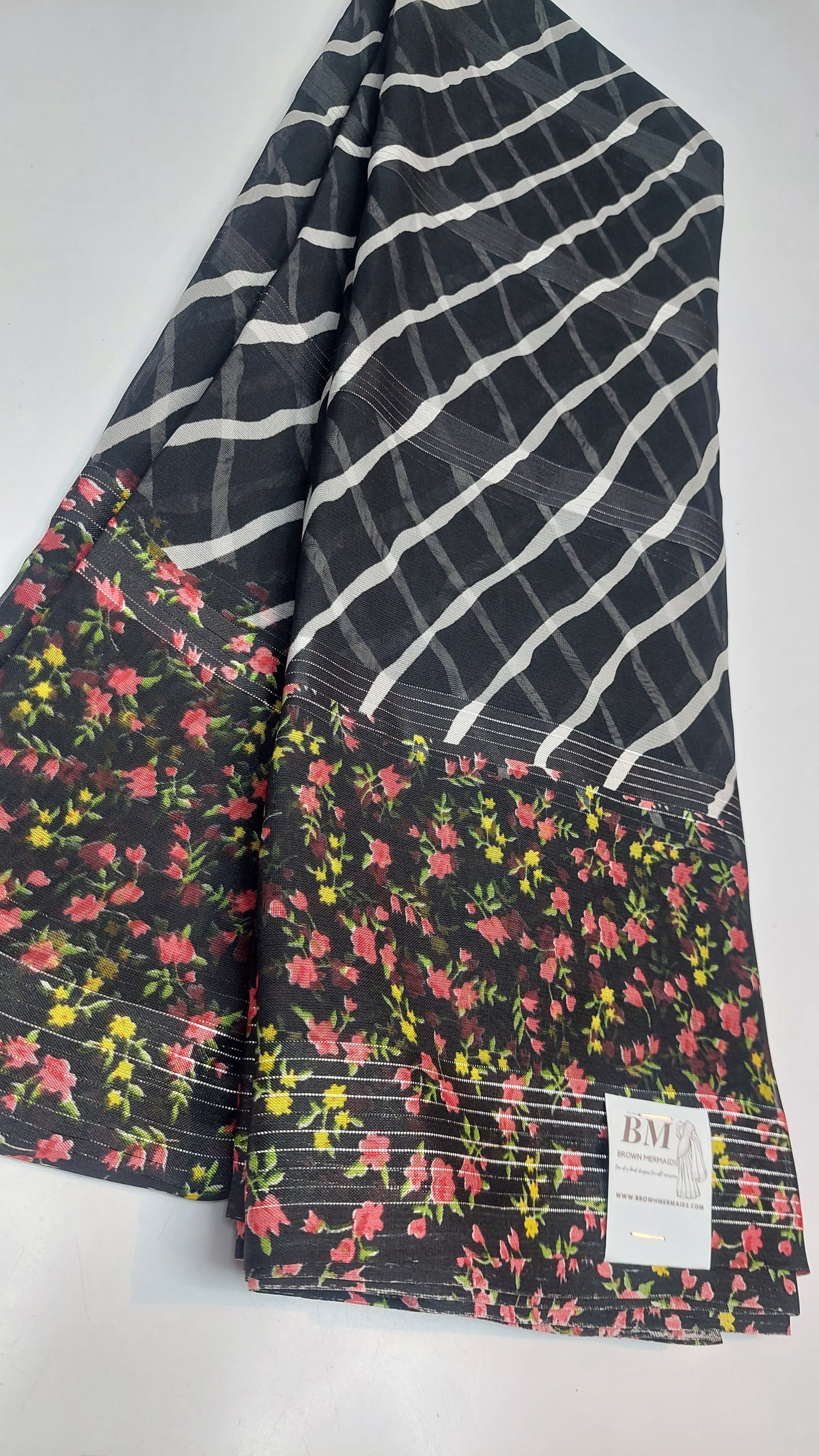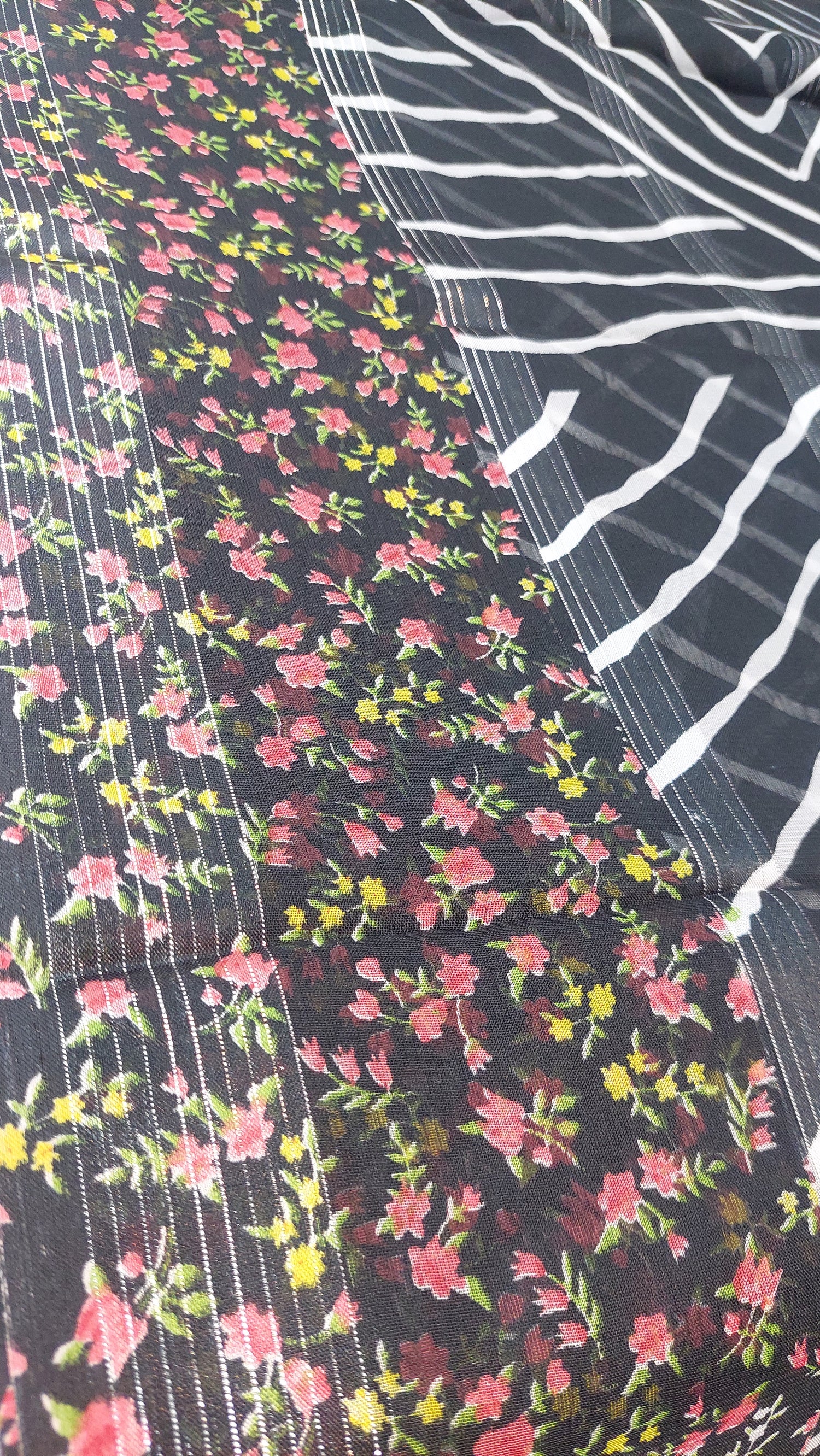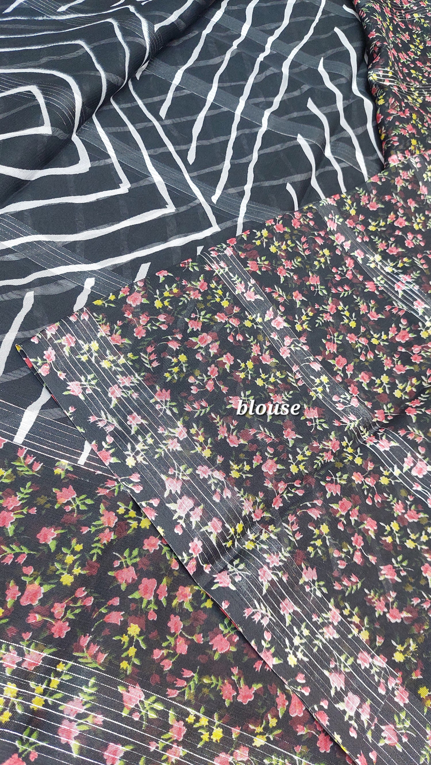 Light weight black georgette saree with floral border. Contrasted printed floral running blouse.