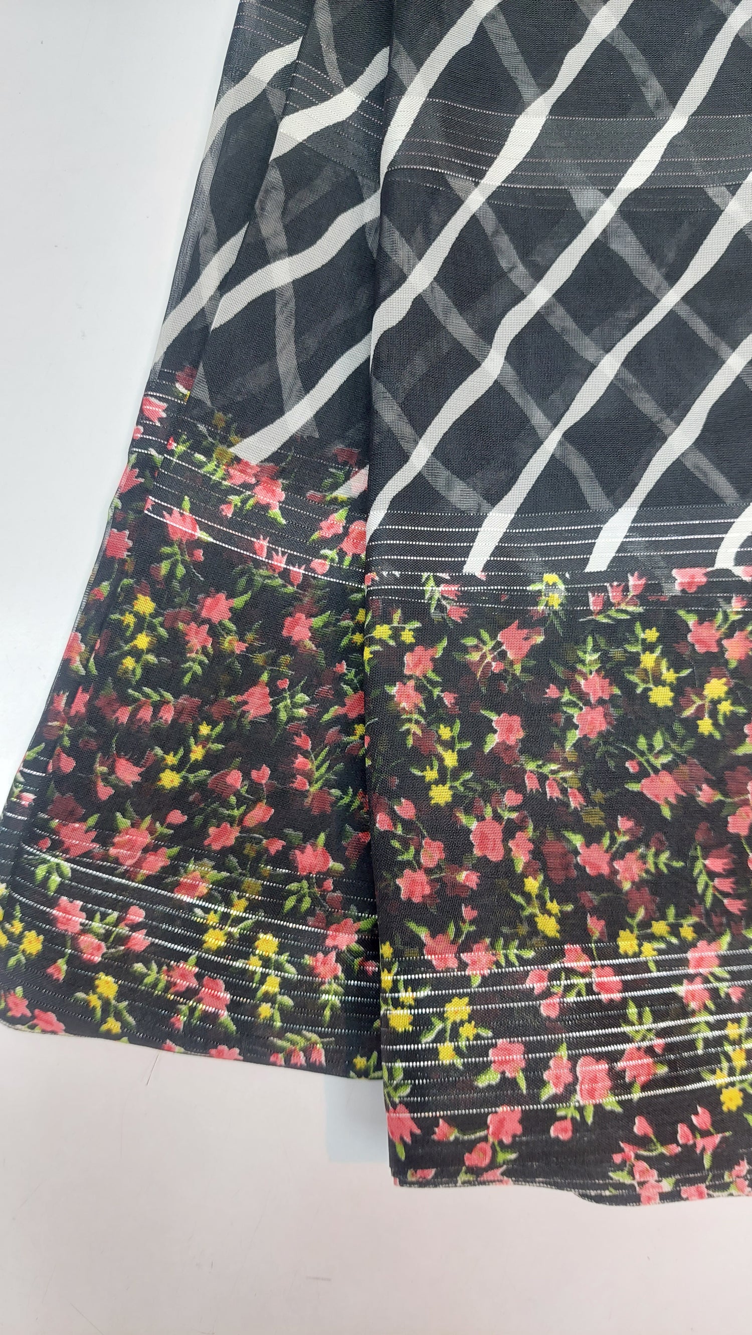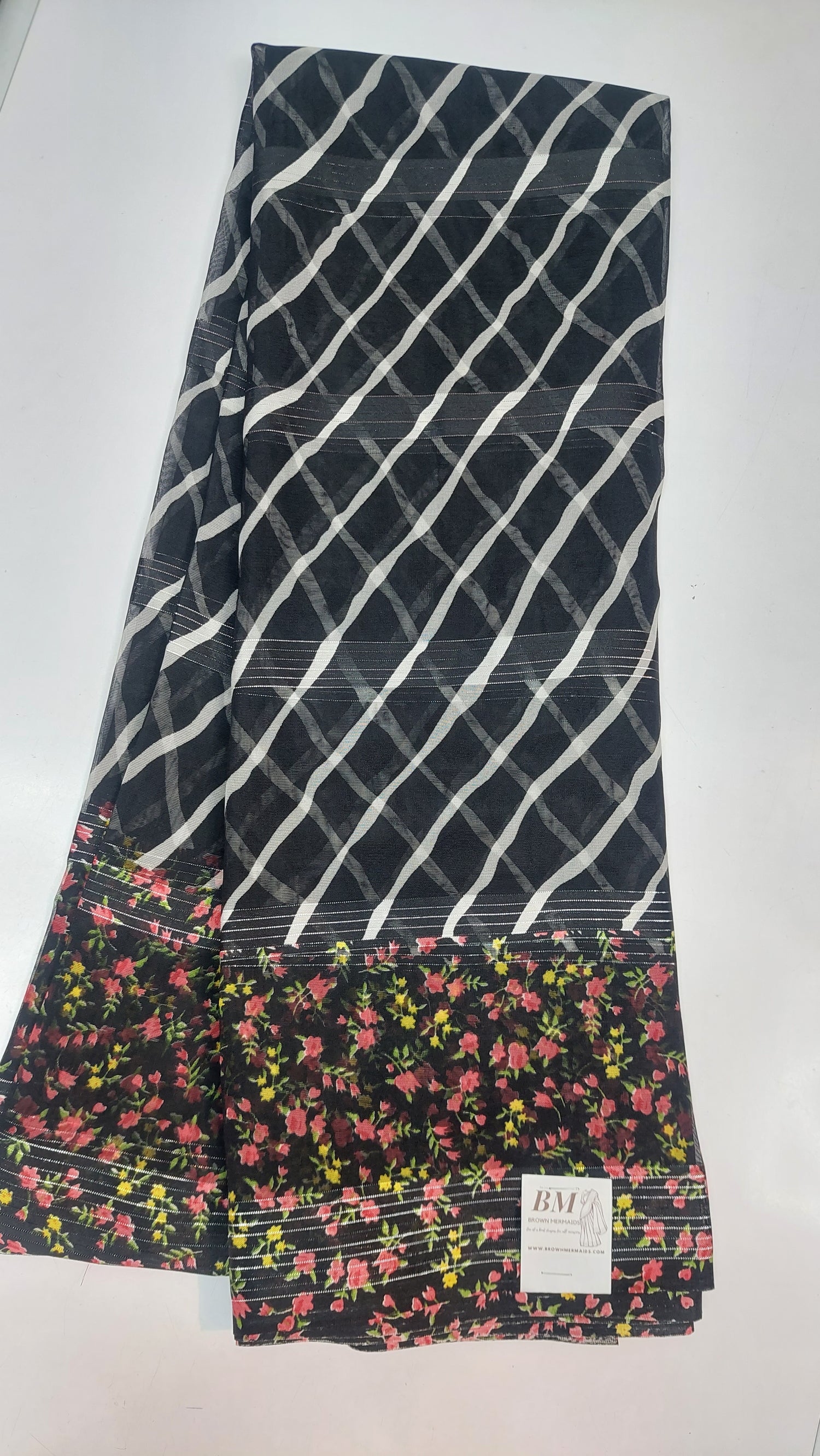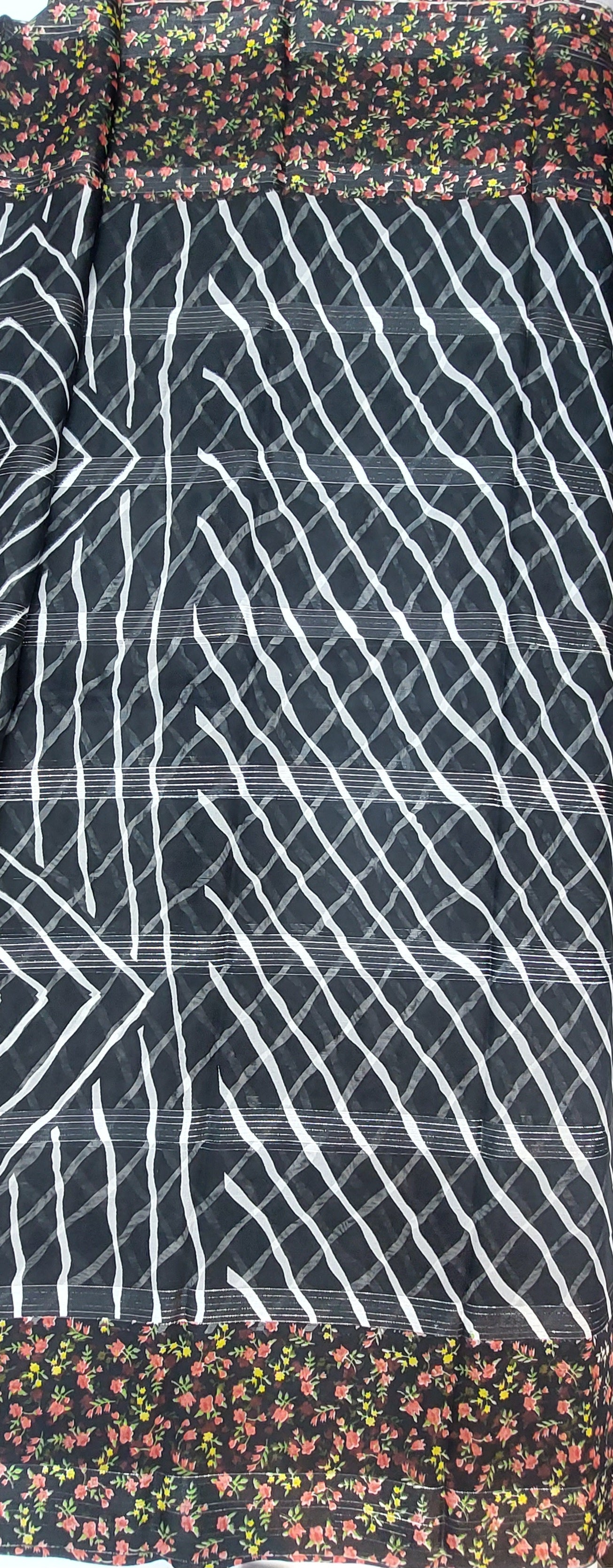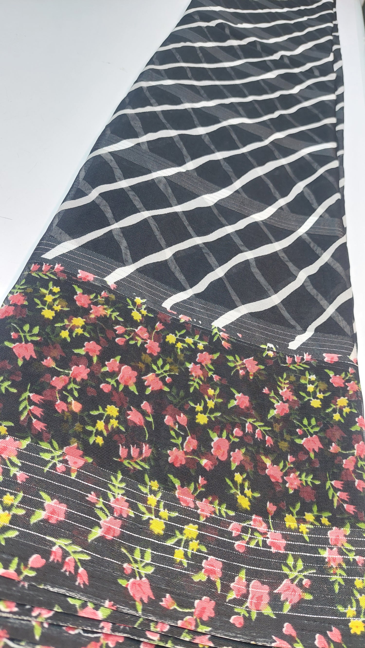 Light weight black georgette saree with floral border. Contrasted printed floral running blouse.