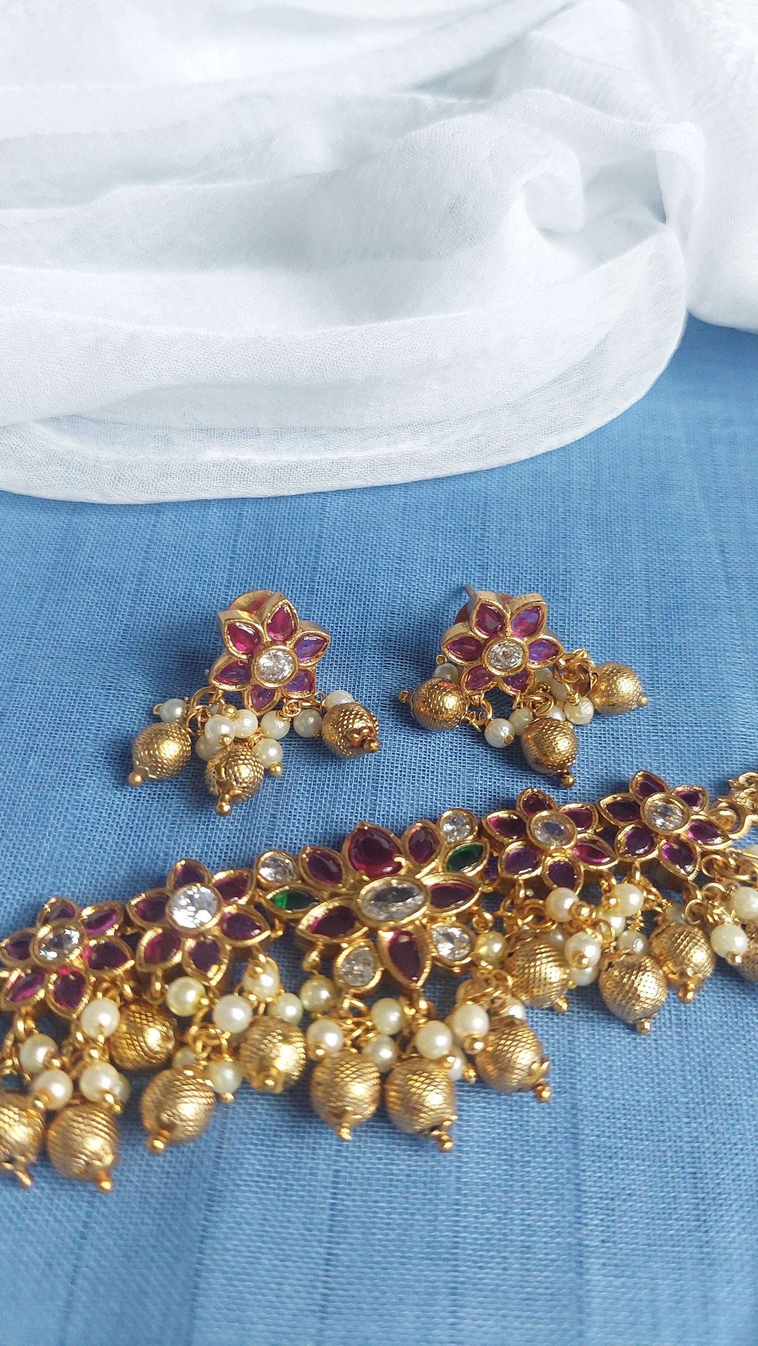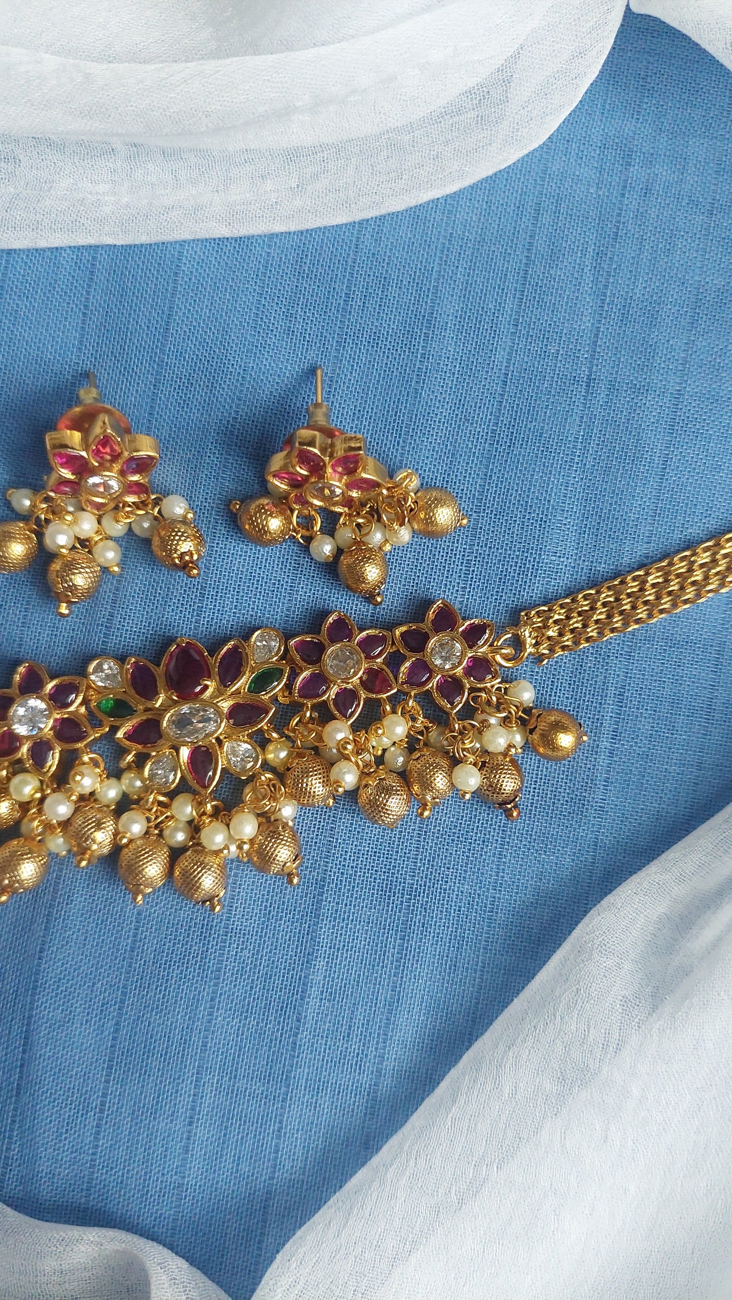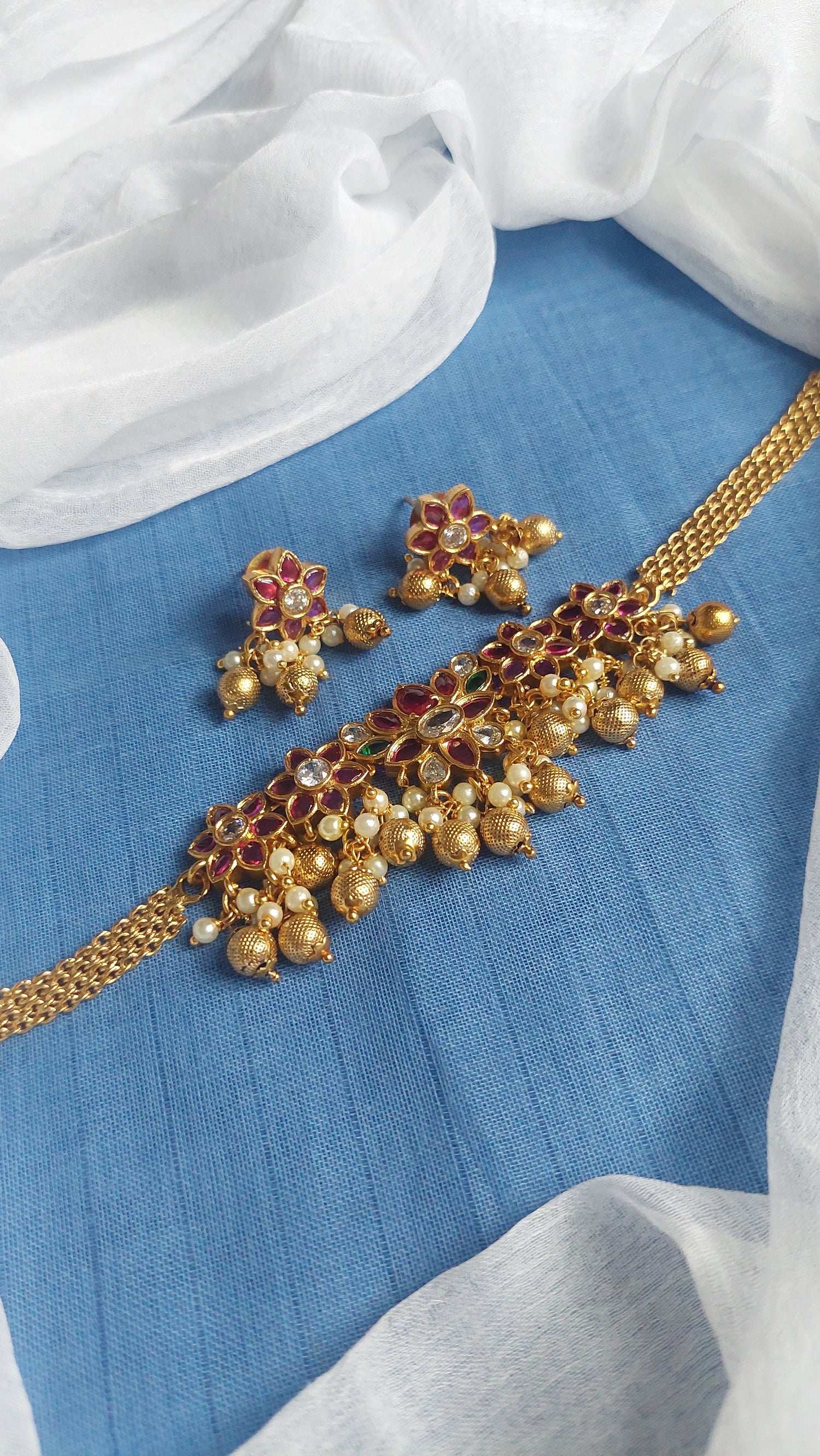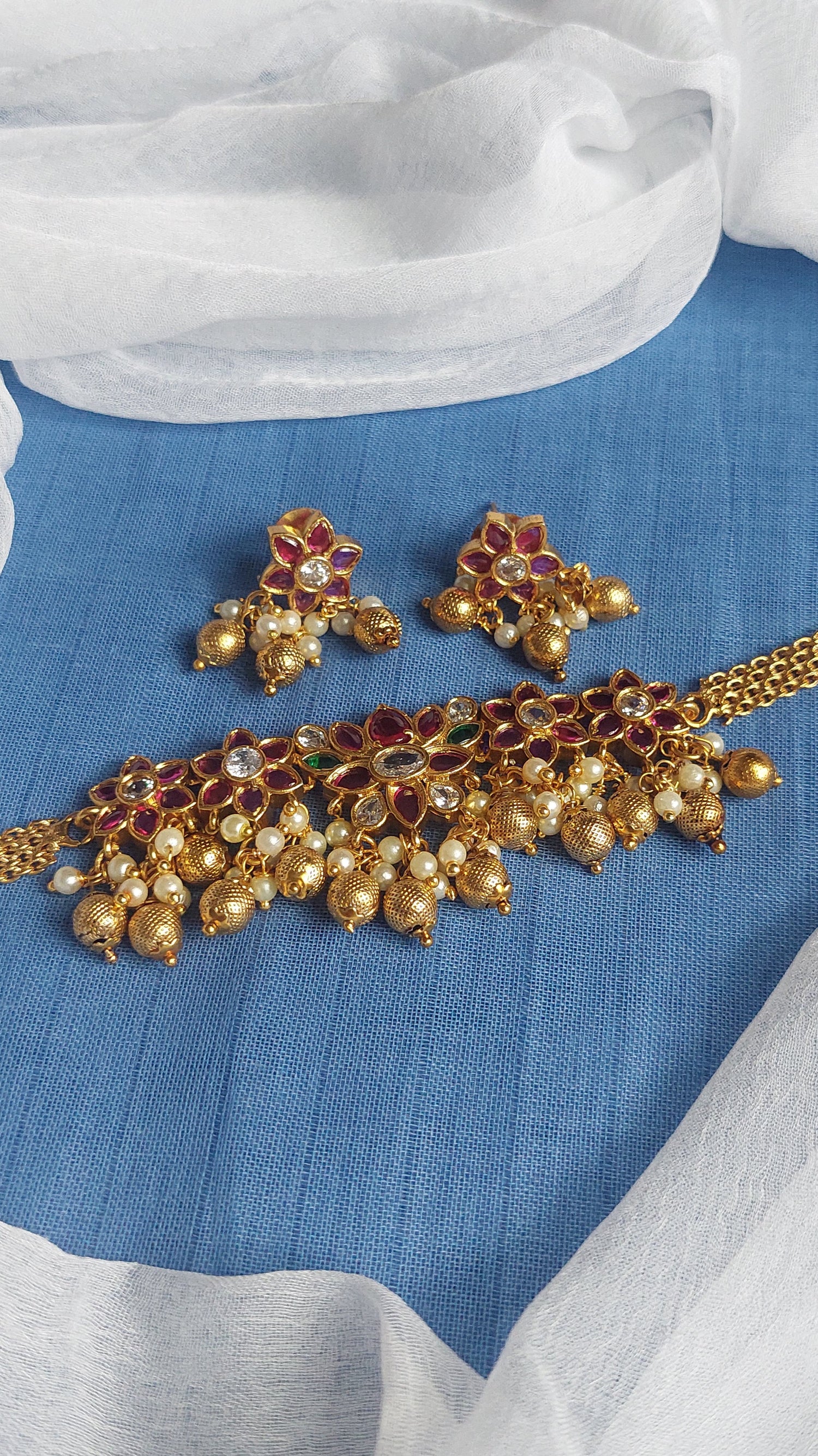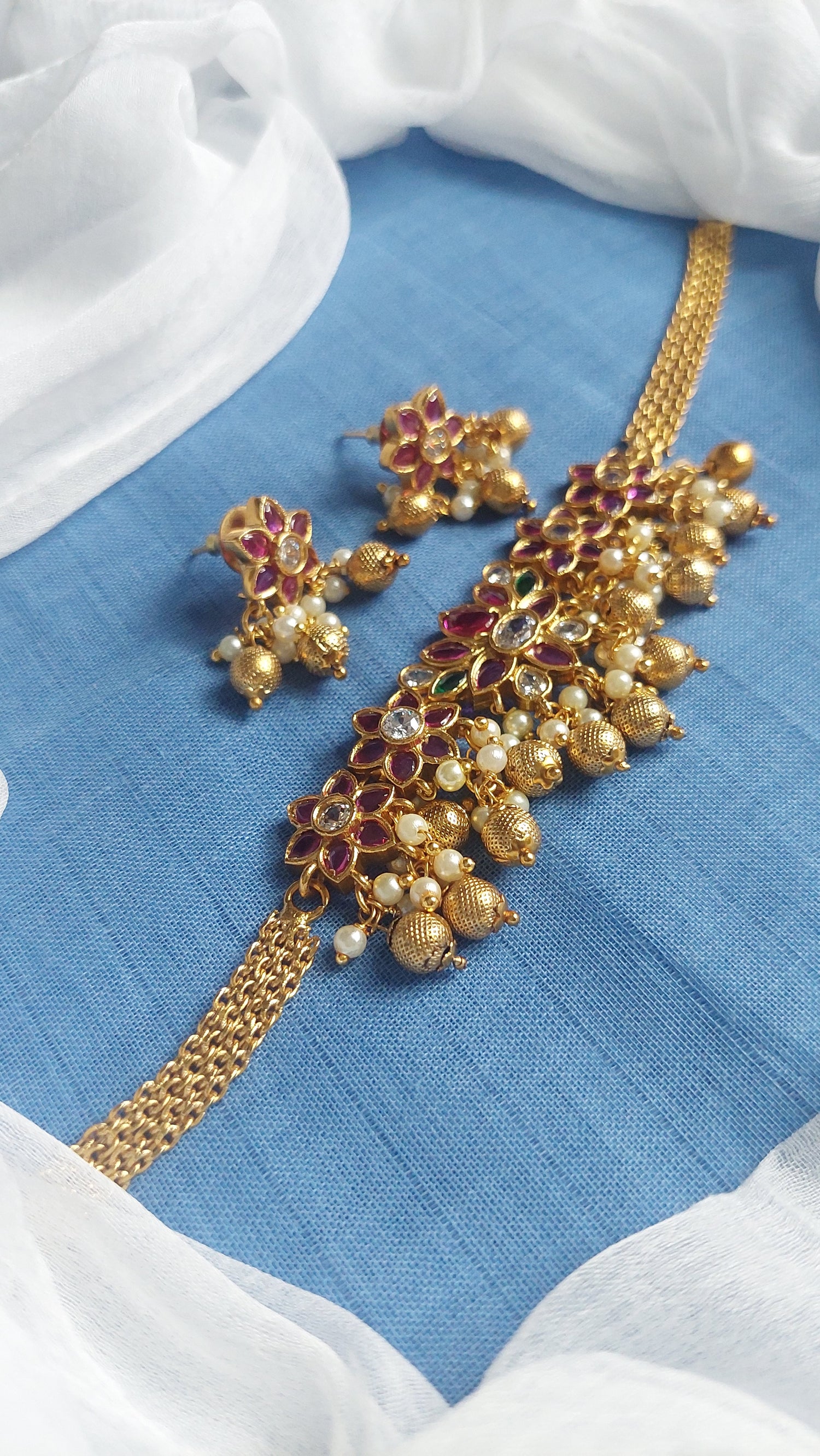 Antique gold matte finish chocker style necklace with floral design. Comes with matching earrings.